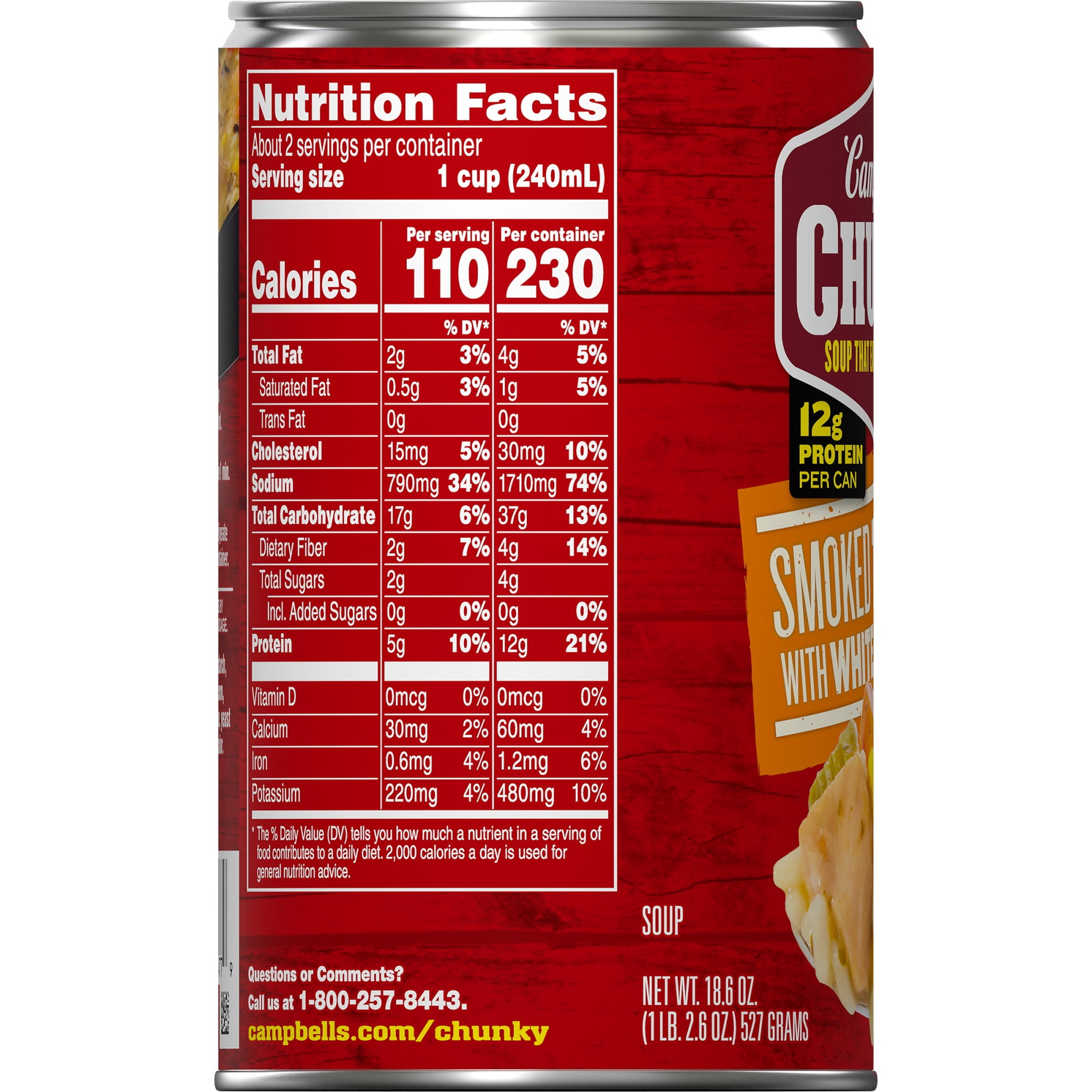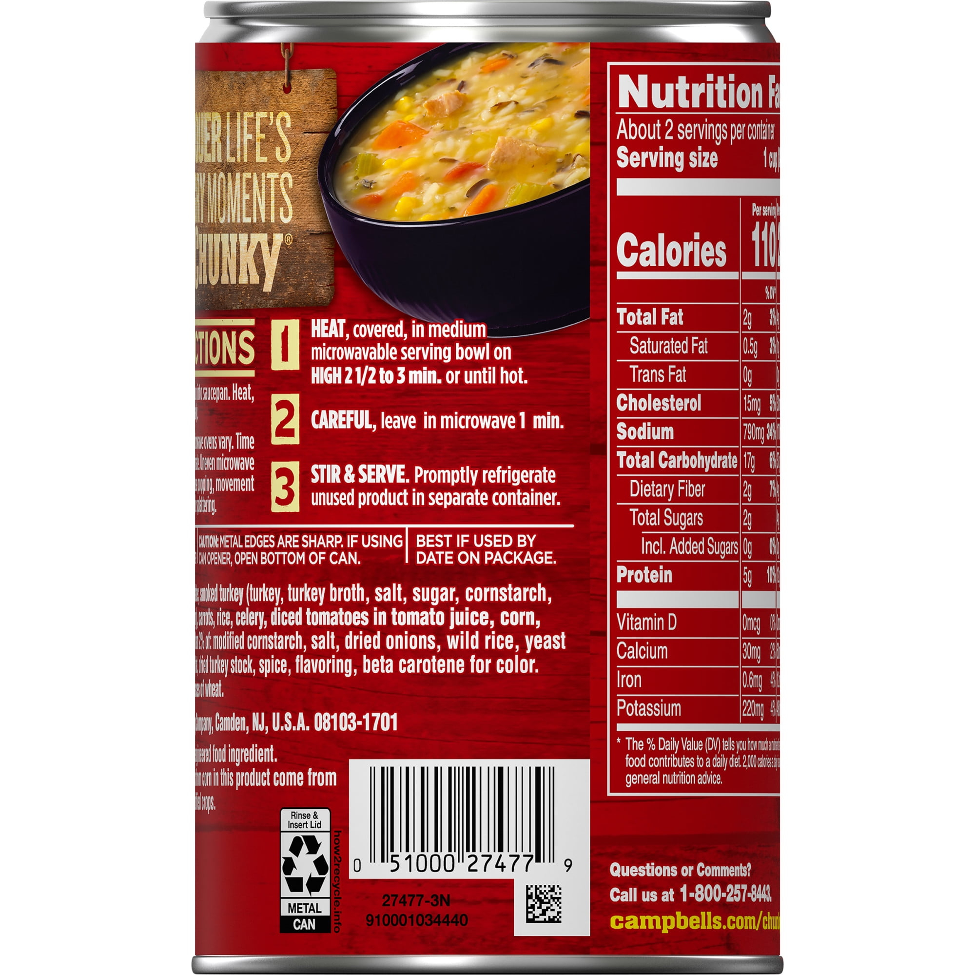 Campbell’s Chunky Smoked Turkey with White and Wild Rice Soup isn’t just tasty-it’s made to work as hard as you do. With never-ending big flavors and bold ingredients, this canned soup is capable of fueling even the heartiest appetite. This ready-to-eat soup is bursting with satisfying spoonfuls of quality smoked turkey, carrots, celery, and white and wild rice. Each can has 12 grams of protein. It Fills You Up Right. Just pop this ready-to-serve soup in a microwave-safe bowl, heat and enjoy with your favorite sides. Or, warm it over the campfire on your outdoor adventures. Whether you’re looking for quick and easy to microwave soup for home or something to take on the go, Campbell’s has you covered. The soup can is recyclable for easy disposal. Take on the great outdoors with Campbell’s Chunky Smoked Turkey With White and Wild Rice Soup-Soup That Eats Like a Meal. In addition to Smoked Turkey with White and Wild Rice Soup, Campbell’s Chunky Soup is also available in Beef and Barley, Classic Chicken Noodle and more.