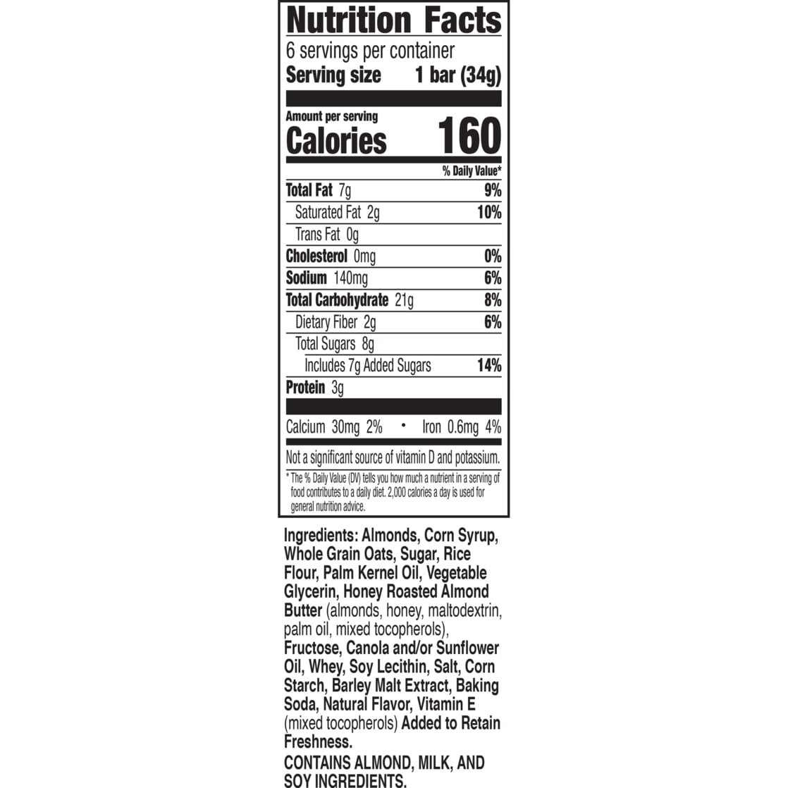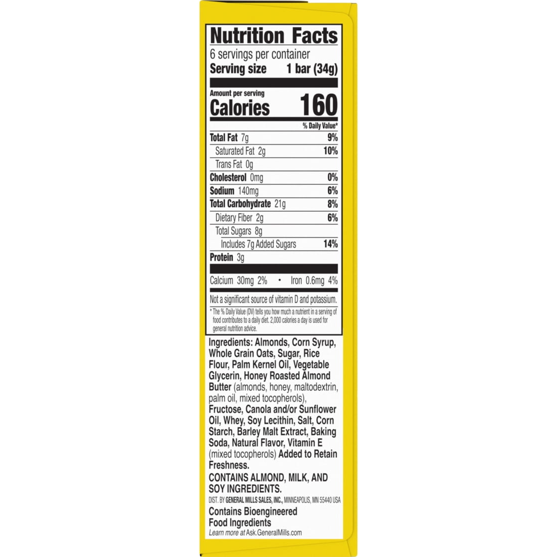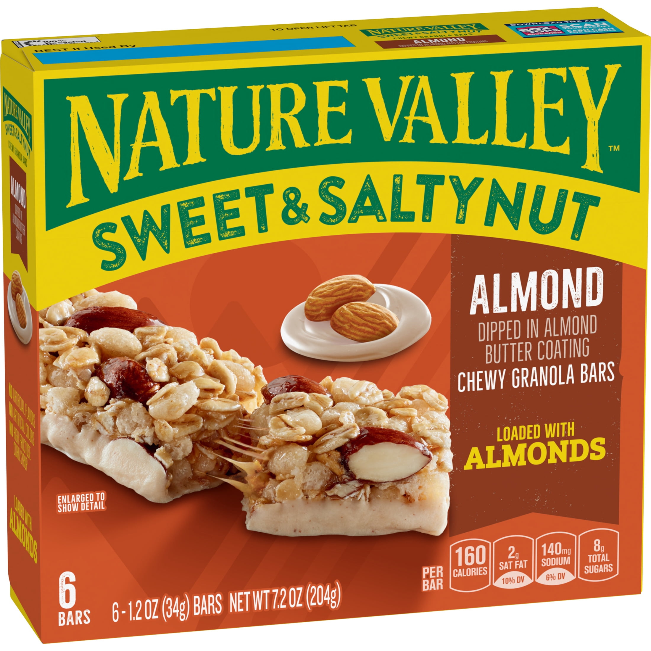 Sweet. Salty. Adventure-ready. Nature Valley Almond Sweet and Salty Nut Granola Bars are positively bursting with savory almonds and sweet granola. Dipped in a delicious almond butter coating, this portable snack is perfect for the pantry, lunch box, and hiking trail. These bars contain no artificial flavors, artificial colors, or high fructose corn syrup. Stock up for a breakfast snack bar, an office snack, or an on the go treat everyone in your household can enjoy. At Nature Valley, we believe that what you put in is what you get out. So wherever the moment takes you and your family, you can rely on our great-tasting snacks to help keep you going. Contains one regular cardboard box of Nature Valley Granola Bars, Sweet and Salty Nut, Almond, 6 Bars, 7.2 oz; perfect for instant snacking.