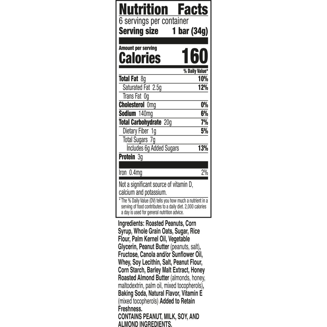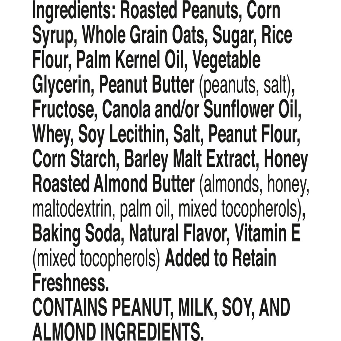 Roasted Peanuts, Corn Syrup, Sugar, Whole Grain Oats, Palm Kernel Oil, Rice Flour, Whole Grain Wheat, Vegetable Glycerin, Whey, Peanut Butter (Peanuts, Salt), Fructose, Canola Oil, Salt, Soy Lecithin, Peanut Flour, Corn Starch, Barley Malt Extract, Honey Roasted Almond Butter (Almonds, Honey, Maltodextrin, Palm Oil, Mixed Tocopherols), Baking Soda, Natural Flavor, Vitamin E (Mixed Tocopherols) Added To Retain Freshness. Contains Peanut, Wheat, Milk, Soy And Almond Ingredients.