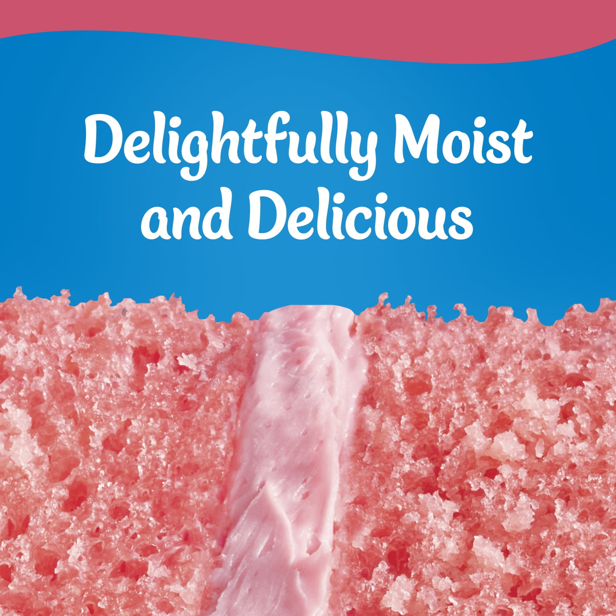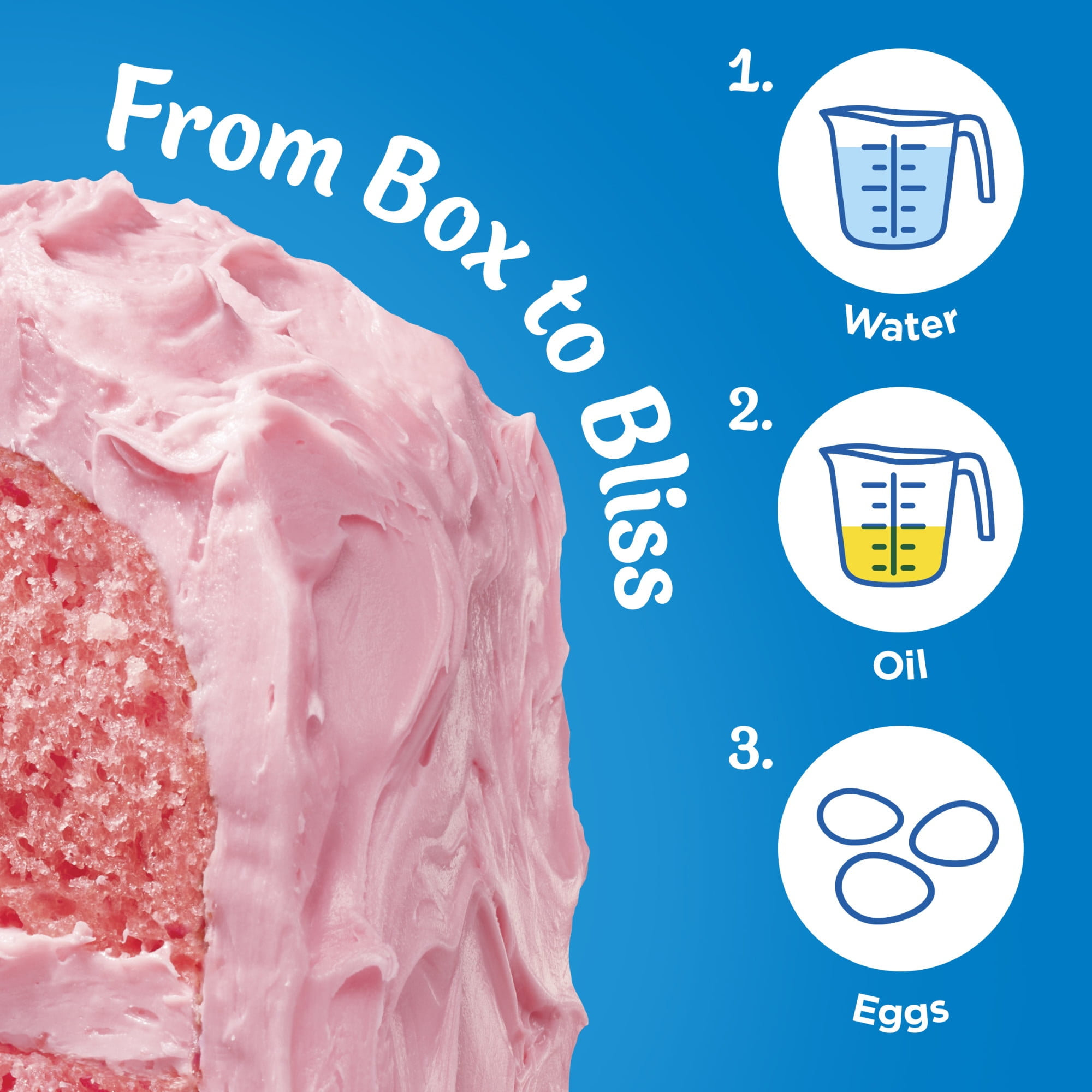 Transform everyday moments into fun-filled celebrations with Pillsbury cake mix. With each bite, you’ll experience the beloved flavor that keeps you coming back for more. Pillsbury Moist Supreme Strawberry Cake Mix lets you easily prepare a delightful dessert in just three steps. Simply add water, eggs and vegetable oil to the dry mix, then pop it in the oven to make one 13″ x 9″ sheet cake or 24 cupcakes. Our box cake mix is ideal for birthdays, holidays, family gatherings and any celebration, big or small. Try using our versatile cake mix to make cake pops, cookies, bundt cakes and other delicious desserts that everyone will enjoy. Use Pillsbury Creamy Supreme Frosting, sprinkles, candy and more to decorate your cake for any occasion. Keep your pantry stocked with our 15.25-ounce box of strawberry cake mix so you can bake up some fun anytime! From birthdays to holidays to just because, cake makes everything better. Create berry sweet memories with Pillsbury Moist Supreme Strawberry Cake Mix.