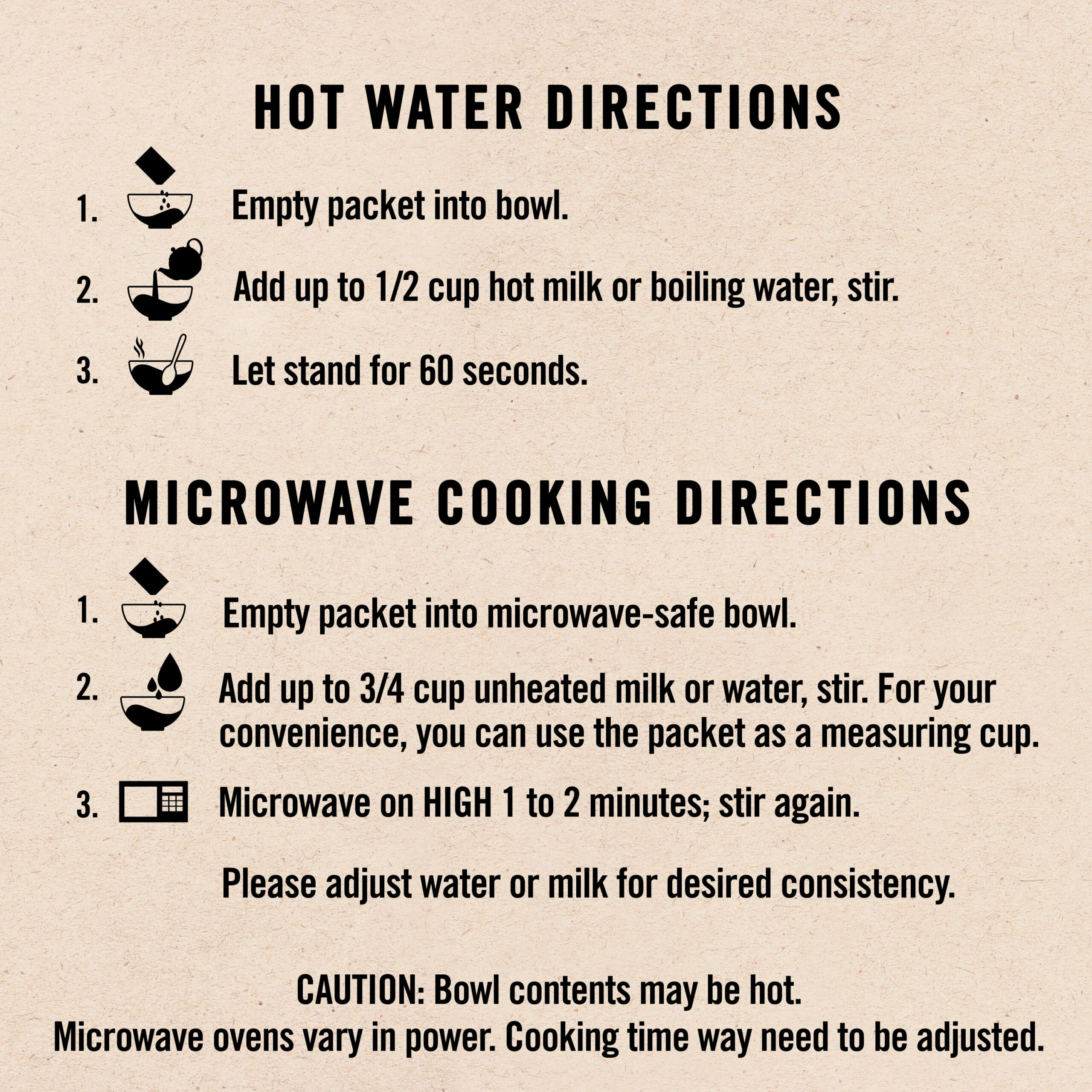 Easy for microwave with either hot water with raisins or milk (creamier) then microwave …When raisins are added to hot water(softens the raisins ) Then mix packet up and microwave. Milk can be added after to cool it down ..Dress it up with Whipped cream instead of milk..with a pinch of cinnamon or very little ground nutmeg..on top of whipped cream..