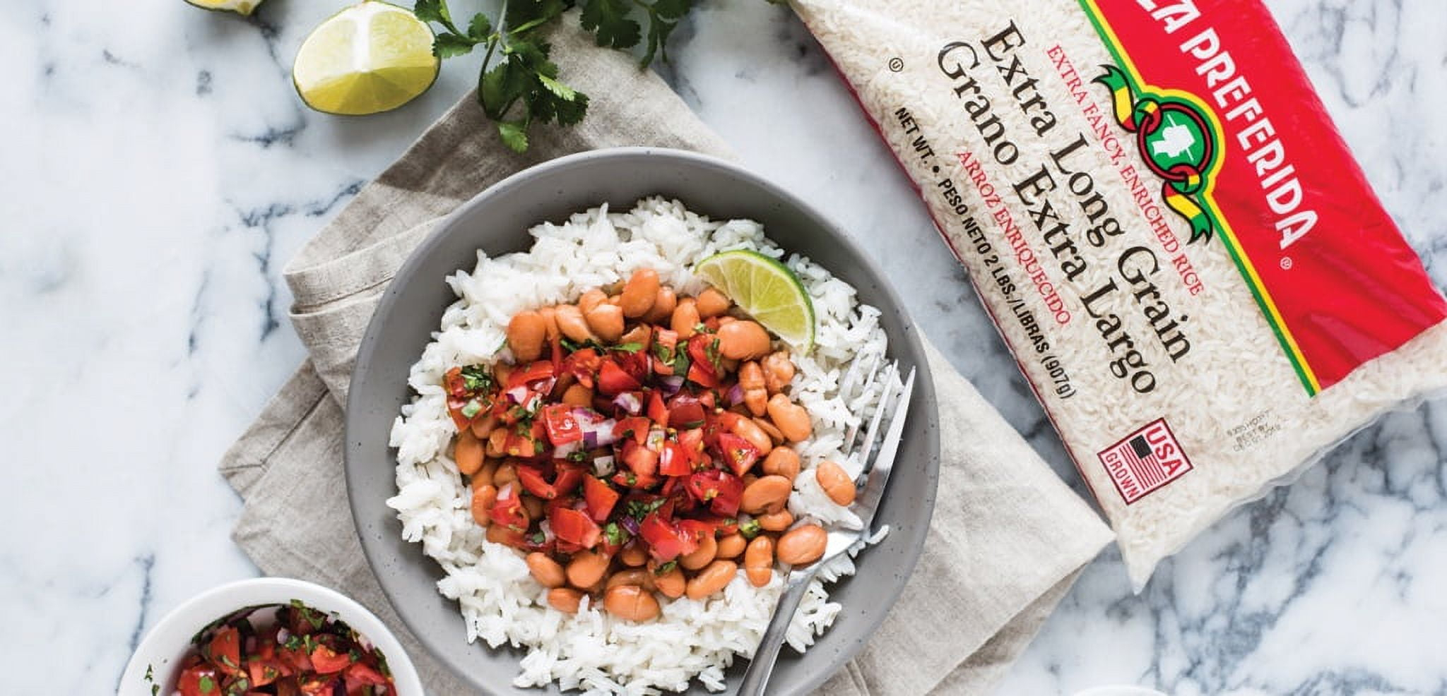 Our 2 lb bag of La Preferida Extra Long Grain Rice provides a blank canvas for you to impart your favorite flavors on. The key feature is that the grains stay fluffy yet separate after being cooked and are unlikely to clump together. They tend to have a firmer, drier texture and are ideal for side dishes and salads. Our extra long grain rice is free from artificial colors and preservatives and can be used in a variety of cultures and cooking styles.