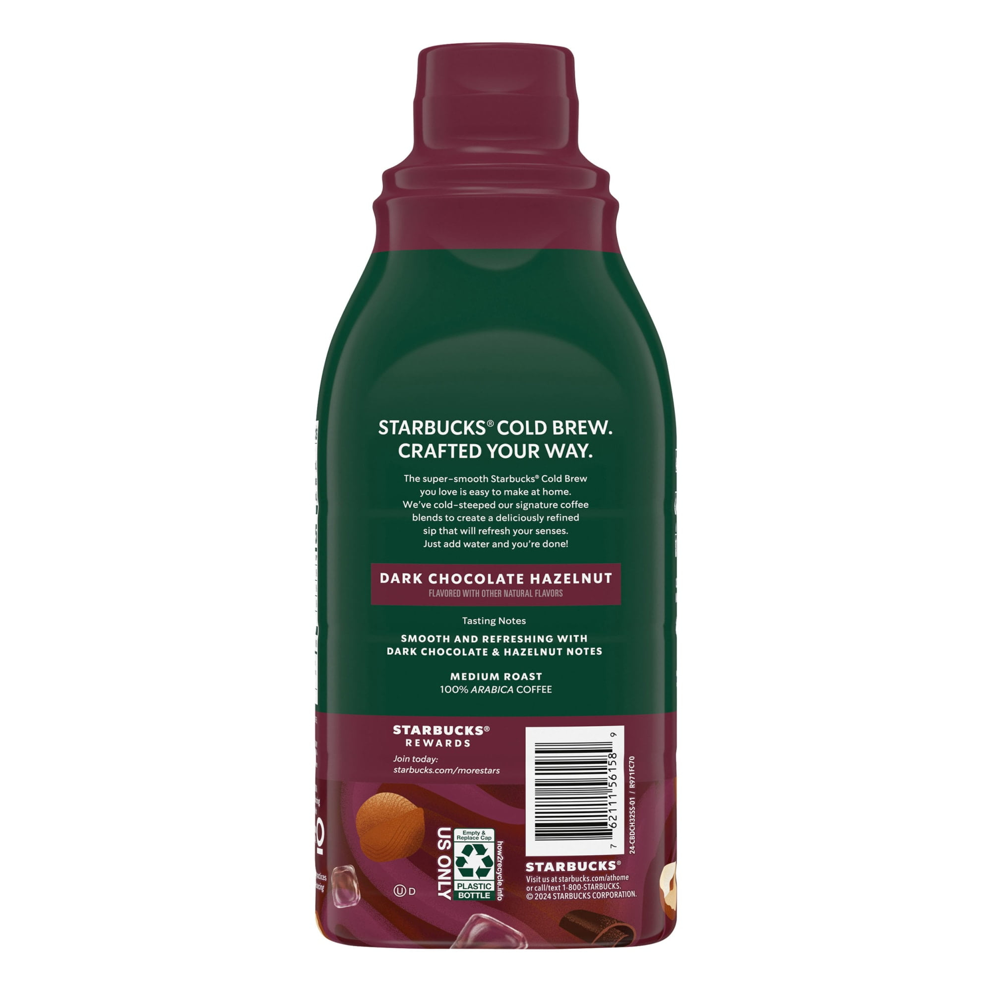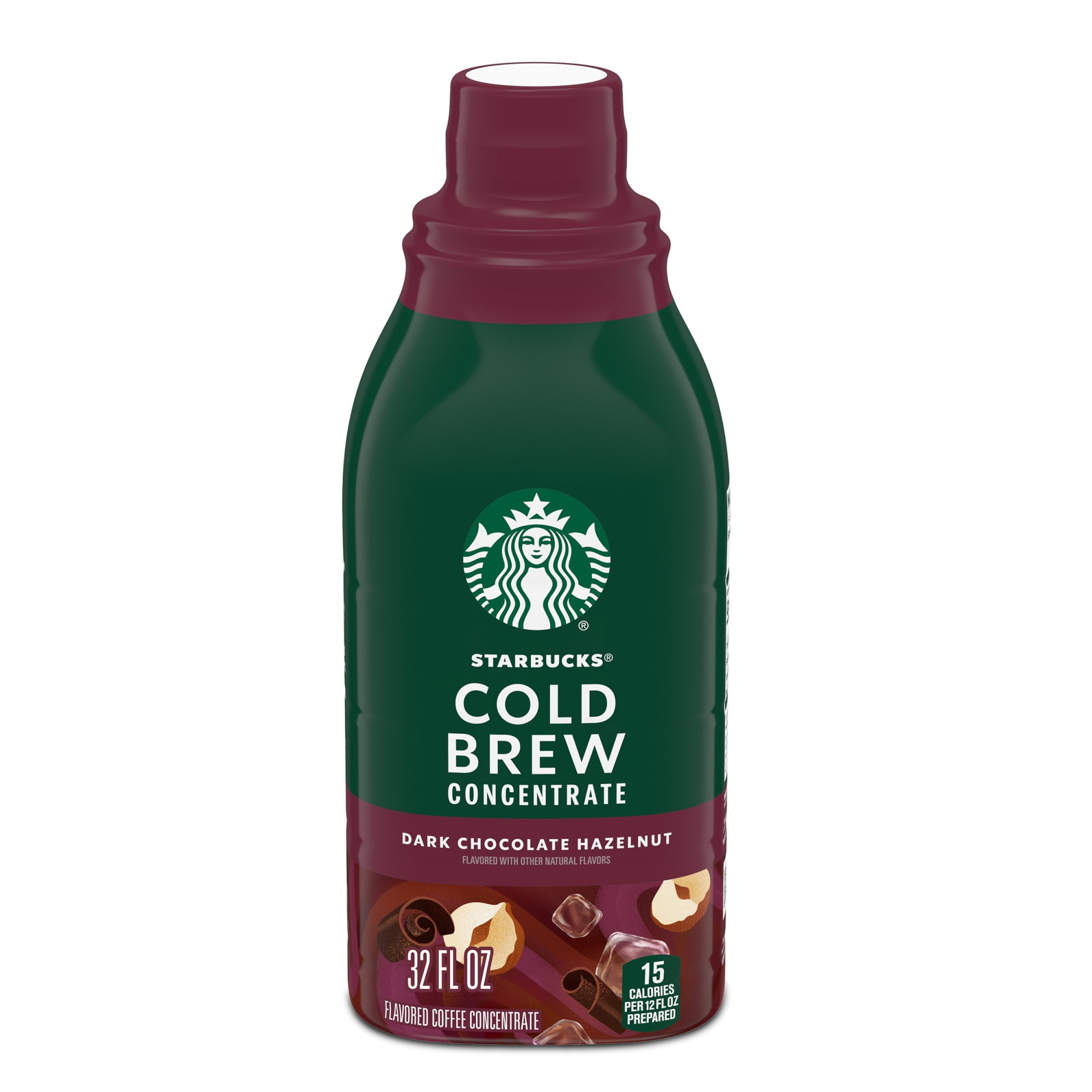 Your favorite cold brew is now easy to make at home and ready to drink with Starbucks Cold Brew Multi-Serve Concentrates. We’ve cold-steeped our custom blend of medium-roast coffee, luring out dark chocolate and hazelnut notes into this smooth and refreshing concentrate. Starbucks Cold Brew Coffee Concentrate Naturally Flavored Dark Chocolate Hazelnut is perfect for those of us who don’t have the time to wait but love coffee over ice in an instant. This multi-serve bottle makes 64 fluid ounces of cold brew coffee when prepared as directed and features fully recyclable packaging. Nestlé uses Starbucks trademarks under license.Starbucks Dark Chocolate Hazelnut Naturally Flavored, Bottled Cold Brew Coffee Concentrate Drink, 32 oz