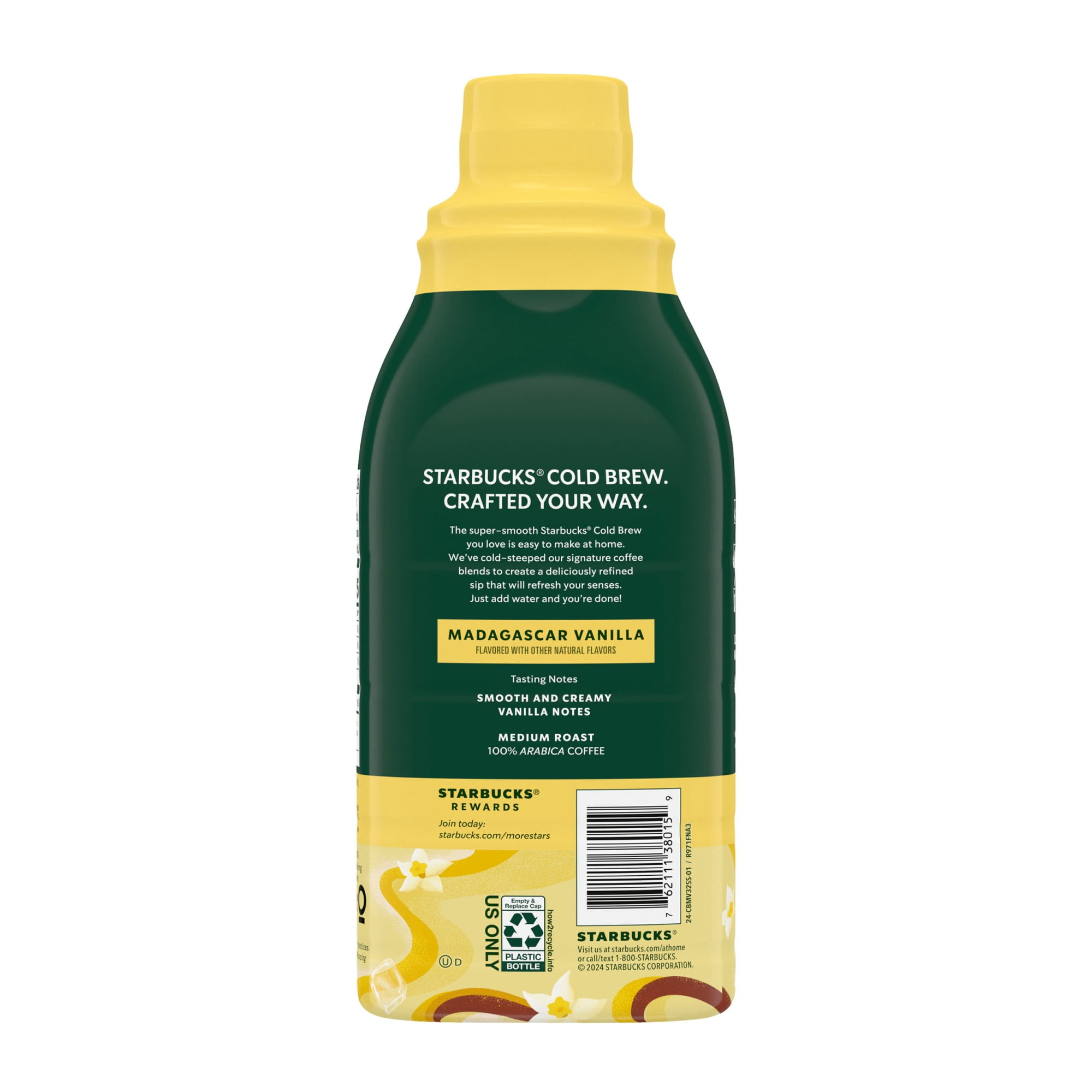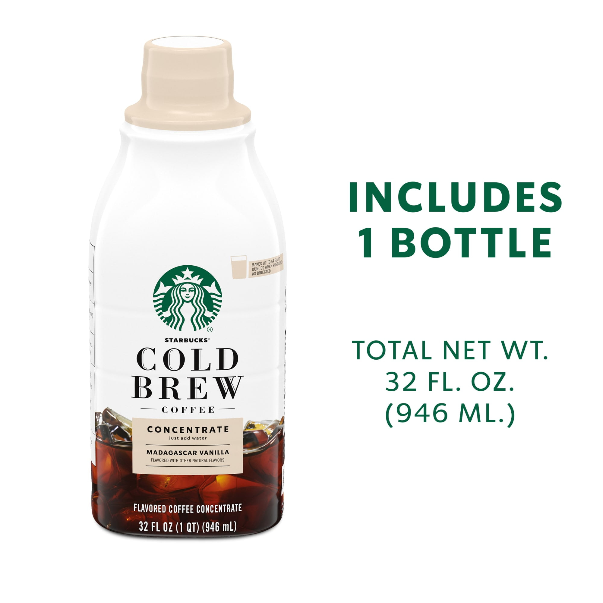Your favorite cold brew is now easy to make at home and ready to drink in no time with Starbucks Cold Brew Multi-Serve Concentrates. We’ve cold-steeped our custom blend of medium-roast coffee, luring out a hint of creamy vanilla into this deliciously sweetened and rich concentrate. Starbucks Cold Brew Coffee Concentrate Naturally Flavored Madagascar Vanilla is perfect for those of us who don’t have the time to wait but love a cold iced coffee beverage in an instant. Just mix this rich concentrate with water and ice for a taste that’s smooth, delicious and perfectly yours. This multi-serve concentrate bottle makes 64 fluid ounces of cold brew coffee when prepared as directed and features fully recyclable packaging. Inspired by the cold brews served at Starbucks cafés, our cold brew at-home coffee has the Starbucks taste you know, love and expect. Now when you make cold brew coffee at home, you can make it perfectly yours with Starbucks. Nestlé uses Starbucks trademarks under license.​Starbucks Madagascar Vanilla Naturally Flavored, Bottled Cold Brew Coffee Concentrate Drink, 32 oz