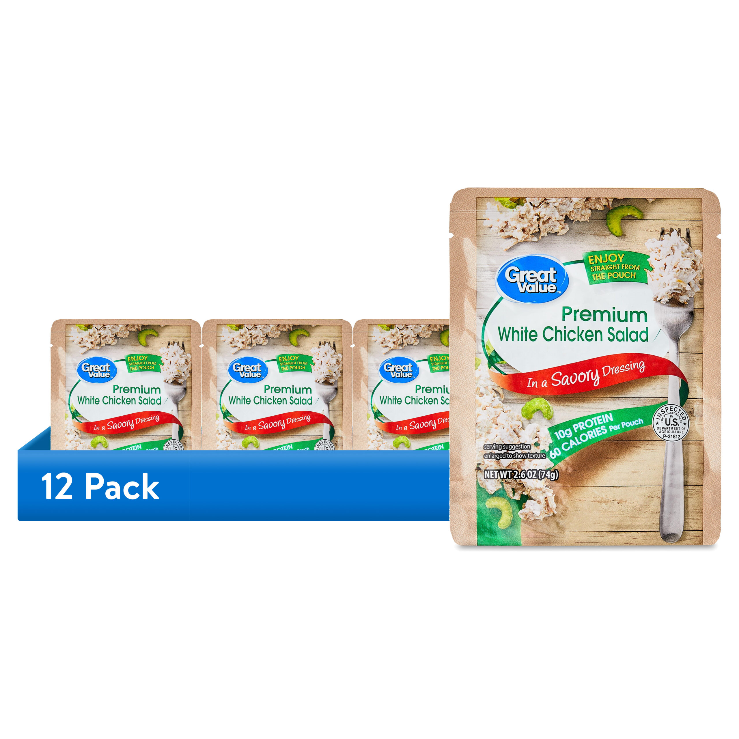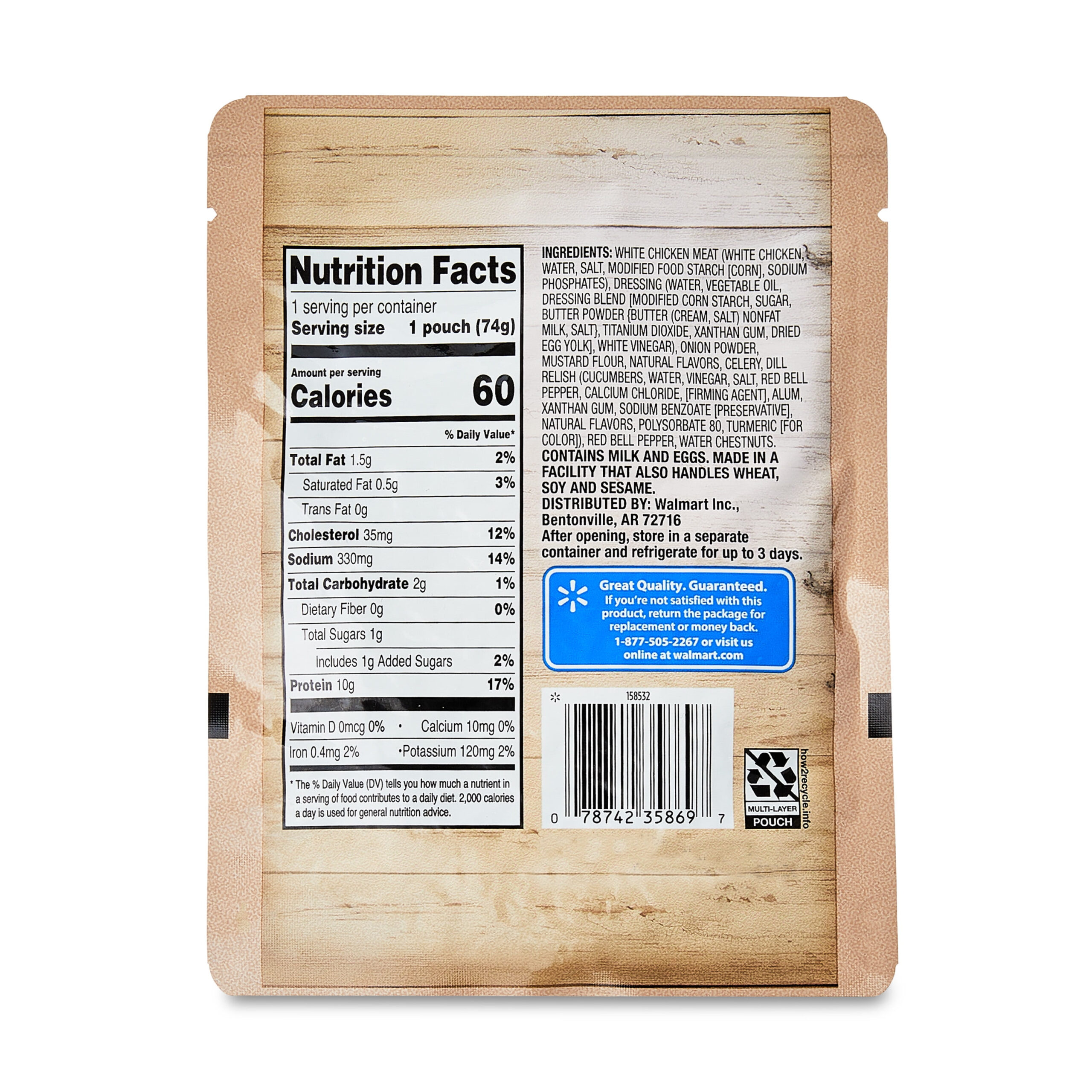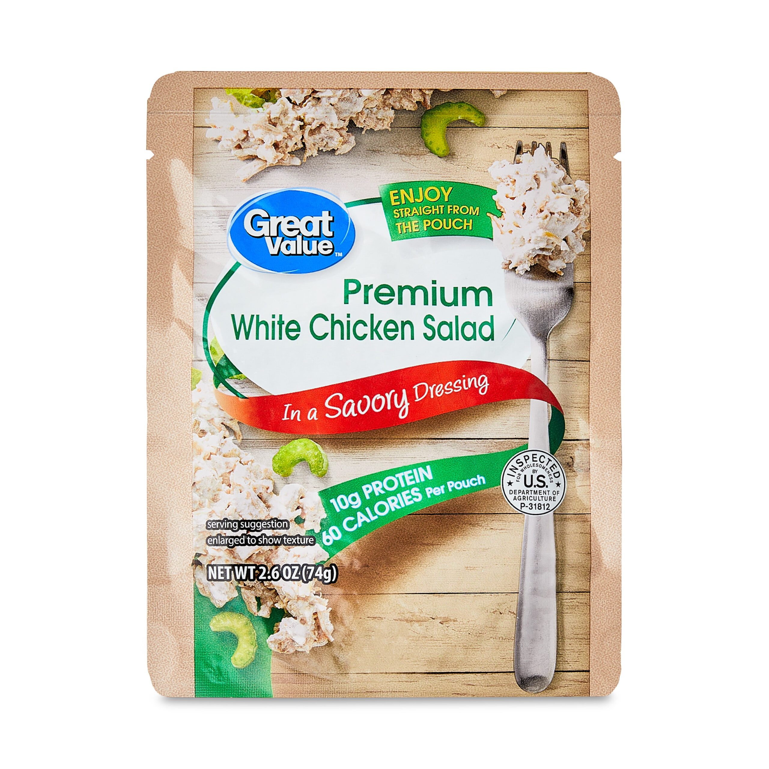 Enjoy a quick and tasty meal with Great Value Premium White Chicken Salad. This fully cooked chicken comes in a savory dressing with celery and sweet pickle relish. Eat it straight from the pouch or add it to salads, sandwiches, or pasta. Each single-serving pouch has 10g of protein and only 60 calories. Gluten-free and ready to eat. After opening, store in a separate container and refrigerate for up to three days. Contains eggs and milk.