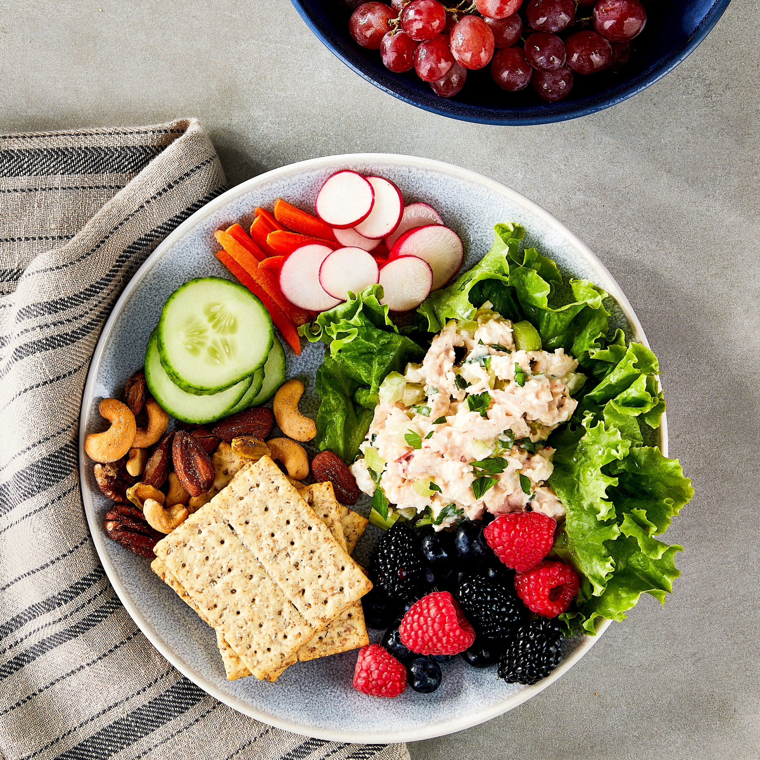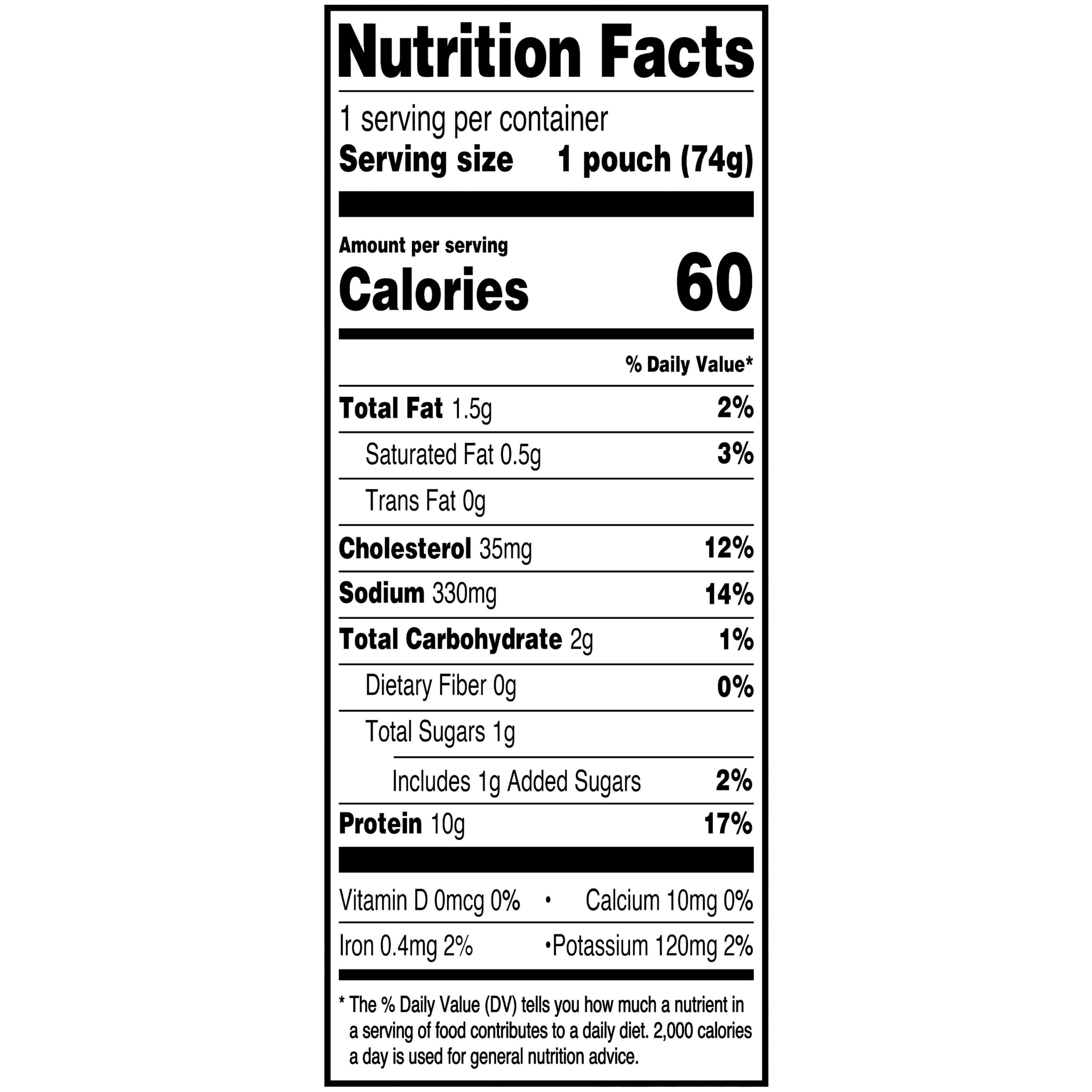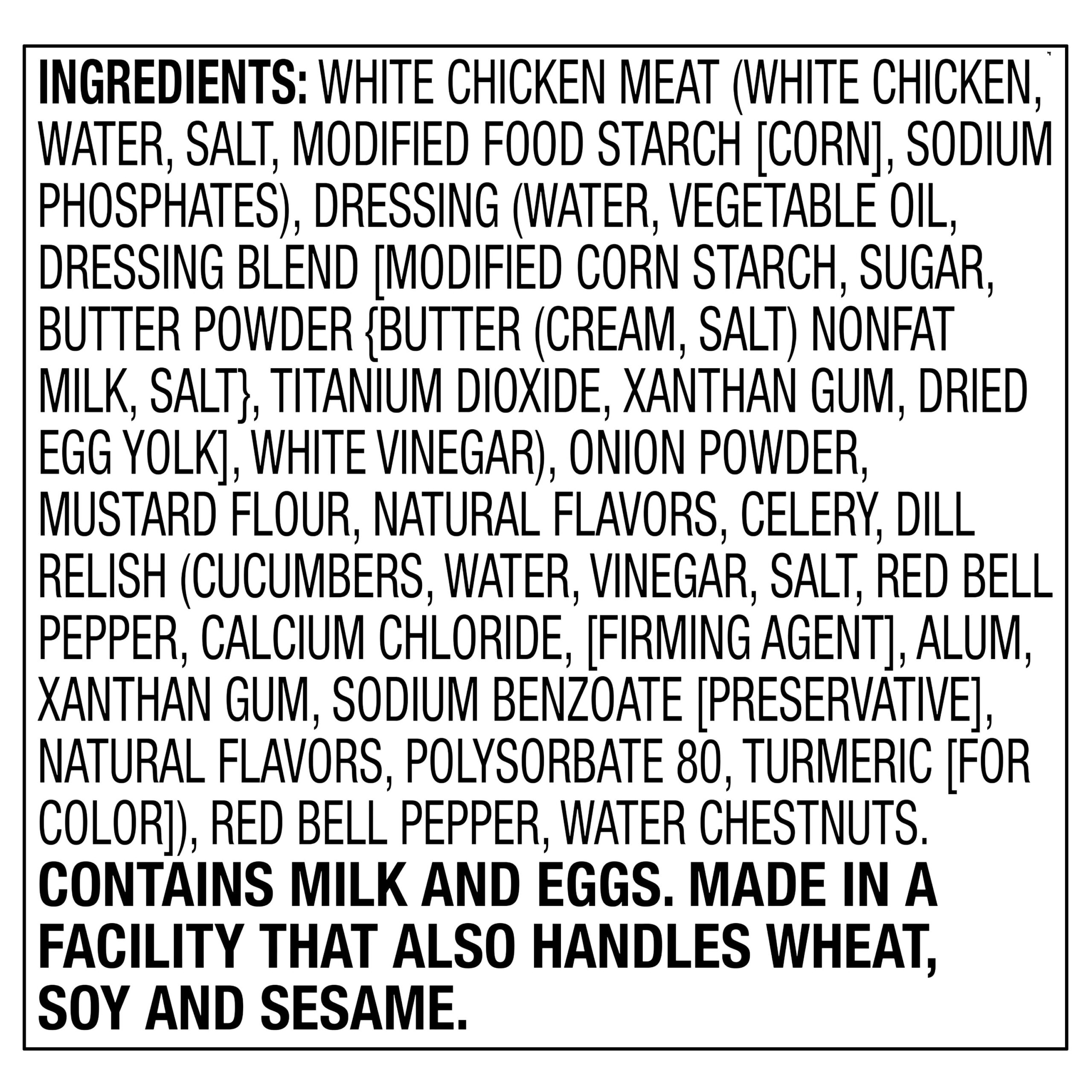 Enjoy a quick and tasty meal with Great Value Premium White Chicken Salad. This fully cooked chicken comes in a savory dressing with celery and sweet pickle relish. Eat it straight from the pouch or add it to salads, sandwiches, or pasta. Each single-serving pouch has 10g of protein and only 60 calories. Gluten-free and ready to eat. After opening, store in a separate container and refrigerate for up to three days. Contains eggs and milk.