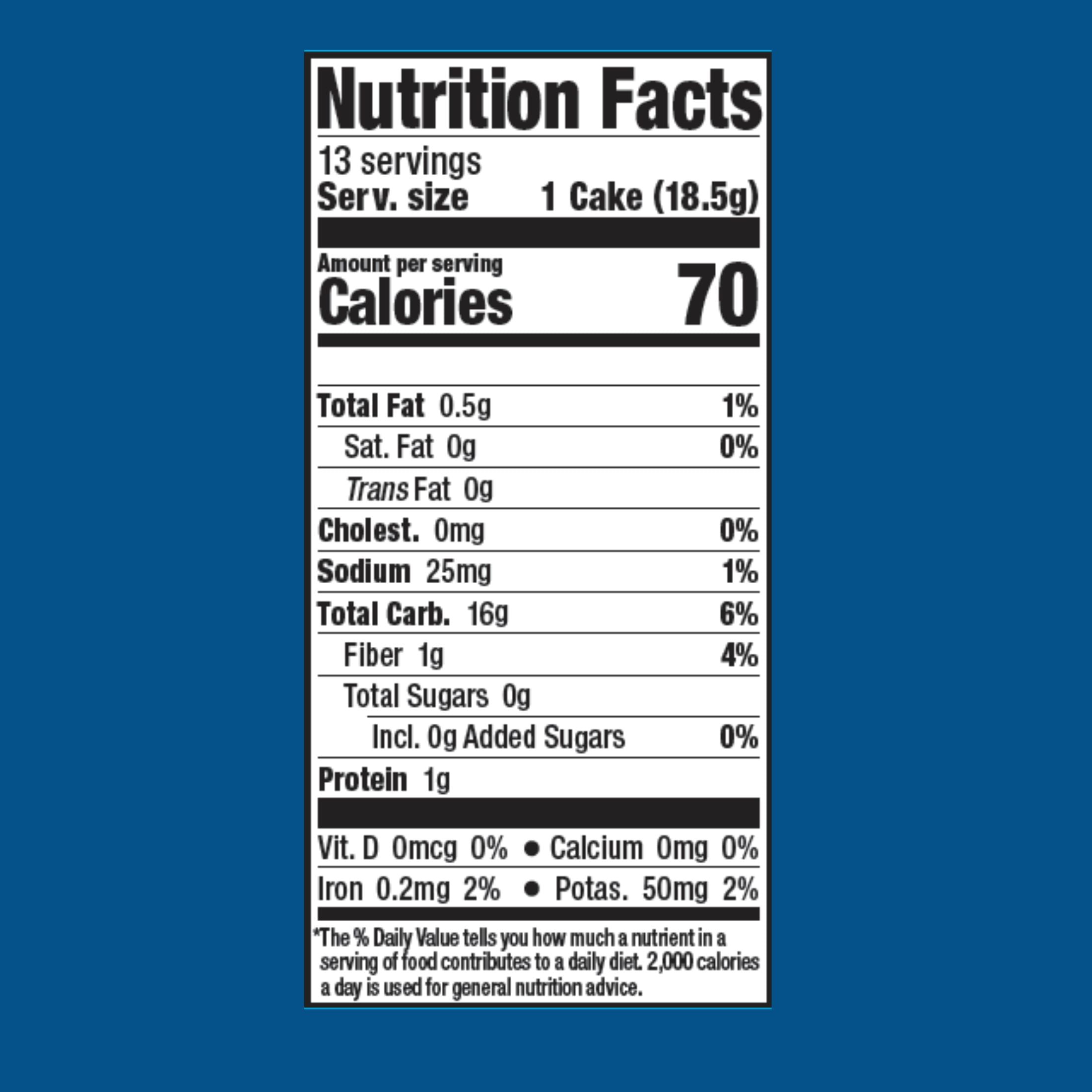 A good low calorie snack that is plain and not full of sugar. Mild flavor with very light salt. Does leaves a lot of crumbs when handling or eating, but makes a low calory pb%26j snack. Bag has 13 rice cakes, double wrapped with reclosable outer bag.