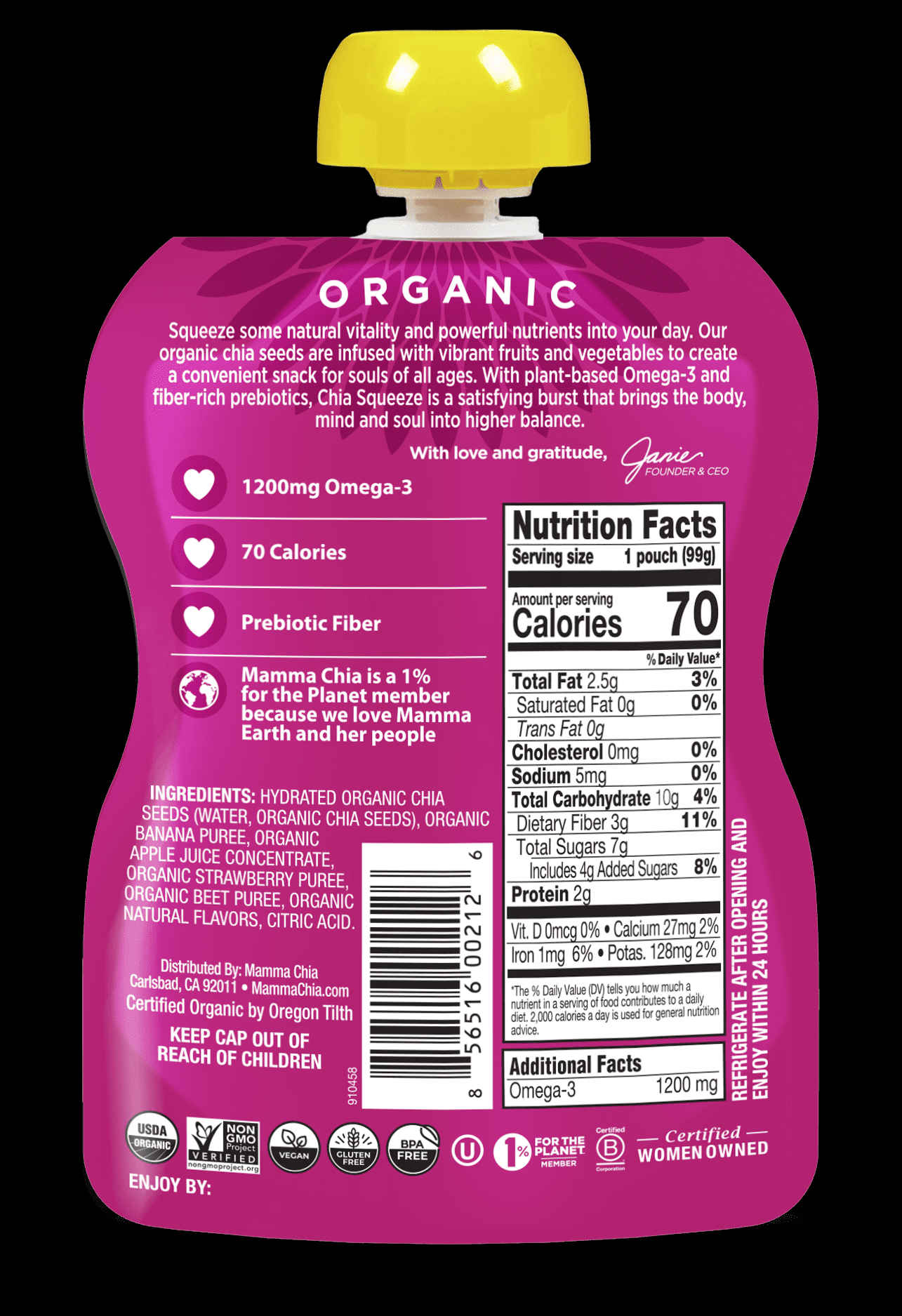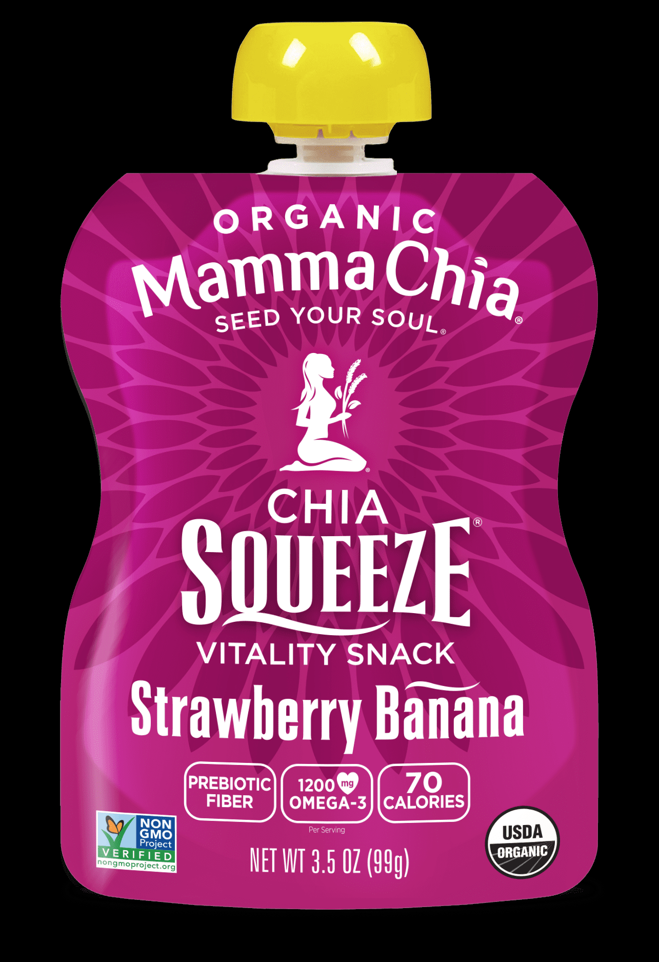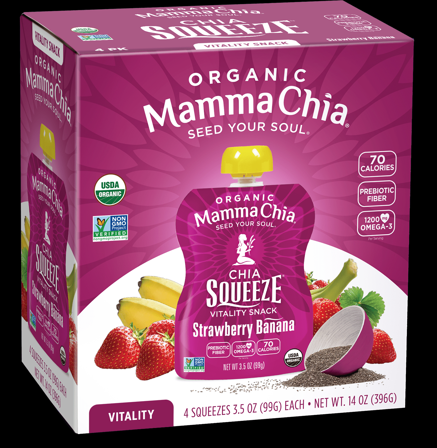 Squeeze some natural vitality and powerful nutrients into your day. Organic chia seeds are infused with vibrant fruits and vegetables to create a convenient snack for souls of all ages. With plant-based Omega-3 and fiber-rich prebiotics, Mamma Chia Organic Chia Squeeze is a satisfying burst that brings the body, mind and soul into higher balance. Perfect for lunchboxes, gym bags, yoga totes, and backpacks.