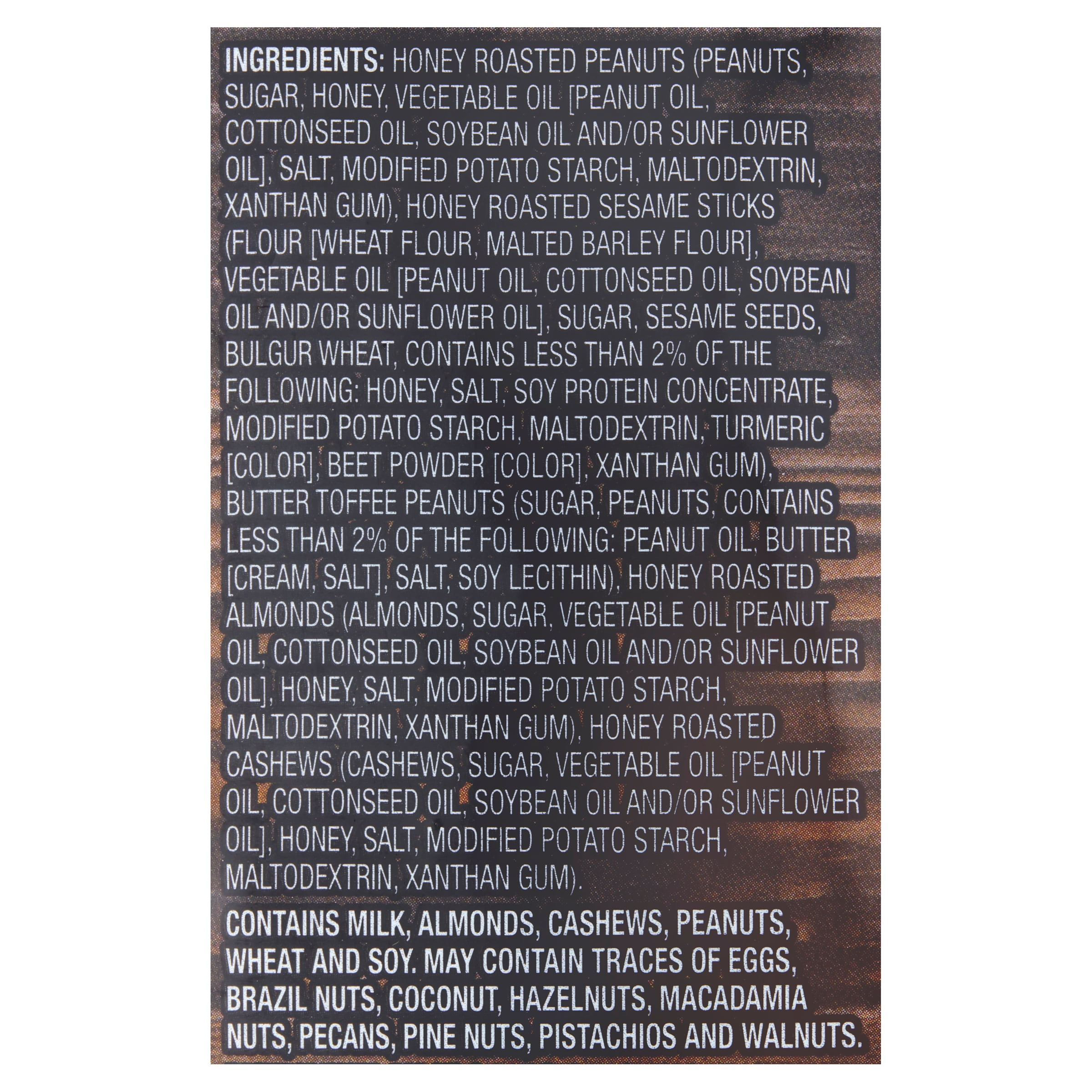 This mix is delicious! Coated nuts make up the bulk of this mix, with extruded sesame “stix” in enough abundance to provide a tasty contrast to the nut mix. I prefer this to the deluxe mixed nuts. I gave a nut to my 2½ y o. grandson, who immediately came back for more!!