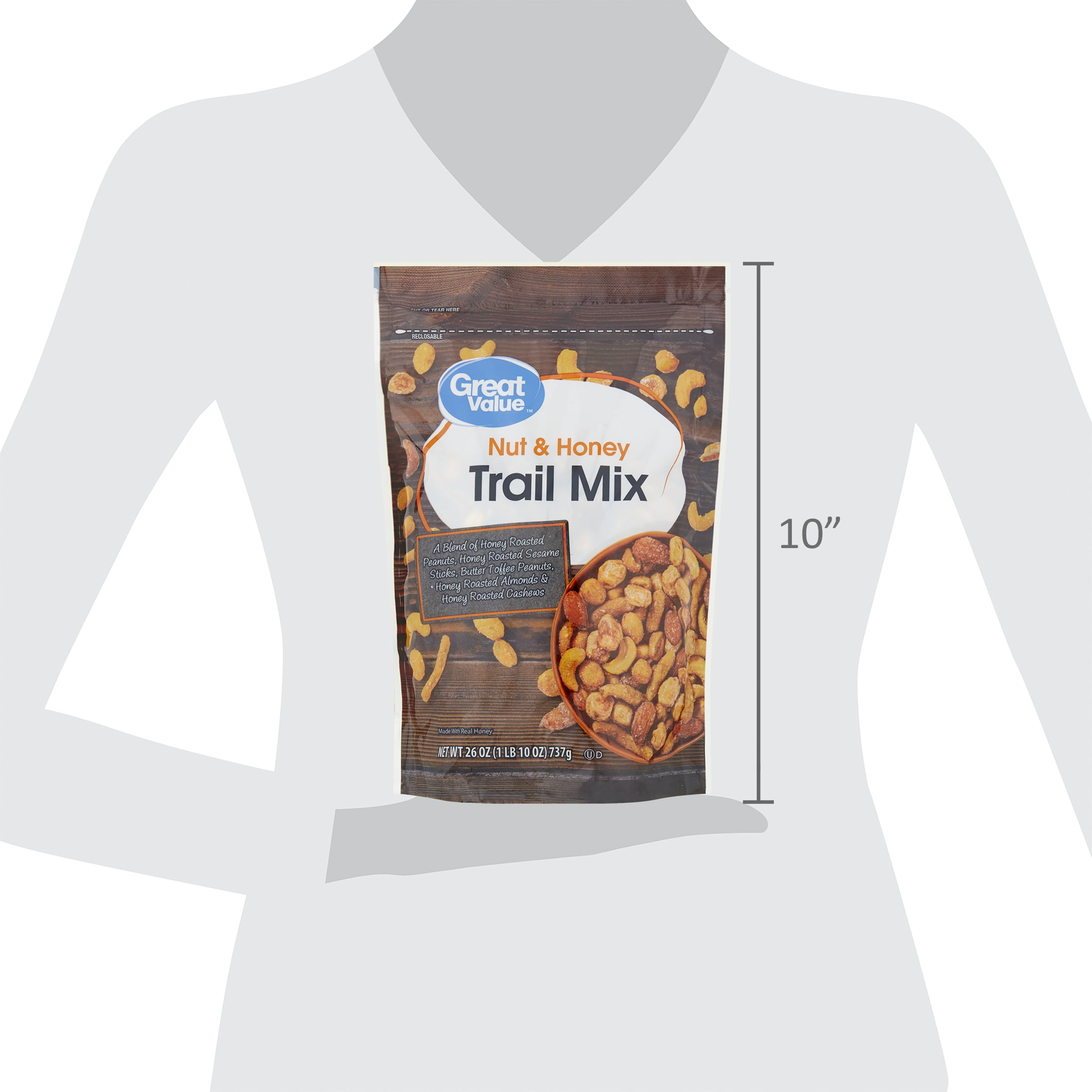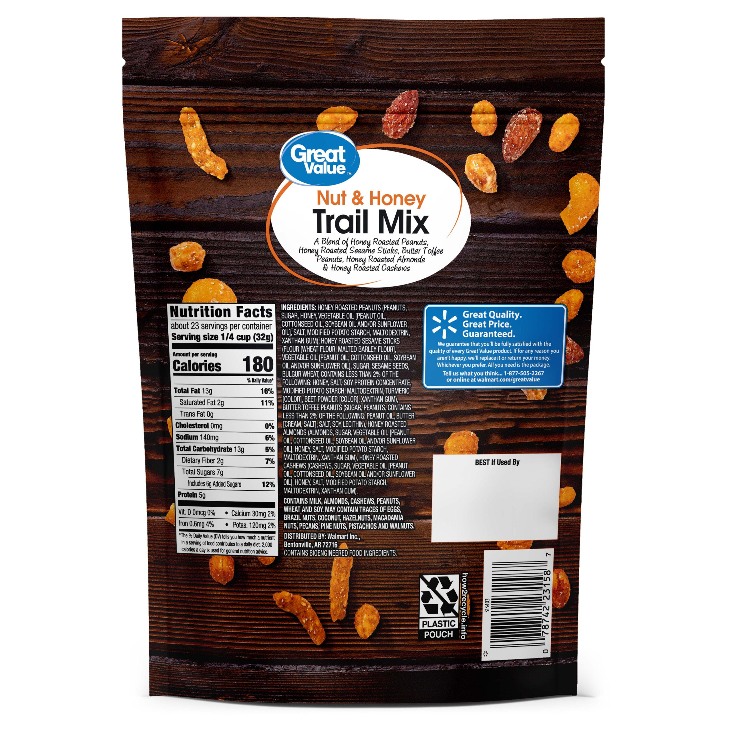 Snack like royalty at home or on the go with Great Value Nut & Honey Trail Mix. Our nutritious and delicious nut and honey trail mix is a unique blend of honey roasted peanuts, honey roasted sesame sticks, butter toffee peanuts, honey roasted almonds, and honey roasted cashews. It comes in a 26-ounce resealable plastic bag that is perfect to take along in a backpack or cooler for hiking trips or picnics. Made with real honey and packed with protein, it’s a great snack for folks on the go. Keep your energy levels up and your hunger satisfied with Great Value Nut & Honey Trail Mix.