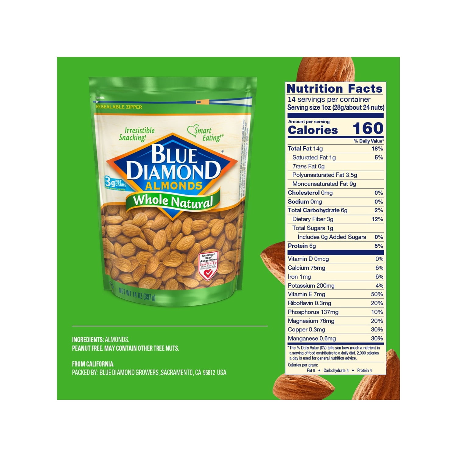 I enjoy nuts as a daily snack, and Blue Diamond almonds are among my favorites. I prefer unsalted, unflavored nuts, and these Whole Natural almonds are consistently fresh and tasty. I find that there are more almond pieces or “imperfect” nuts in the 14-ounce bag than in the 6-ounce containers, but the bag is a better value, and the imperfections do not affect the taste.