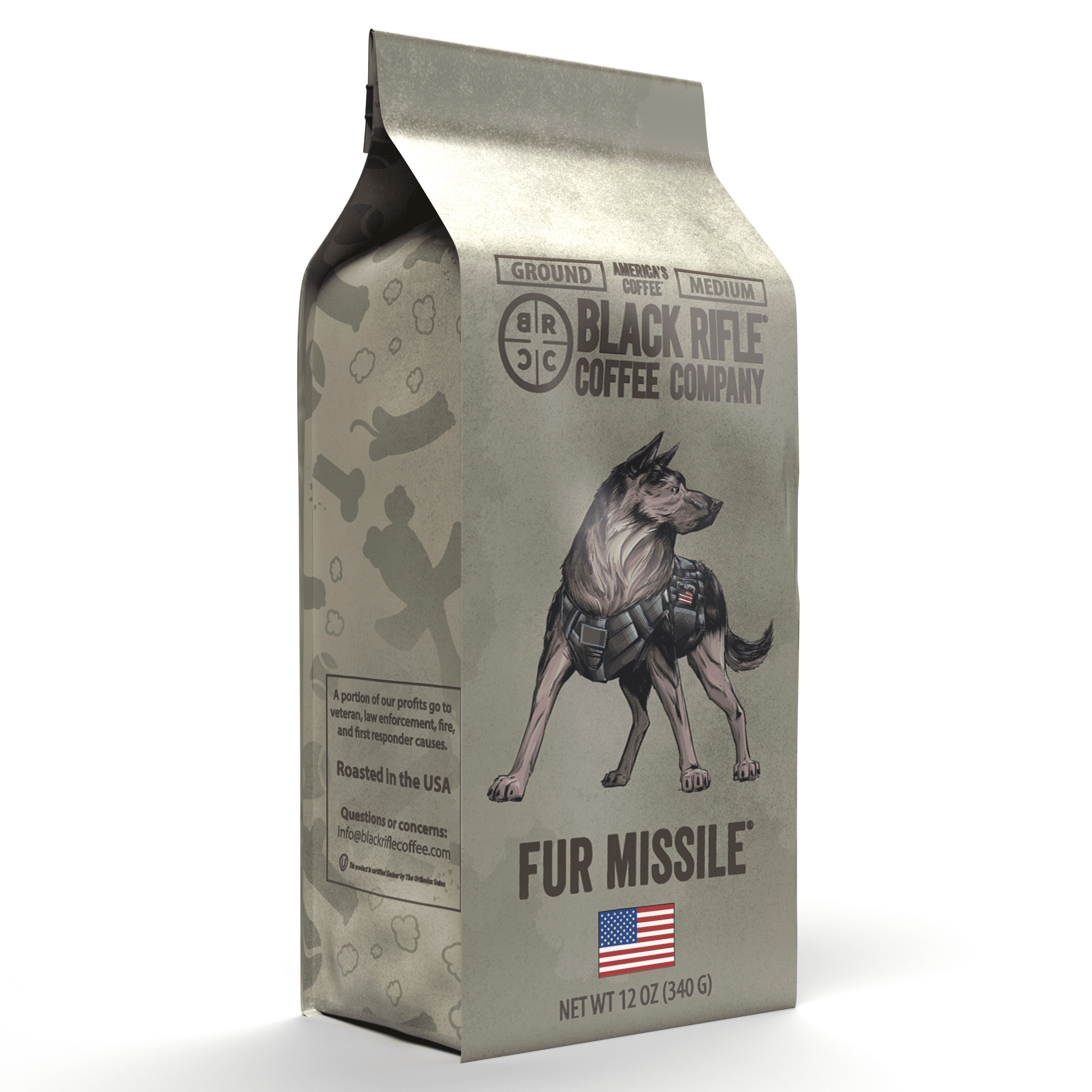 Fur Missile roast pays homage to man’s best friend — more specifically, the K9 members of our military and law enforcement teams. Fur Missile roast features tasting notes of chocolate, citrus, and almonds. These four-legged crimefighters put it all on the line every day, so let’s raise a mug of Fur Missile for all our K9 companions out there. Each 12oz bag of coffee will make about 16 cups of coffee. The various roasts of Black Rifle Coffee Company provide everyone from the beginner to the advanced coffee drinker with a different way to experience our high-quality coffee. Light Roast offers a smoother, more easy-drinking experience. Medium Roast has the most balanced flavor, aroma, and acidity. Dark Roast brings a more heavy body and richer flavor with lower acidity. Extra Dark Roast delivers the richest, most smoky flavor from our coffee roaster.