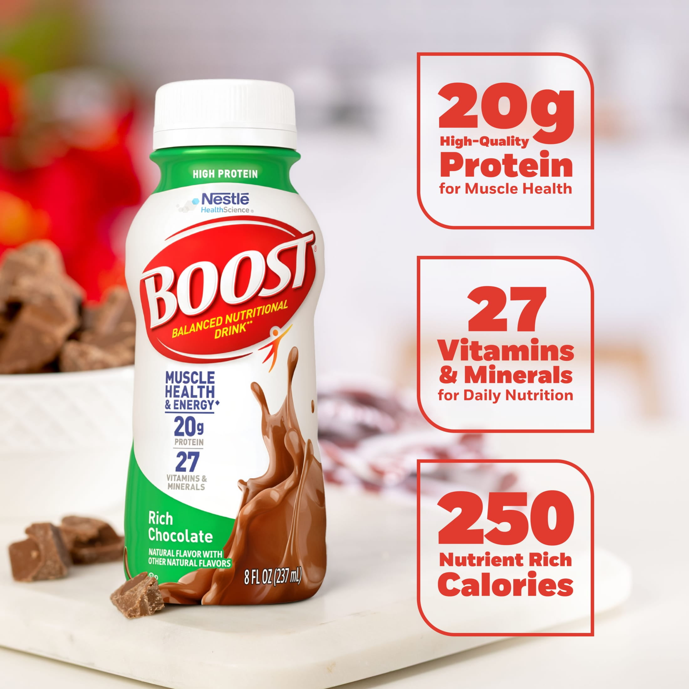 BOOST High Protein Rich Chocolate Flavored Nutritional Drink is a high protein nutritional shake that provides balanced nutrition as part of your daily diet. This rich chocolate high protein drinks provide 20 grams of protein for muscle health and 27 vitamins and minerals including vitamins C & D, zinc, iron and selenium, key nutrients for immune support. Not only does this high protein shake support muscle health, it is designed to provide nutritional energy with 250 nutrient-rich calories and B-vitamins to help convert food to energy. BOOST High Protein Rich Chocolate Nutritional Drinks have a delicious chocolate taste and provide 100% more protein than the BOOST Original drinks (20 g protein vs 10 g in BOOST Original). This pack of high protein chocolate drink includes six reclosable 8 fluid ounce bottles for easy storage and portability.