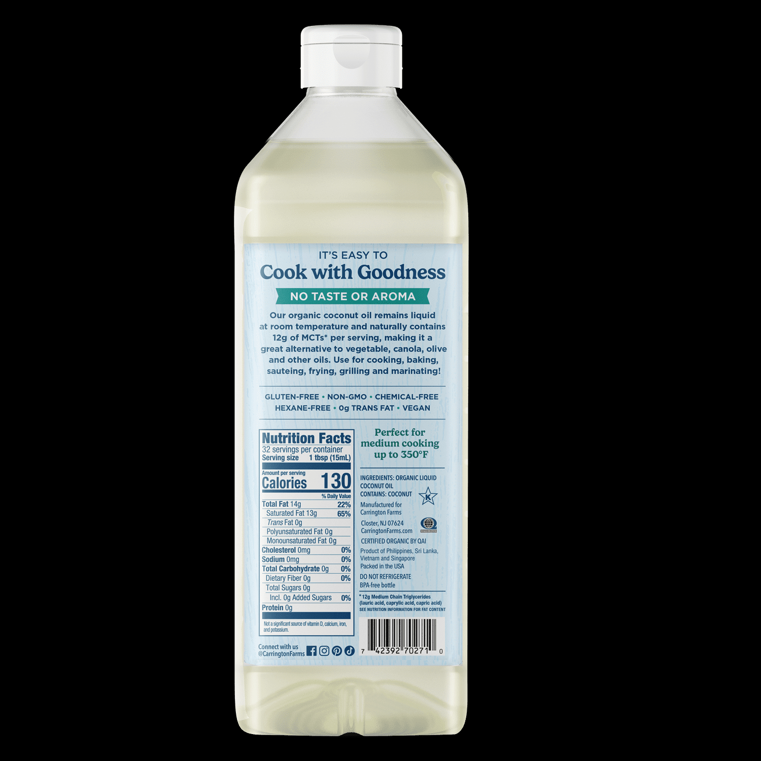 Carrington Farms Organic Coconut Cooking Oil Unflavored. This versatile oil works great in everything from stir-fry to pastries. Fry or bake with it our saute vegetables in it, with more medium chain triglycerides (the good stuff) than regular coconut oil. It’s great alternative to butter, canola, soybean, olive oil etc. Perfect for medium-high heat cooking up to 350xc2xb0F. A vegan & non-hydrogenated product is free from, gluten, hexane, chemical and GMO. Gluten-Free Contains Tree Nuts