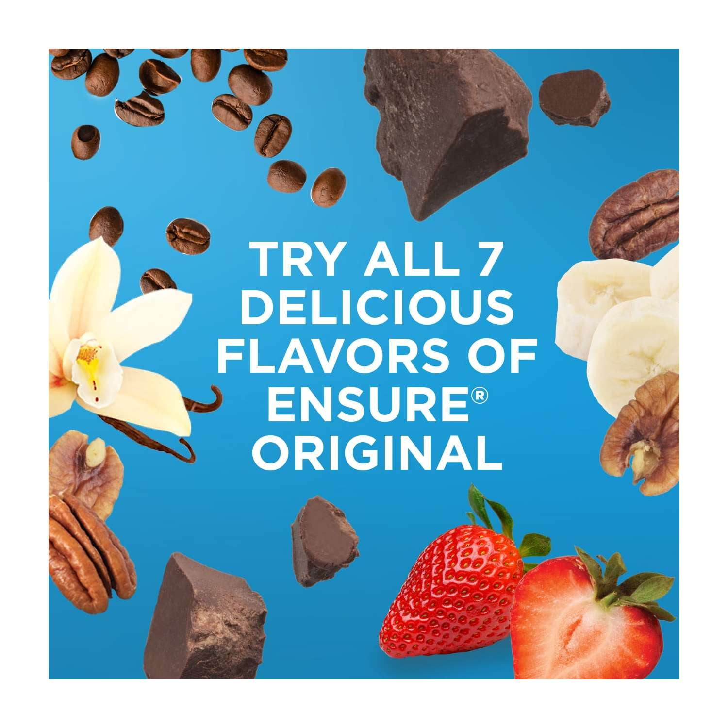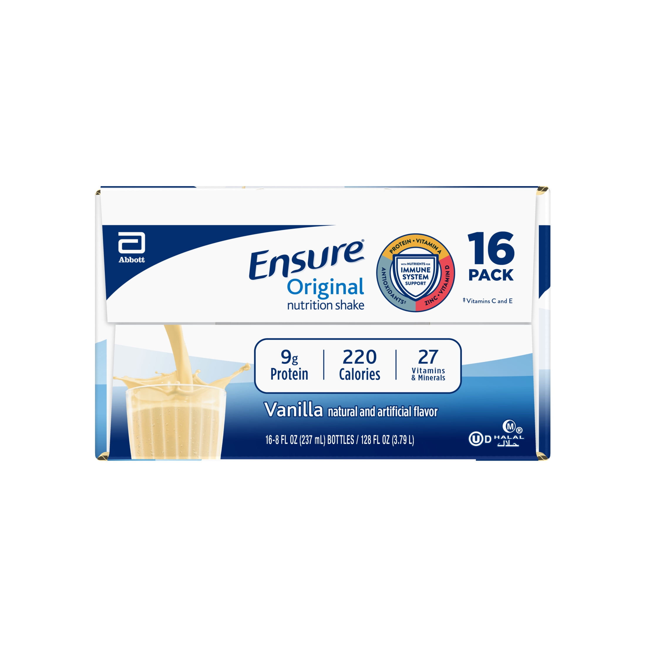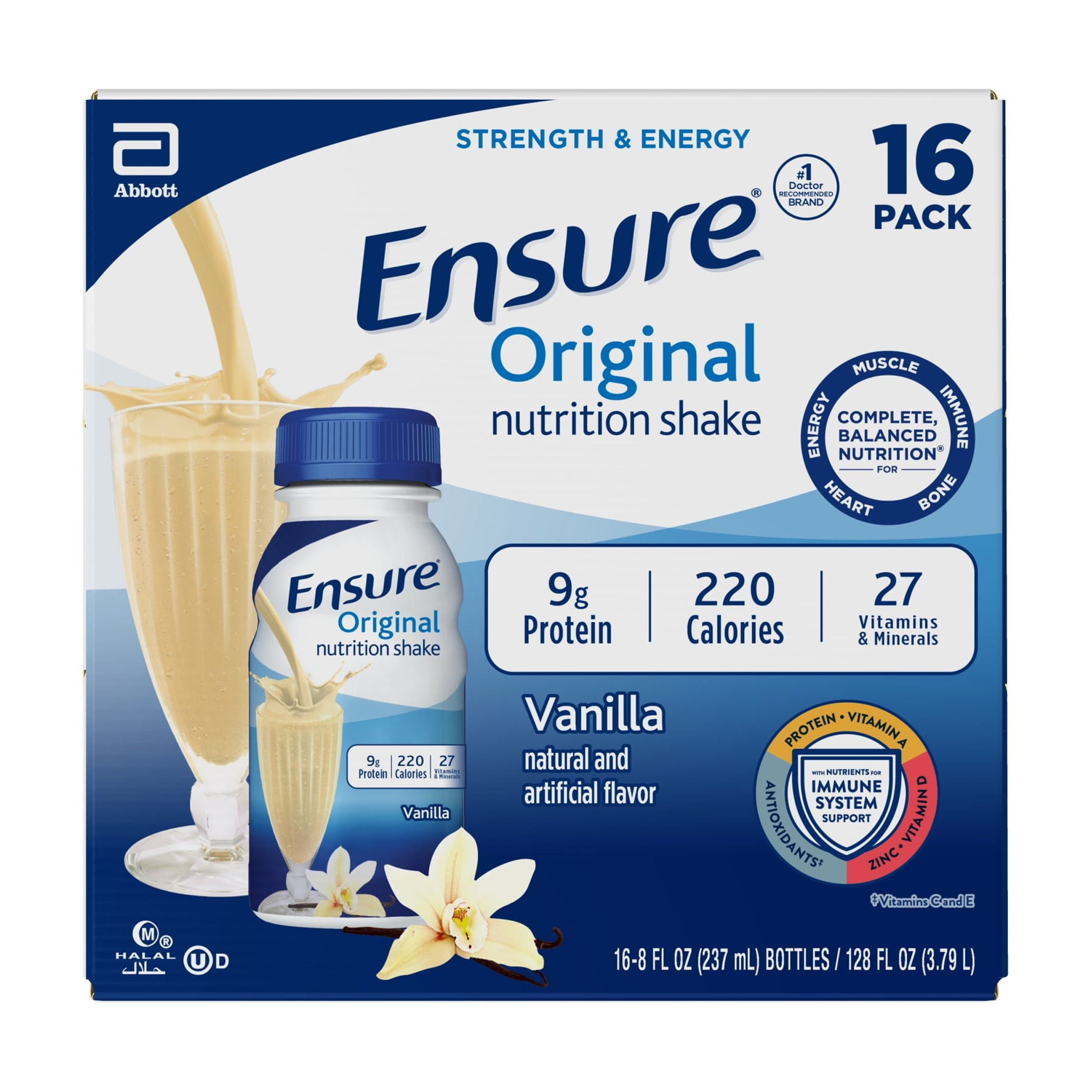 Ensure Original nutrition shakes have 9 grams of protein and 27 vitamins and minerals. These shakes provide vitamins A, D, C, E, and zinc for immune system support. Ensure Original shakes are available in 7 tasty flavors: Milk Chocolate, Vanilla, Strawberry, Butter Pecan, Dark Chocolate, Banana Nut, and Coffee Latte. Try them all to find your favorite! Add Ensure Original to recipes or take it on the go for nutrition when you want it. This nutrition shake easily fits into your morning routine and can even be used as an occasional meal replacement shake. Ensure Original is complete, balanced nutrition with nutrients to help support muscle, immune, digestive, and heart health and energy metabolism. These shakes are kosher, halal, and suitable for lactose intolerance.* * Not for people with galactosemia. †Among doctors who recommend nutritional drinks to their patients.