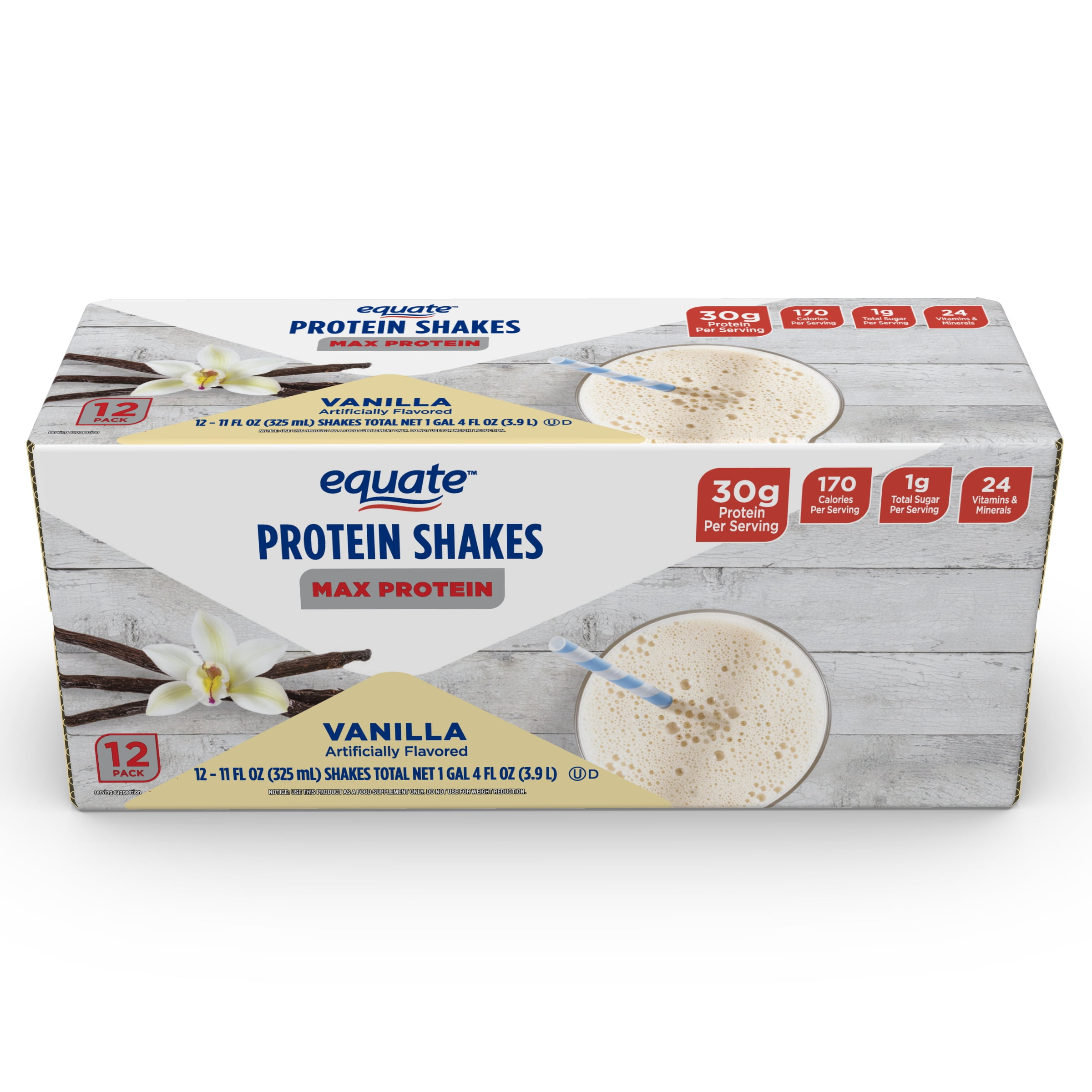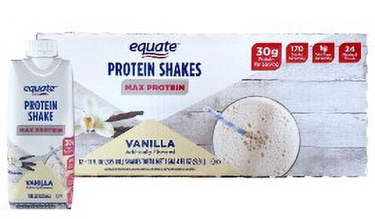 Equate Max Protein Nutrition Shake, Vanilla Flavored, 12 Pack (11 fl oz). Stay energized and refuel your body with Equate Protein Shakes. These ready-to-drink shakes are perfect for busy lifestyles. Packed with essential nutrients and a delicious taste, they provide the ideal post-workout recovery or on-the-go snack. With Equate Protein Shakes, achieving your fitness goals has never been easier. Enjoy a Equate Vanilla Protein Shake today!