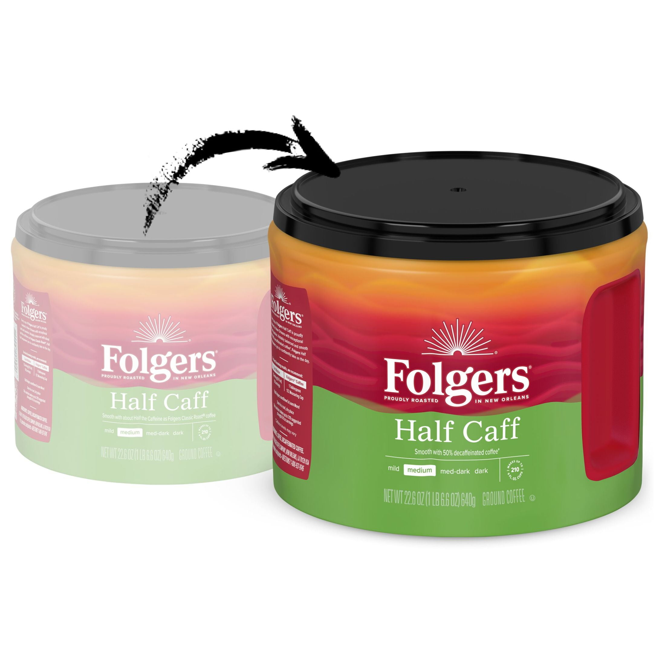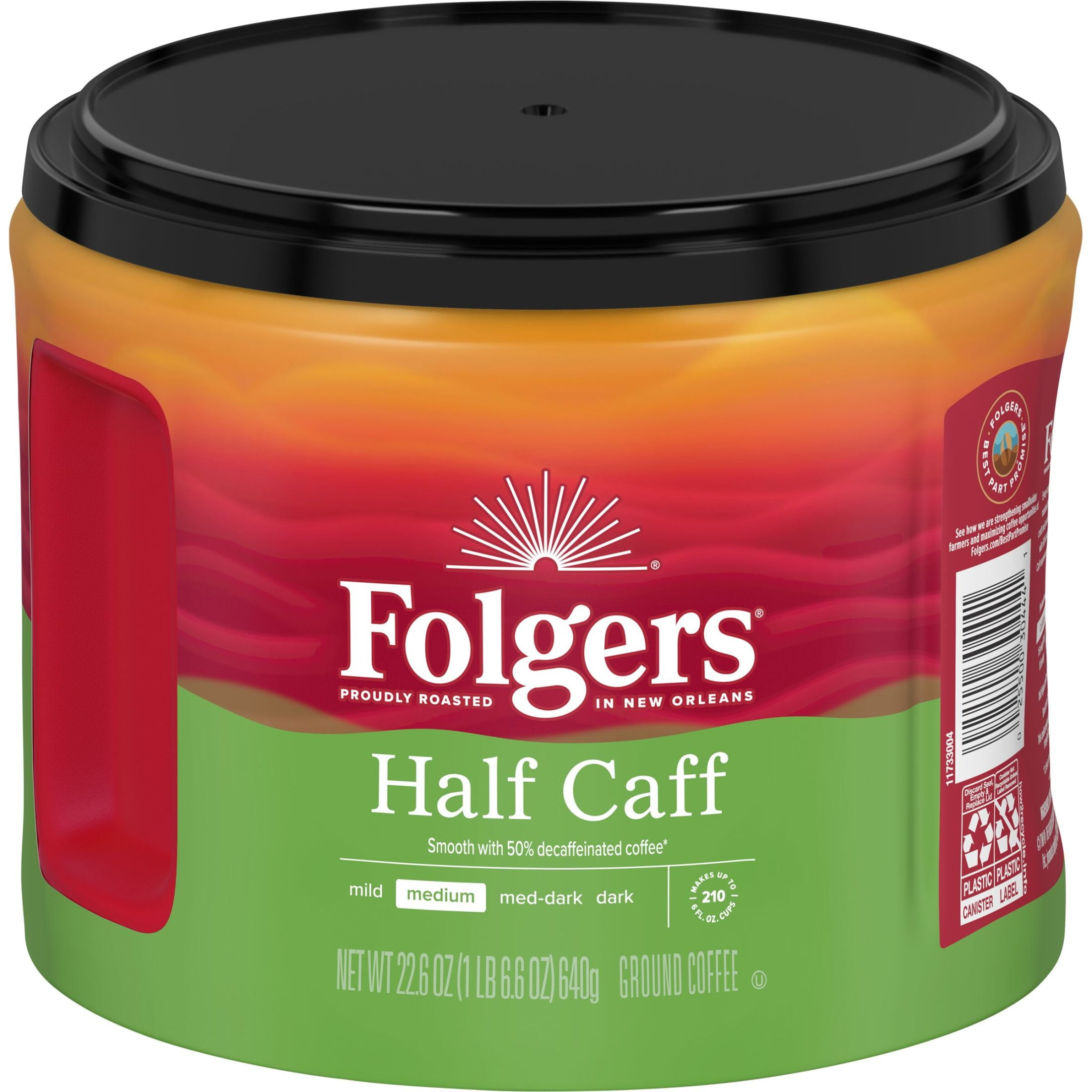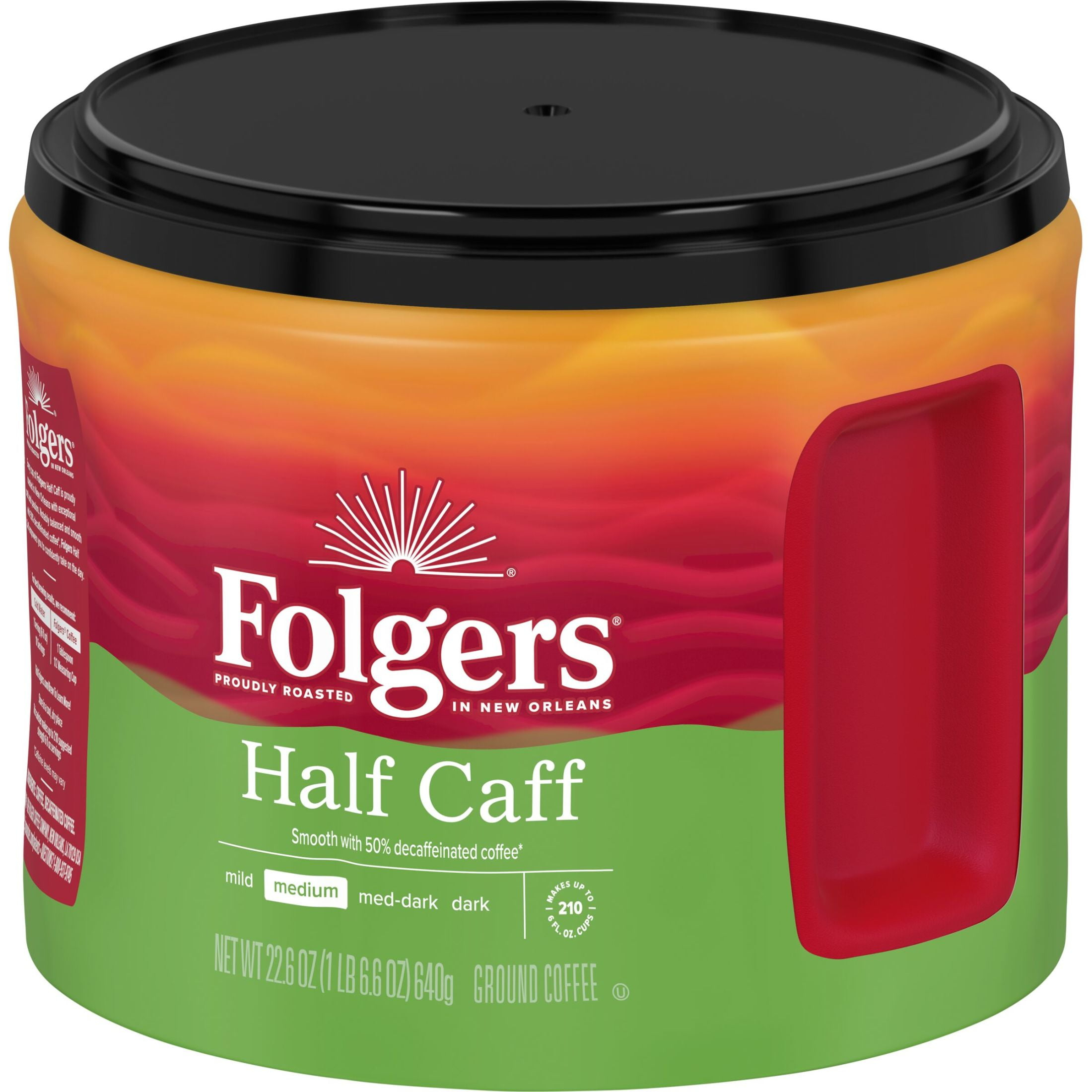 Less caffeine doesn’t have to mean less coffee. With Folgers Half Caff ground coffee, you get the flavor and aroma you love, but half-decaffeinated (caffeine levels may vary). This medium roast coffee is crafted with exceptional quality and passion to deliver an iconic aroma and a smooth, clean and balanced taste in every sip. Brew any way you like – this pre-ground half-decaffeinated coffee can be used for your morning pour-over ritual, or for making a pot with your automatic drip brewer to share with your crew. Keep a canister at your coffee station so your go-to half caff is always on standby.
