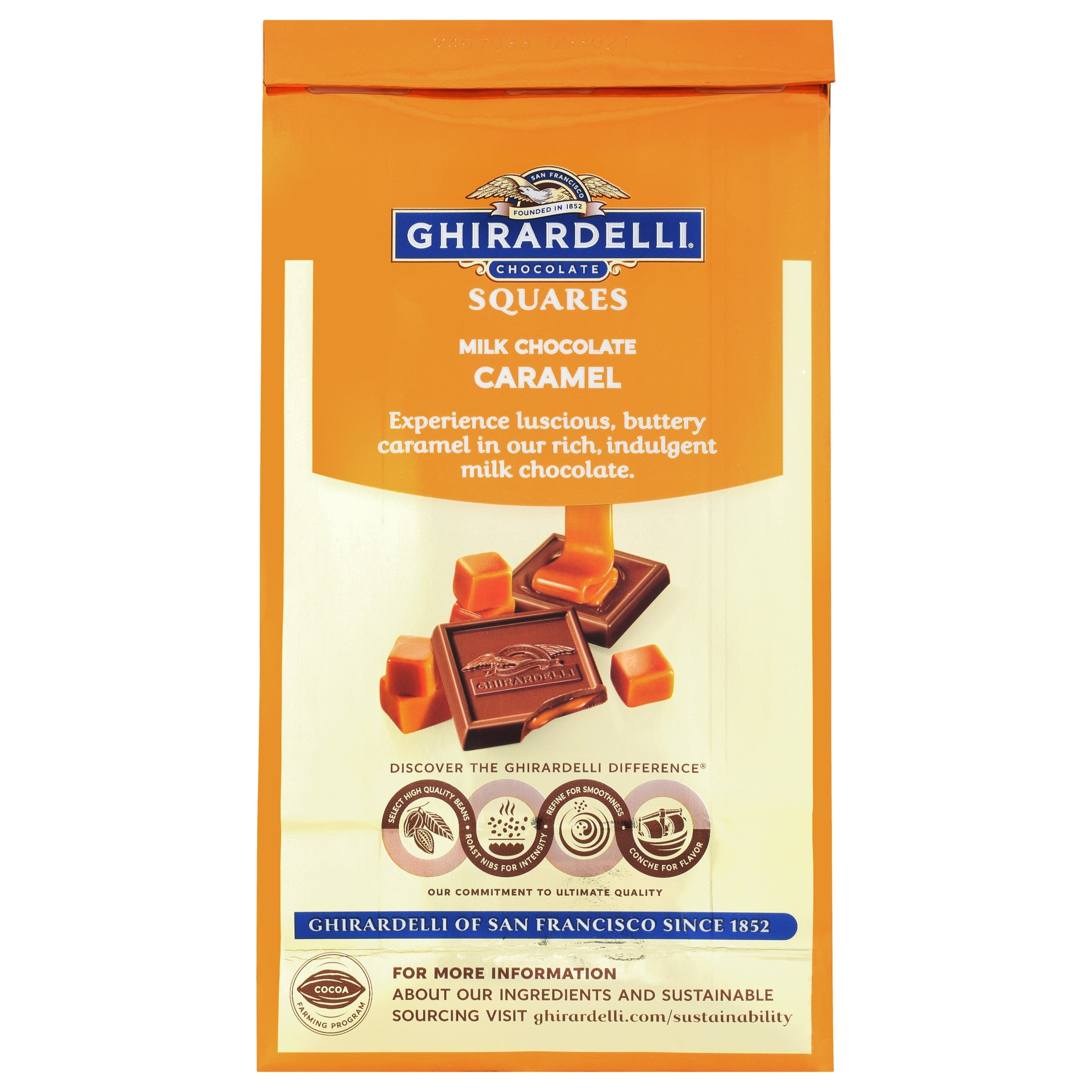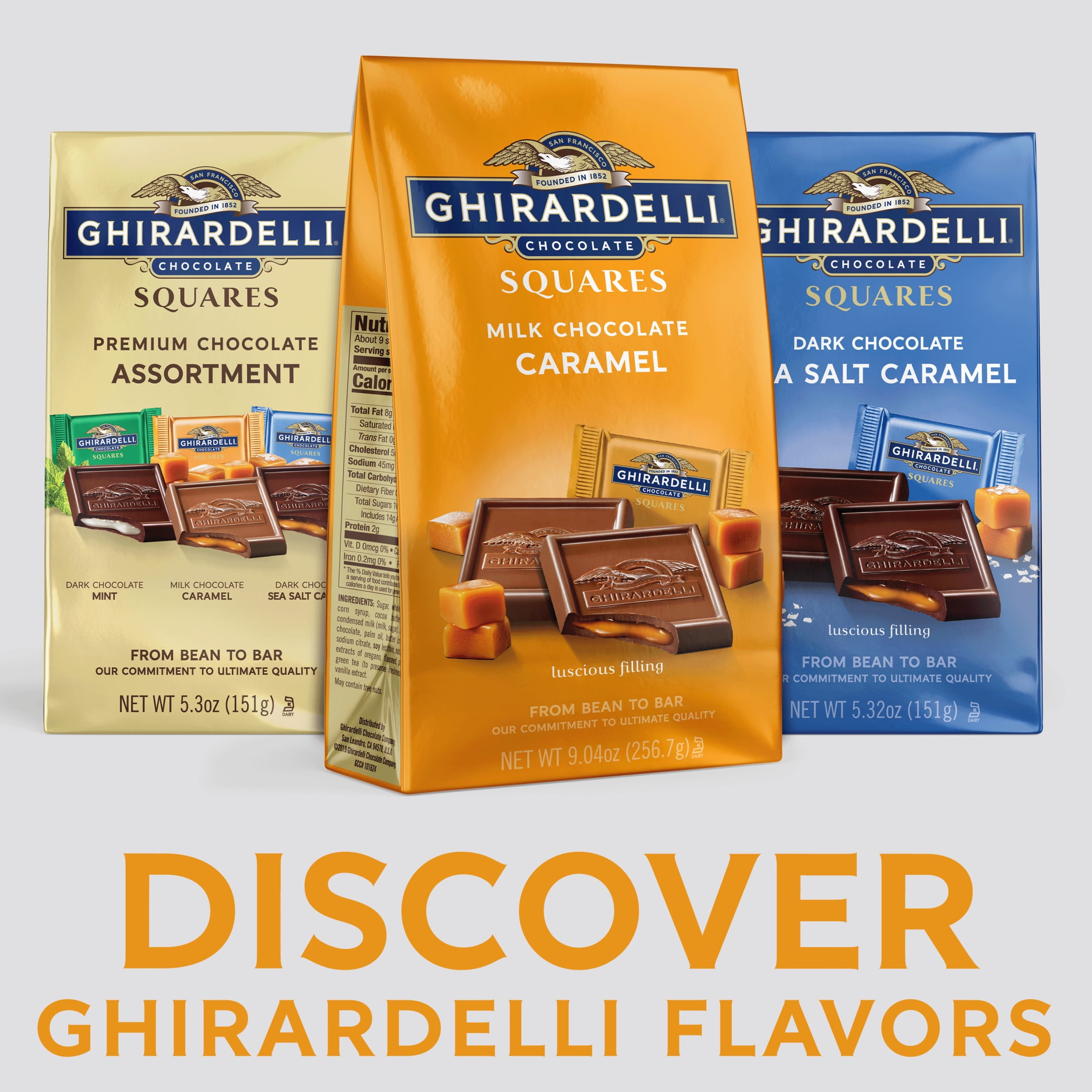 Unwrap Ghirardelli Milk Chocolate Squares with Caramel Filling for moments of luxurious indulgence. Ghirardelli Squares add a sweet touch to your day on their own and offer a delicious twist to s’mores and other desserts for something special. Share the sweet moments of joy and delight with someone close to your heart when you give these chocolate caramel candy squares as a gift. Luscious caramel fills the slow-melting, creamy milk chocolate for pure bliss in every square. Individually wrapped chocolate squares are easy to share or enjoy one at a time. Premium ingredients, including high quality cocoa beans, are part of the Ghirardelli difference: a commitment to ultimate quality from Bean to Bar. Ghirardelli Makes Life a Bite Better.