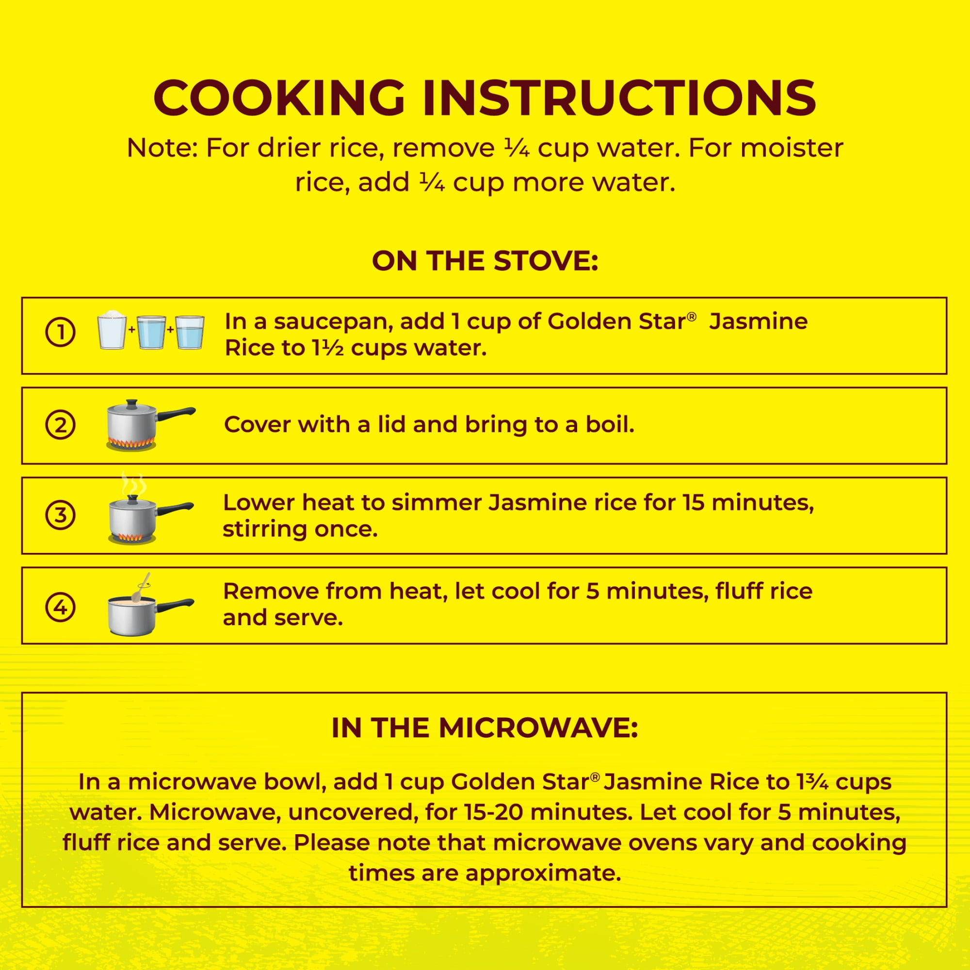 Golden Star Thai Hom Mali Jasmine Rice is a naturally fragrant, long-grain rice known for its slightly sweet taste, soft texture, and nutty aroma. Our jasmine rice is grown in Thailand and packed fresh at harvest season every year under the highest quality standards using sustainable efforts in our fields and factories. It is also GMO-free, naturally gluten-free, cholesterol-free, sodium-free, and fat-free. Golden Star Jasmine rice is perfect as a side dish and in your favorite rice recipes, including fried rice, rice soup, rice & beans and more.