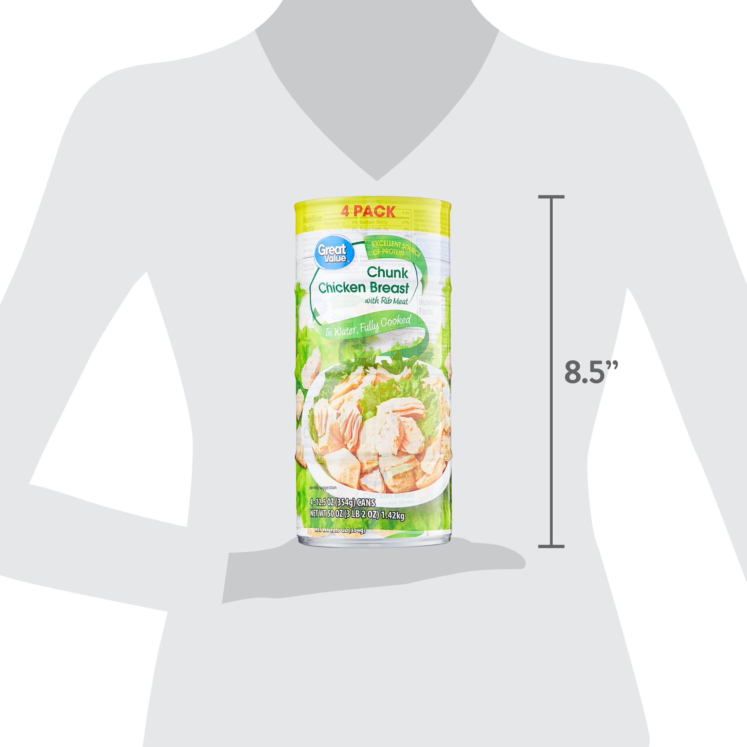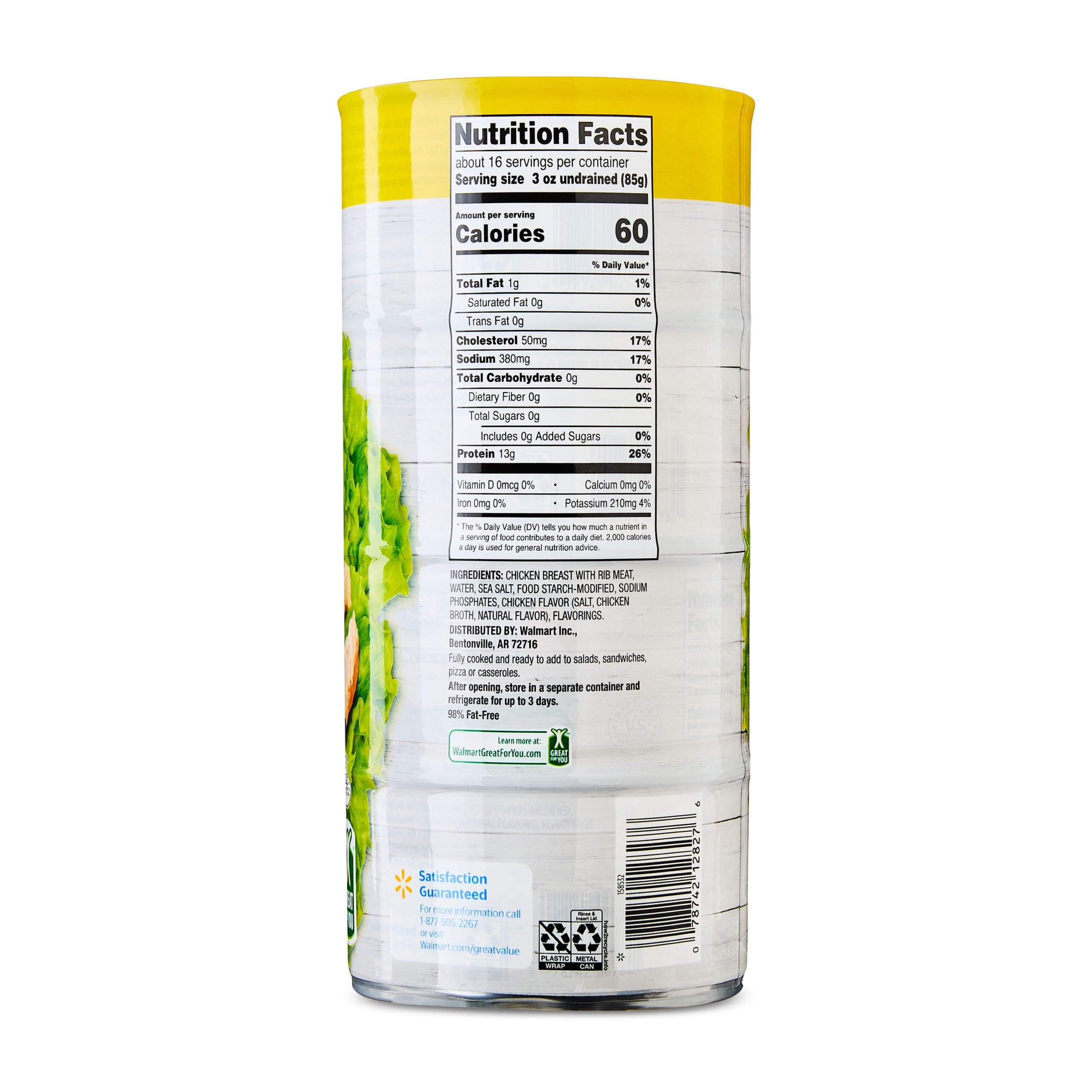 Add delicious taste and variety to your everyday meals with Great Value Chunk Chicken Breast. Each four-pack includes convenient 12.5 ounce cans, making it easy to keep a reliable protein on hand. Use it to whip up comforting soups, creamy casseroles, or a quick stir-fry when time is short. Try it as the star of tacos, enchiladas, or quesadillas for a hearty family dinner. Blend it with mayonnaise, celery, and onion for a classic chicken salad, or stir it into pasta and rice dishes for an easy one-pan meal. Fully cooked and ready to enjoy, this canned chicken helps you get dinner on the table fast. With 13 grams of protein per serving, it’s a low-calorie, gluten-free source of protein and potassium. Bring home the flavor and versatility of Great Value Chunk Chicken Breast.