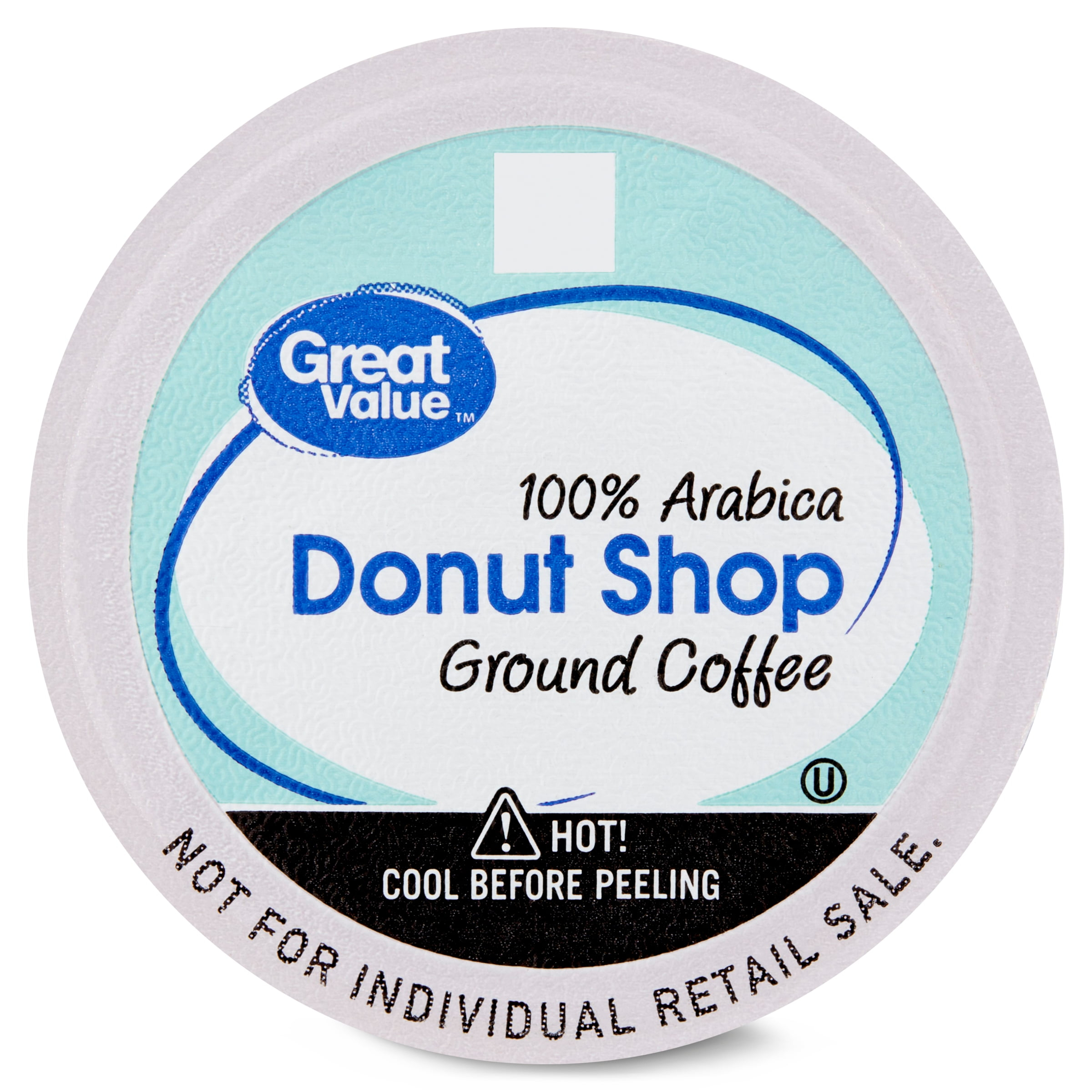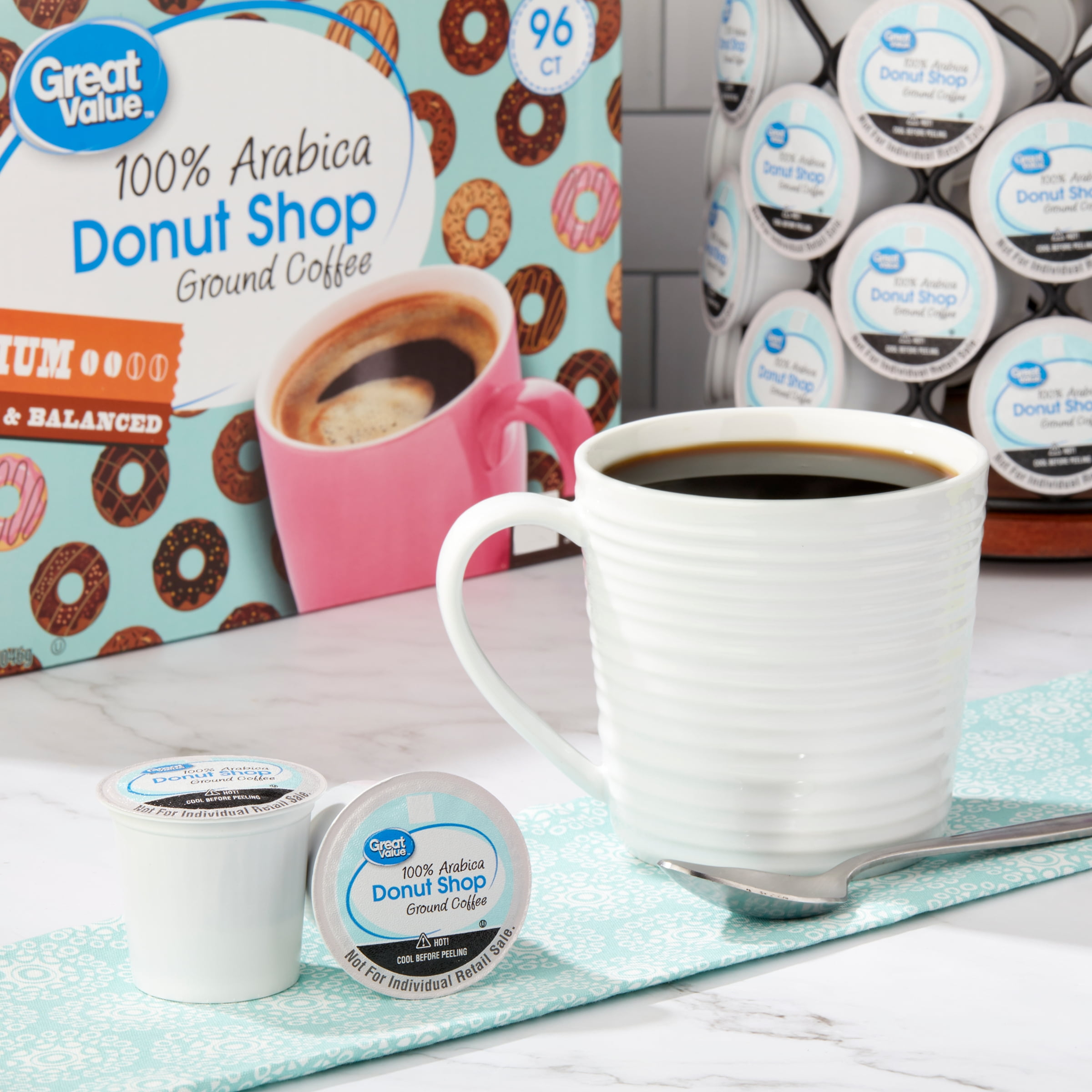 Start your day off the right way with a fresh, steaming cup of Great Value 100% Arabica Donut Shop Medium Ground Coffee. Bring the coffee house or donut shop experience to your home or office without the expense! This convenient package includes 48 single-serve cups that are compatible with any pod brewing system on the market. The medium roast Donut Shop blend features a bright and balanced flavor that will remind you of your favorite breakfast pastry or baked good. The perfect accompaniment to breakfast with family, brunch with friends, or afternoon pick-me-up, these single-serve cups will earn a permanent place in your pantry or break room. With Great Value 100% Arabica Donut Shop Medium Ground Coffee cups, you’ll have more time and energy to spend on the things in life that matter most.
