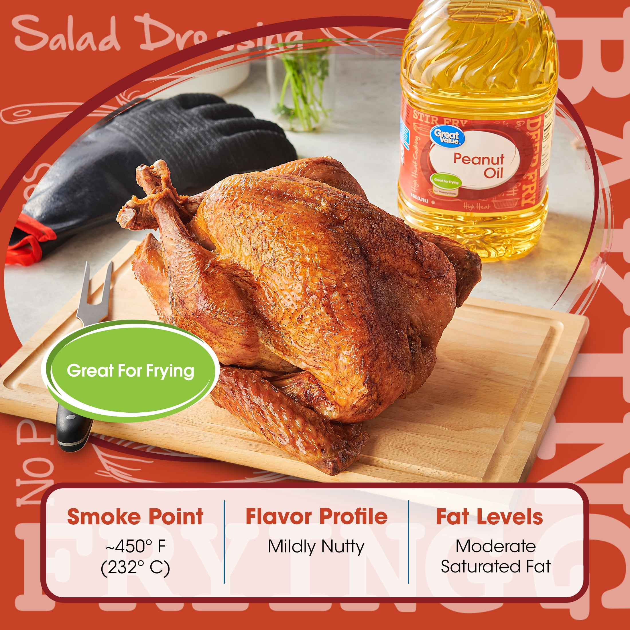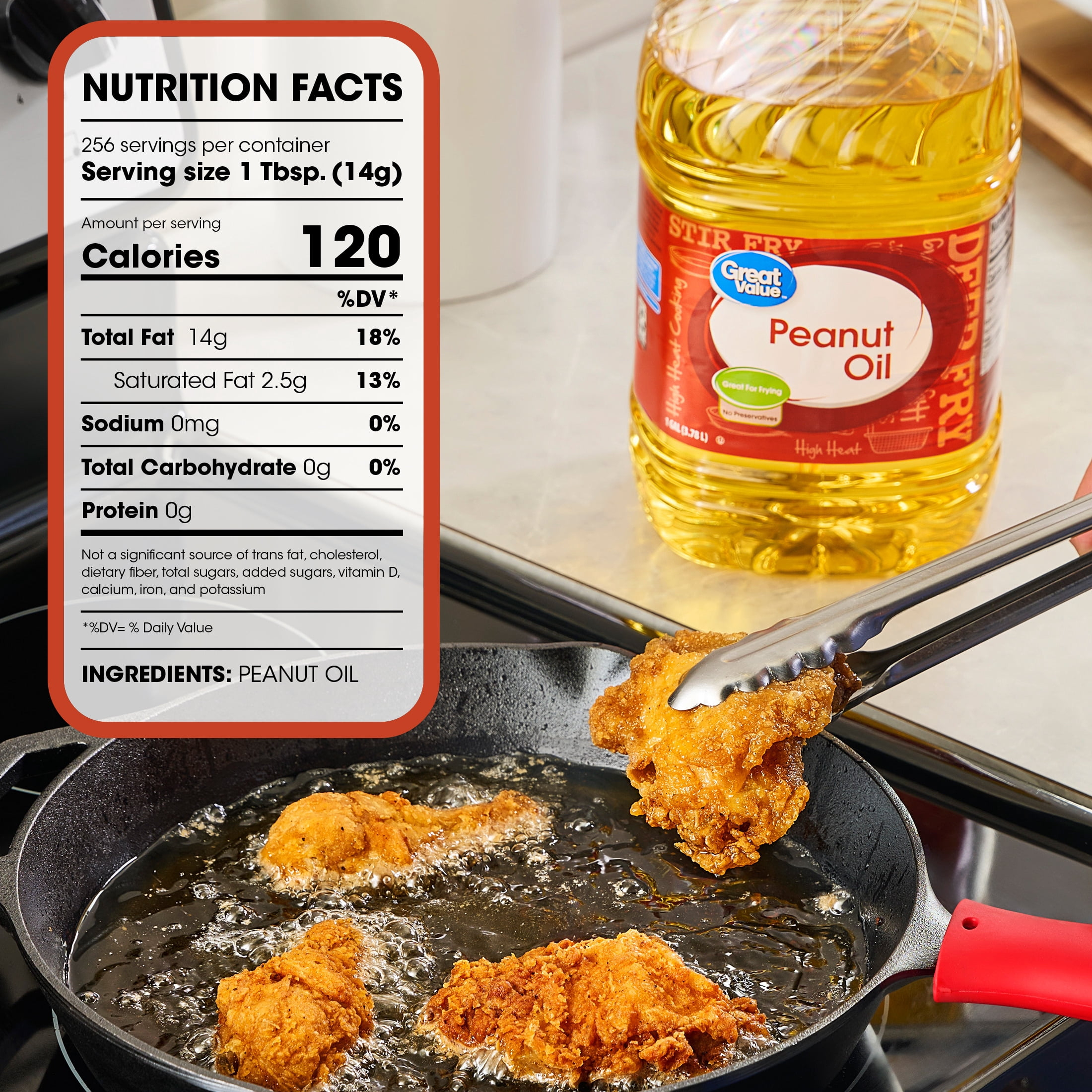 With a mellow flavor and a high smoke point, Great Value Peanut Oil can stand up to the hottest heat. Ideal for deep frying, it’s also great for searing steaks on the grill, sautéing vegetables, as well as whipping up salad dressings, dips, and sauces. Low in sodium and trans fat, it’s a versatile pantry staple for everyday cooking. Great Value Peanut Oil makes it easy to elevate your weeknight meals while sticking to your budget. Stock up and be ready for all your recipes with this convenient 1 gallon bottle.