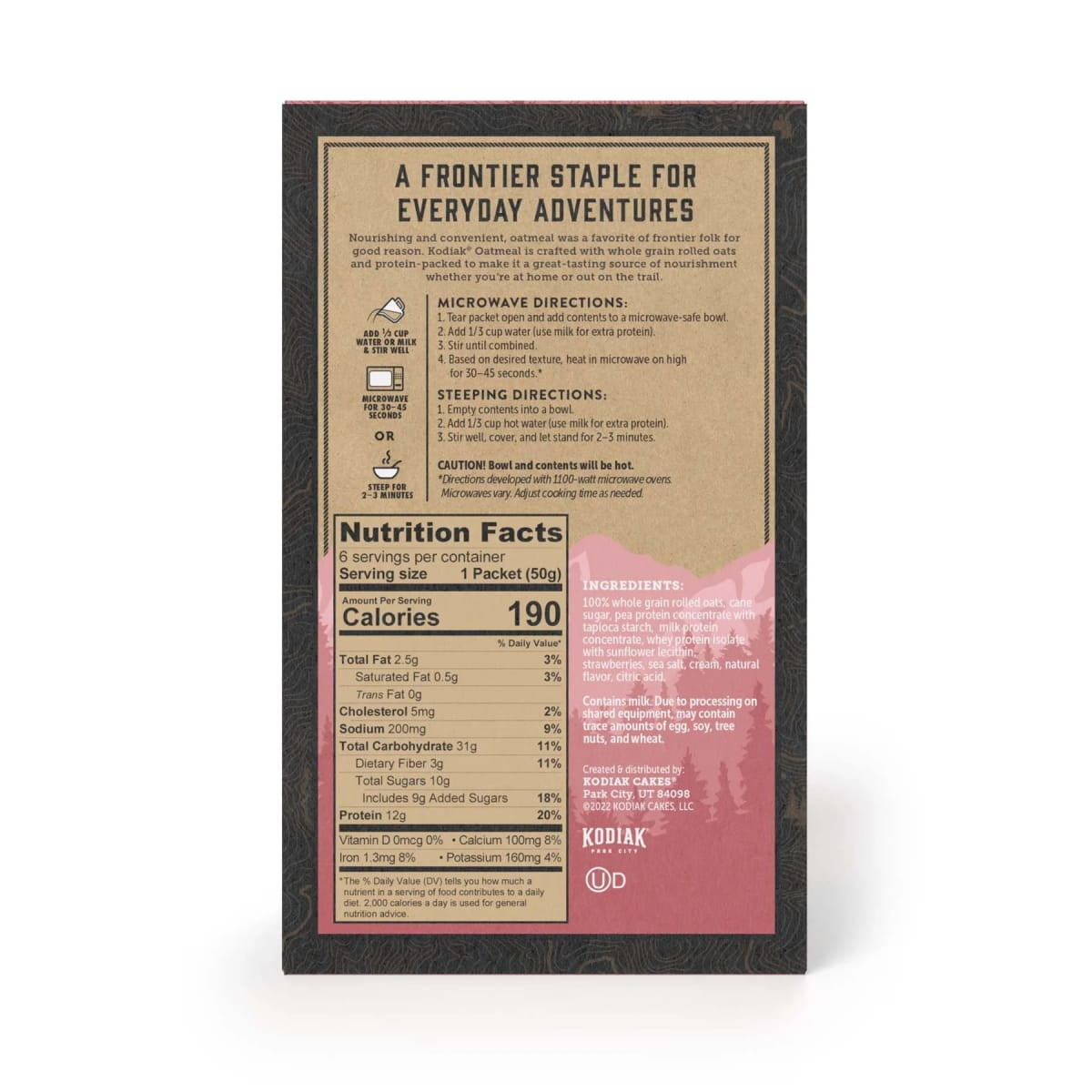 Start your morning strong with Kodiak Instant Oatmeal. Packed with 100% whole grains, strawberries, and cream, this protein oatmeal delivers 12 grams of protein per serving to help fuel your day. Convenient and easy to prepare, just add milk or water, microwave or steep, and enjoy a delicious, filling breakfast in minutes. Whether you’re at home, on the go, or exploring the great outdoors, Kodiak Oatmeal is there to keep you energized.