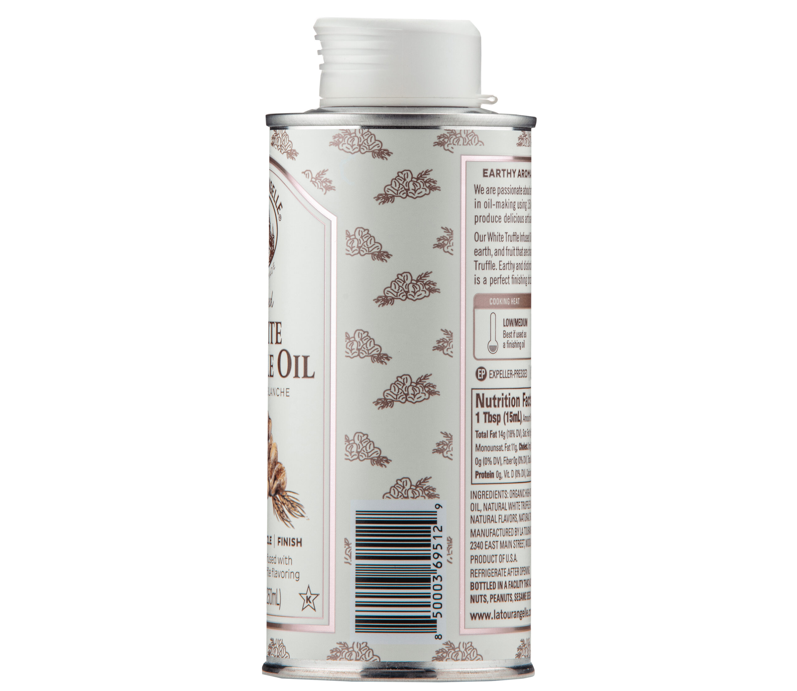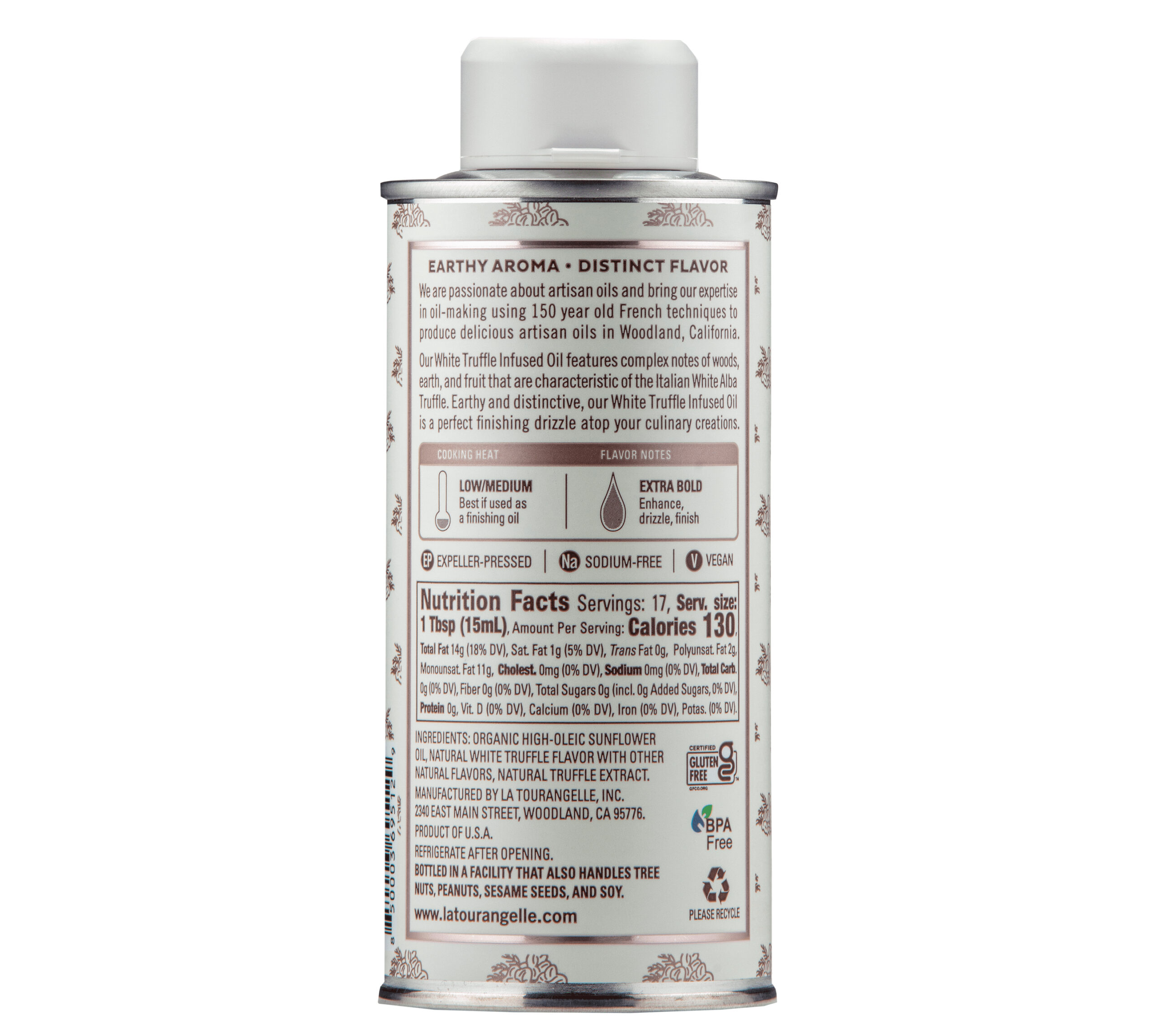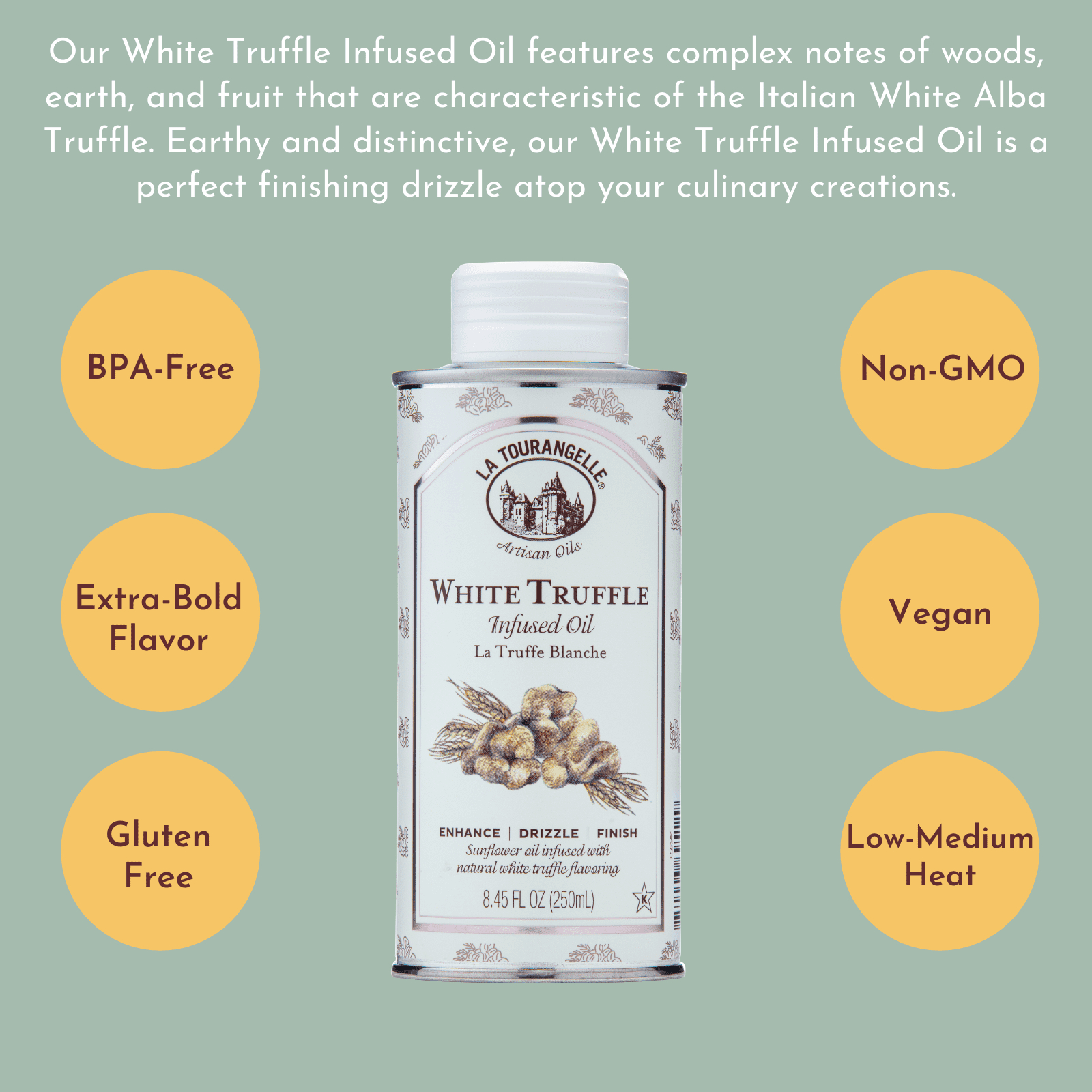 La Tourangelle, shelf-stable, White Truffle Infused Oil features complex notes of woods, earth, and fruit that are characteristic of the Italian White Alba truffle. Earthy and distinctive, our white truffle infused oil is a perfect finishing oil drizzled atop your culinary creations. White Truffle Infused Oil adds an intense, deep savory flavor of Italian White Alba Truffle to rich recipes and ingredients – fold into creamy mashed potatoes or drizzle over creamy soups, pastas, fries and pizza. This is a Vegan and non-GMO truffle oil that compliment your healthy dish.
