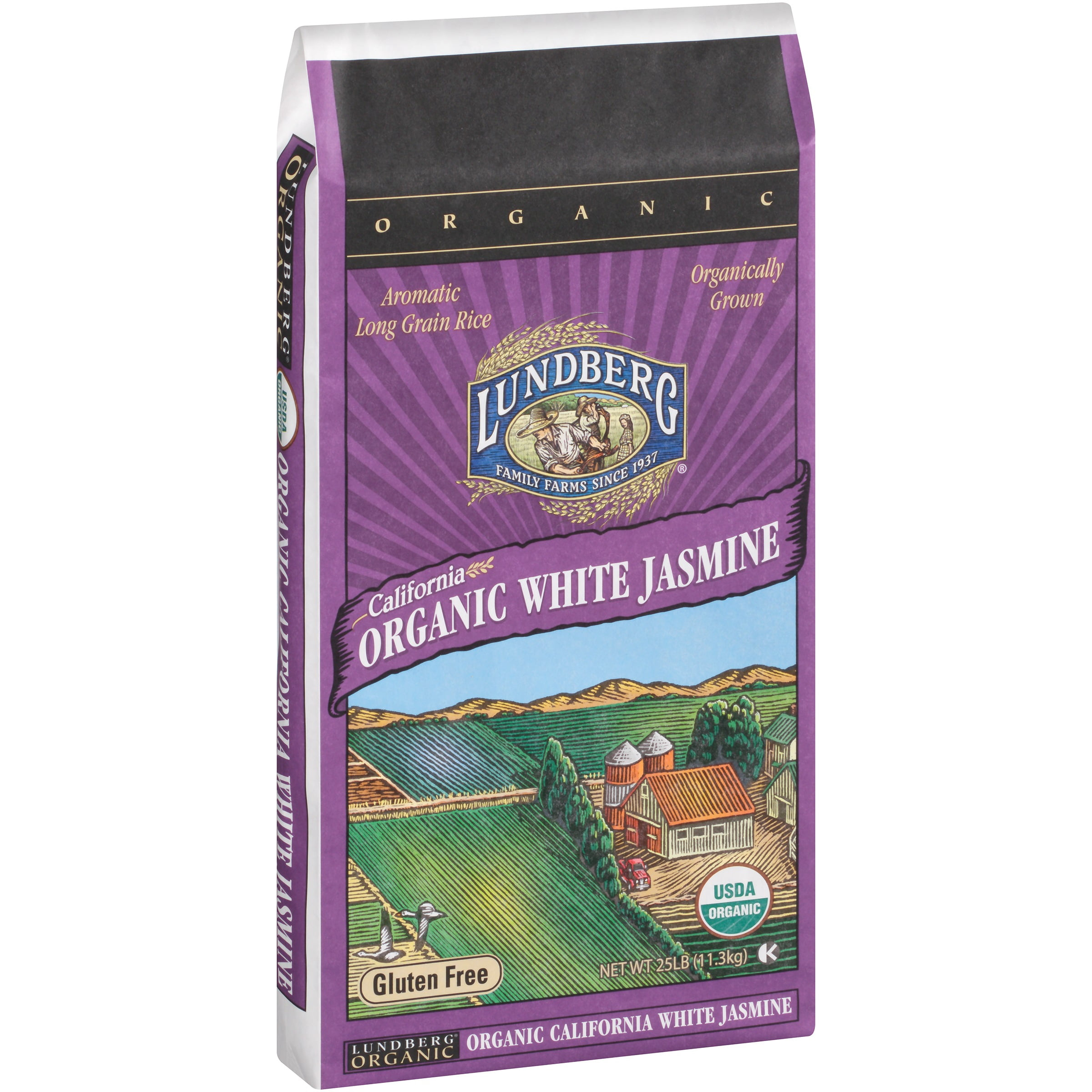 LUNDBERG FAMILY FARMS CALIFORNIA WHITE JASMINE RICE IS AN AROMATIC LONG GRAIN RICE YOUR FAMILY WILL LOVE. FRAGRANT, COLORFUL AND DELICIOUS, THIS RICE IS A PERFECT ADDITION TO MEALS WHEN POTATOES JUST WON’T DO. VERSATILE ORGANIC GOODNESS AND LIGHT SOFT TEXTURE WILL MAKE THIS RICE AN INSTANT HIT WITH CHILDREN. EACH BAG OF LUNDBERG FAMILY FARMS CALIFORNIA WHITE JASMINE RICE CONTAINS 25 LBS. OF PRODUCT, TRANSLATING INTO ABOUT 252 SERVINGS AND 160 CALORIES PER SERVING. SEE NUTRITION FACTS PANEL FOR ALLERGENS.