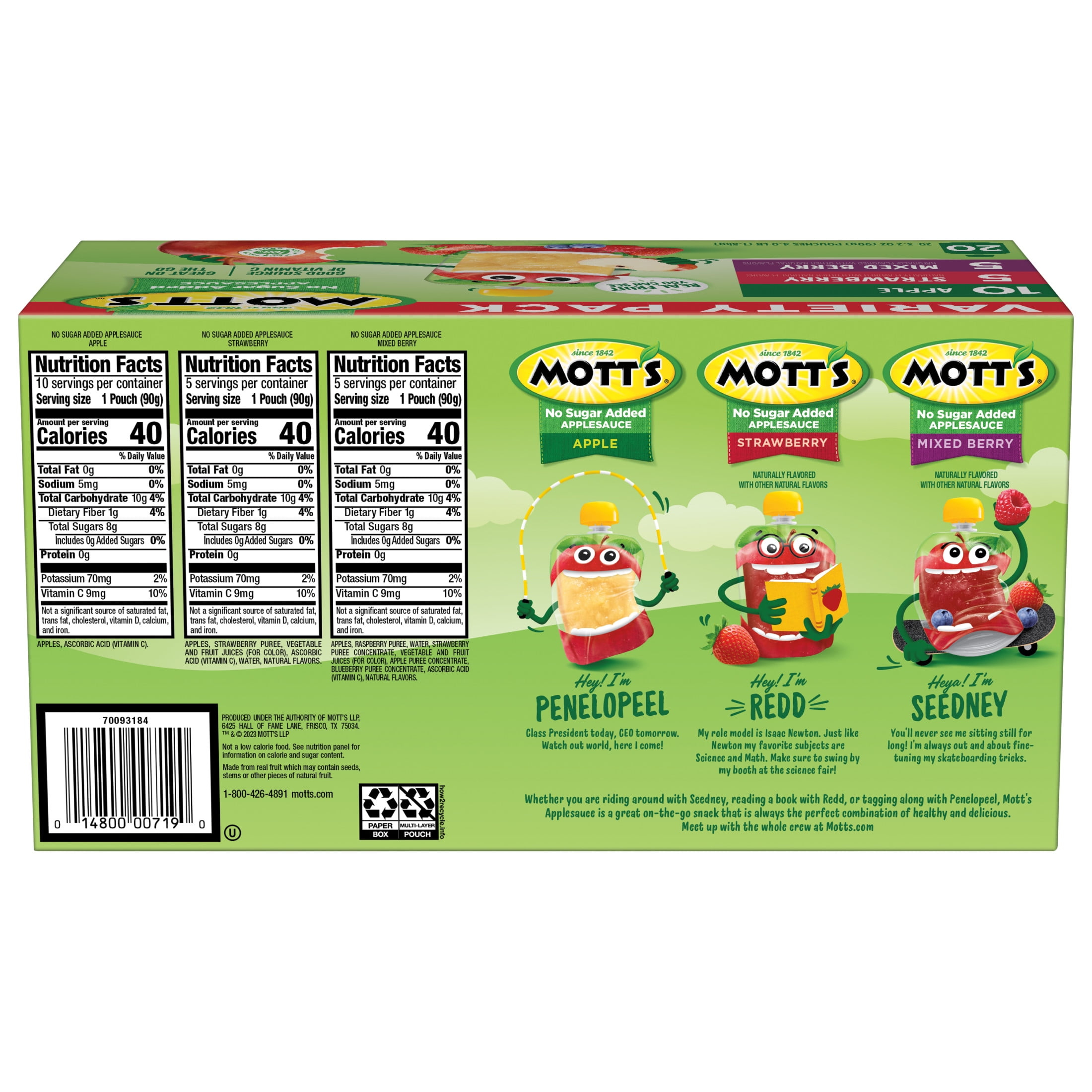 The original, delicious treat, Mott’s No Sugar Added Applesauce Variety Pack is the perfect snack or meal companion. Available in 12- or 20-packs, Mott’s Applesauce comes in refreshing flavors like our appetizing Apple, sweet Strawberry, and tart Mixed Berry so you’ll be sure to find something that satisfies your taste buds. Made with 100% real fruit and no artificial flavors, you can feel good about making healthy choices. A good source of Vitamin C and free of cholesterol, Mott’s No Sugar Added Applesauce Variety Pack brings the best of the orchard to your household to help families enjoy delicious fruit goodness every day. Mott’s has a strong heritage and has been the trusted apple juice and sauce brand since 1842. Dedicated to giving parents easy ways to help their families be their very best, Mott’s holds the apples to a very high standard. That’s why we pack lots of delicious fruit flavor from ripe apples into every serving. So, whether you’re home with your family or on the go and in need of a snack, Mott’s has a delicious flavor to enjoy. With an extensive suite of flavors, Mott’s No Sugar Added Applesauce Variety Pack gives you flavorful choices for all your snacking needs!