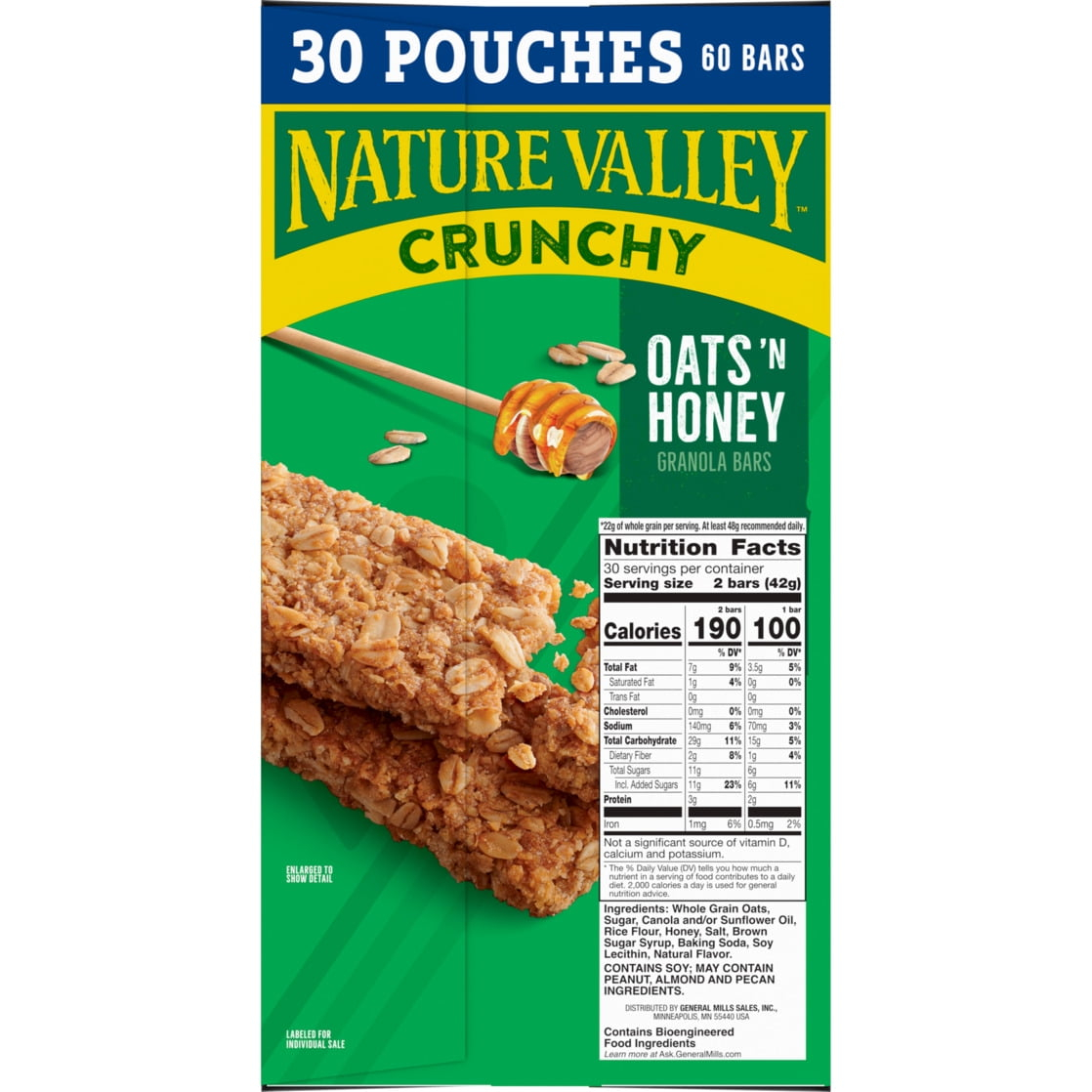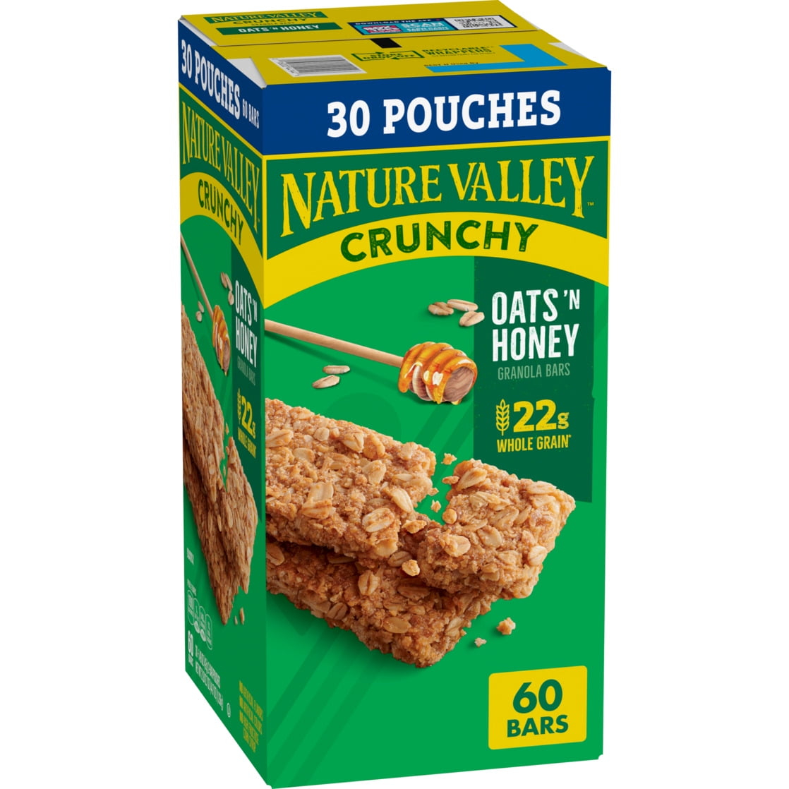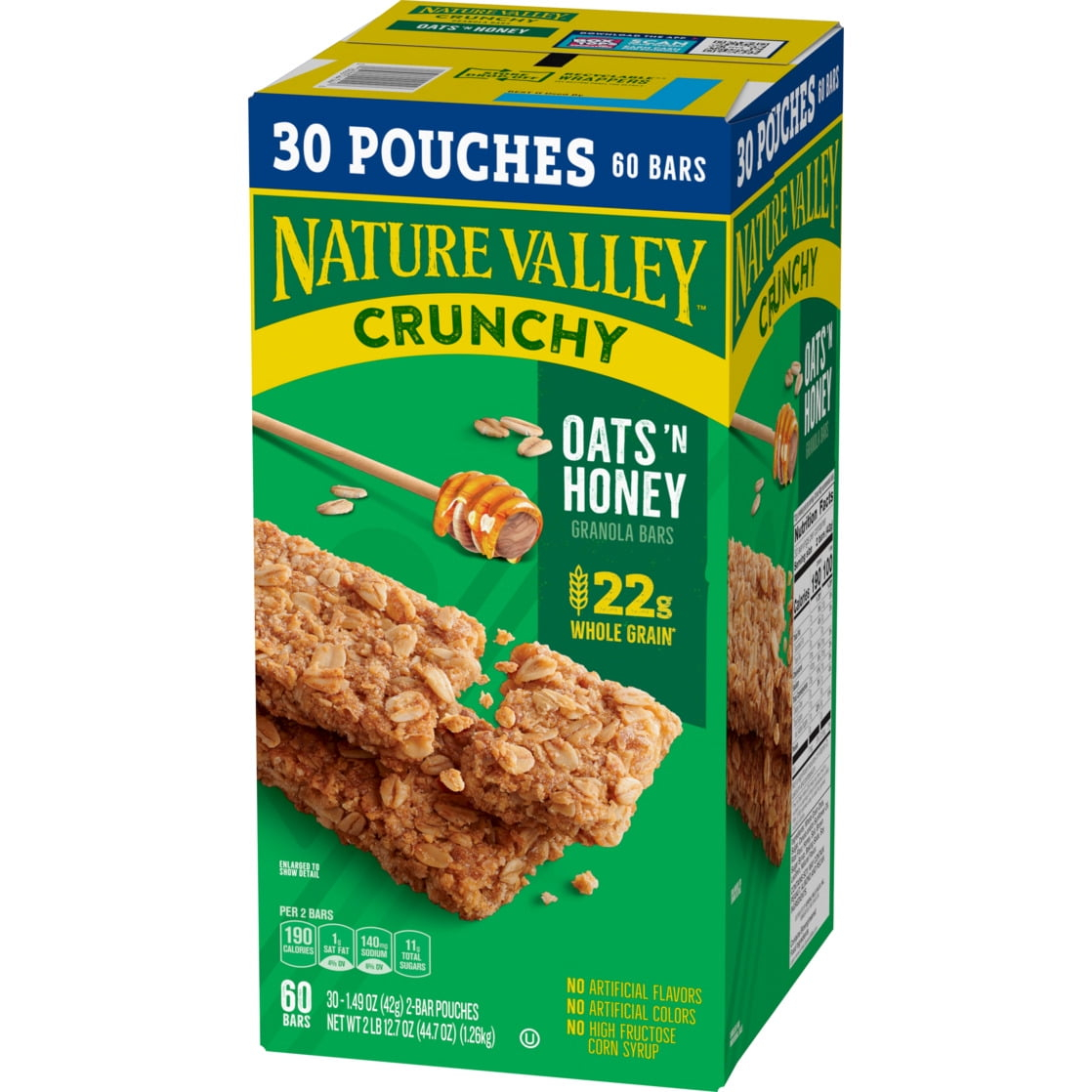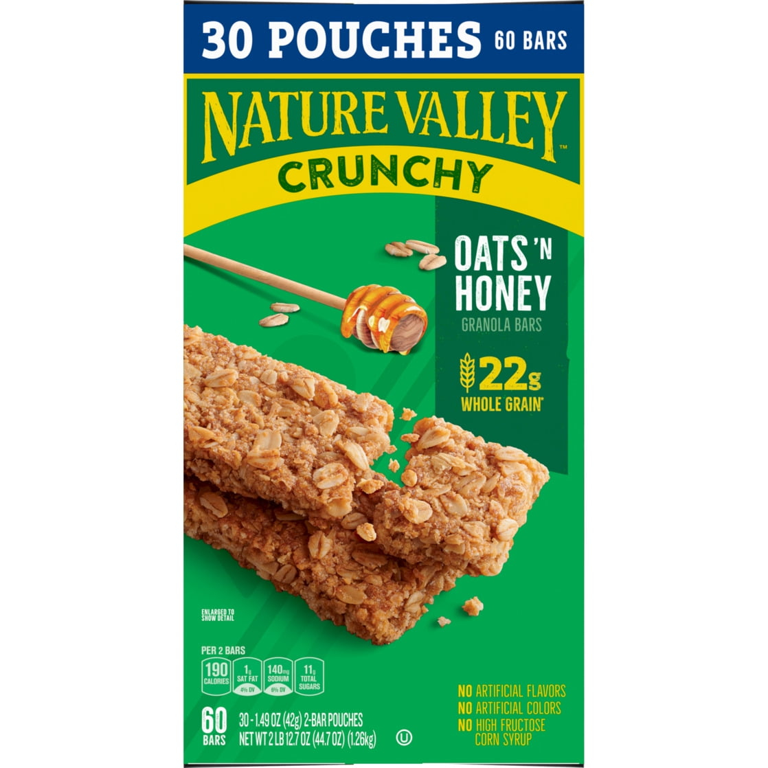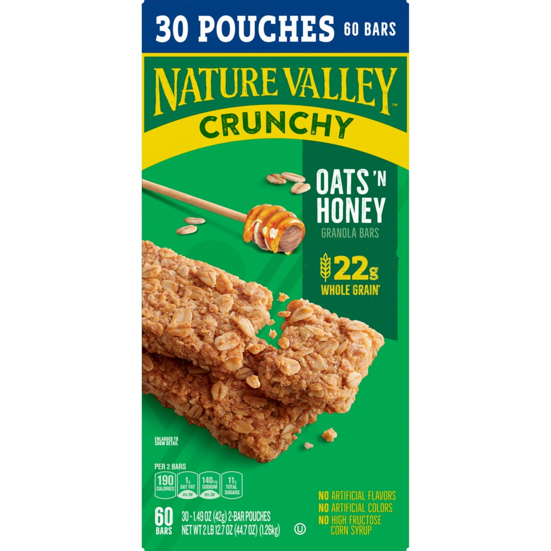 The Original Crunch. Nature Valley Oats ‘n Honey Crunchy Granola Bars are a tasty snack made with whole-grain oats and a touch of honey. A portable snack perfect for the pantry, lunch box, and hiking trail. There are no artificial flavors, colors or high fructose corn syrup, and these snack bars contain 22g of whole grain per serving (at least 48g recommended daily). It’s a breakfast snack bar, an office snack or an on-the-go treat everyone in your household can enjoy. At Nature Valley, we believe that what you put in is what you get out. So wherever the moment takes you and your family, you can rely on our great-tasting snacks to help keep you going. Includes 15 two-bar pouches, 30 bars total.
