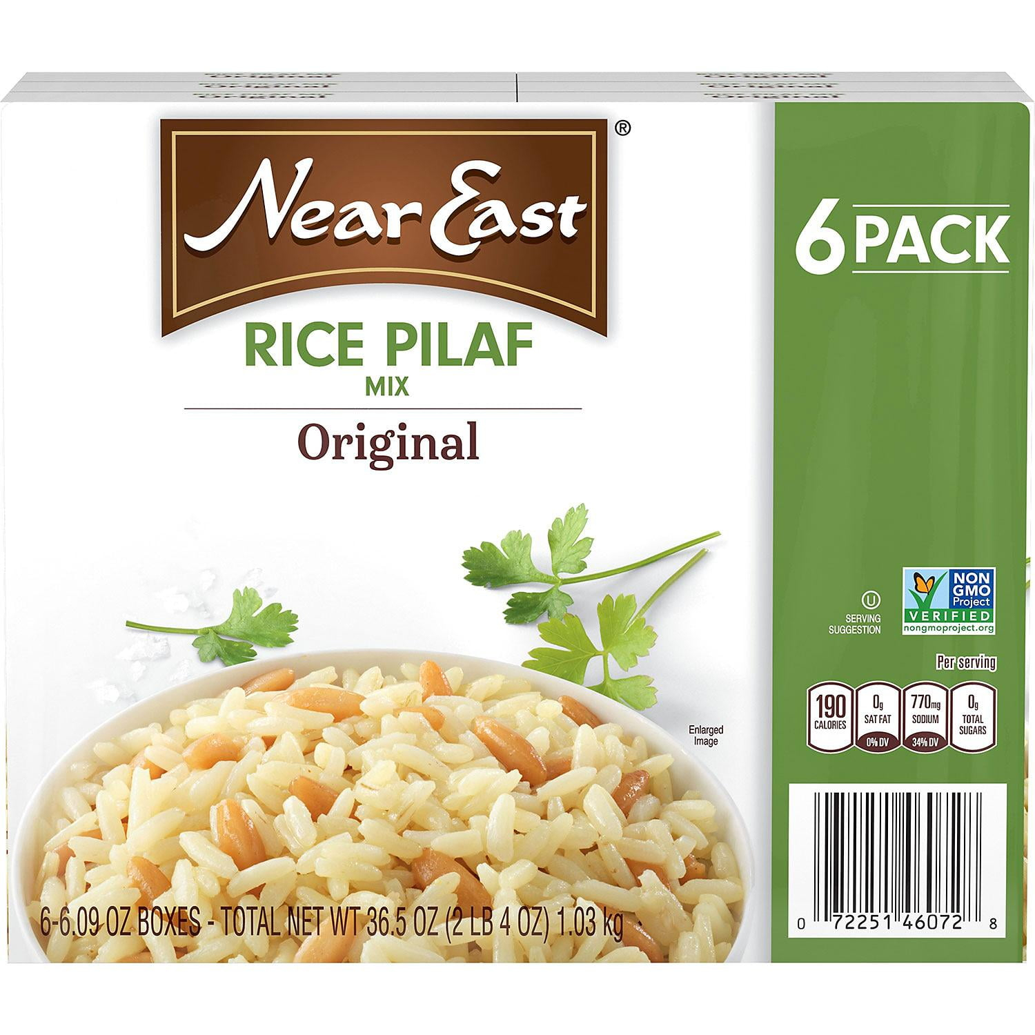 Near East Rice Pilaf (6.9 oz., 6 pk.). Premium long grain rice, toasted orzo and a delicious blend of herbs and spices. Made with 100% natural, certified kosher ingredients. Cooks in five minutes; a quick and creative alternative to pasta or rice. Separate seasoning packet contains a blend of herbs and spices to create for an authentic flavor from around the world