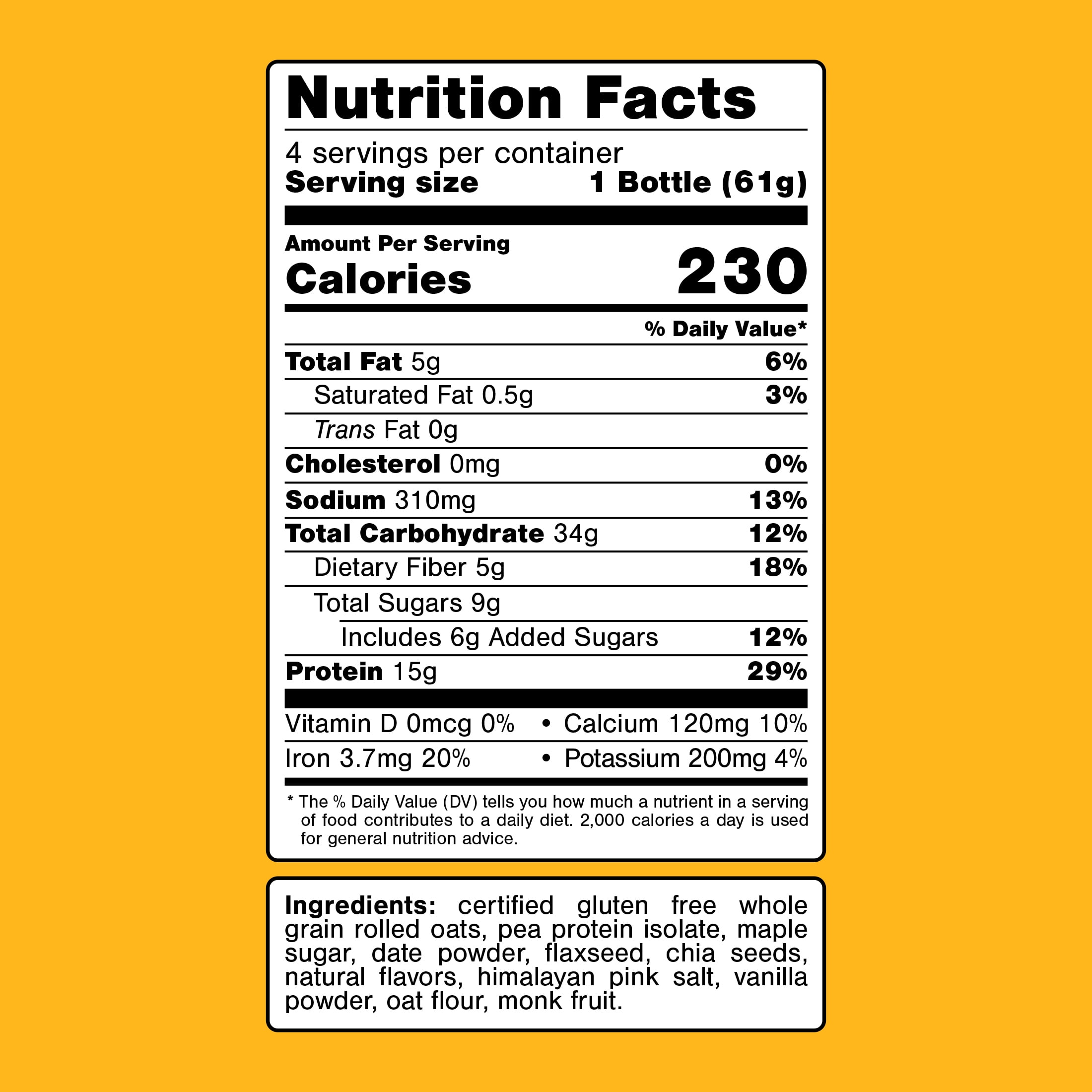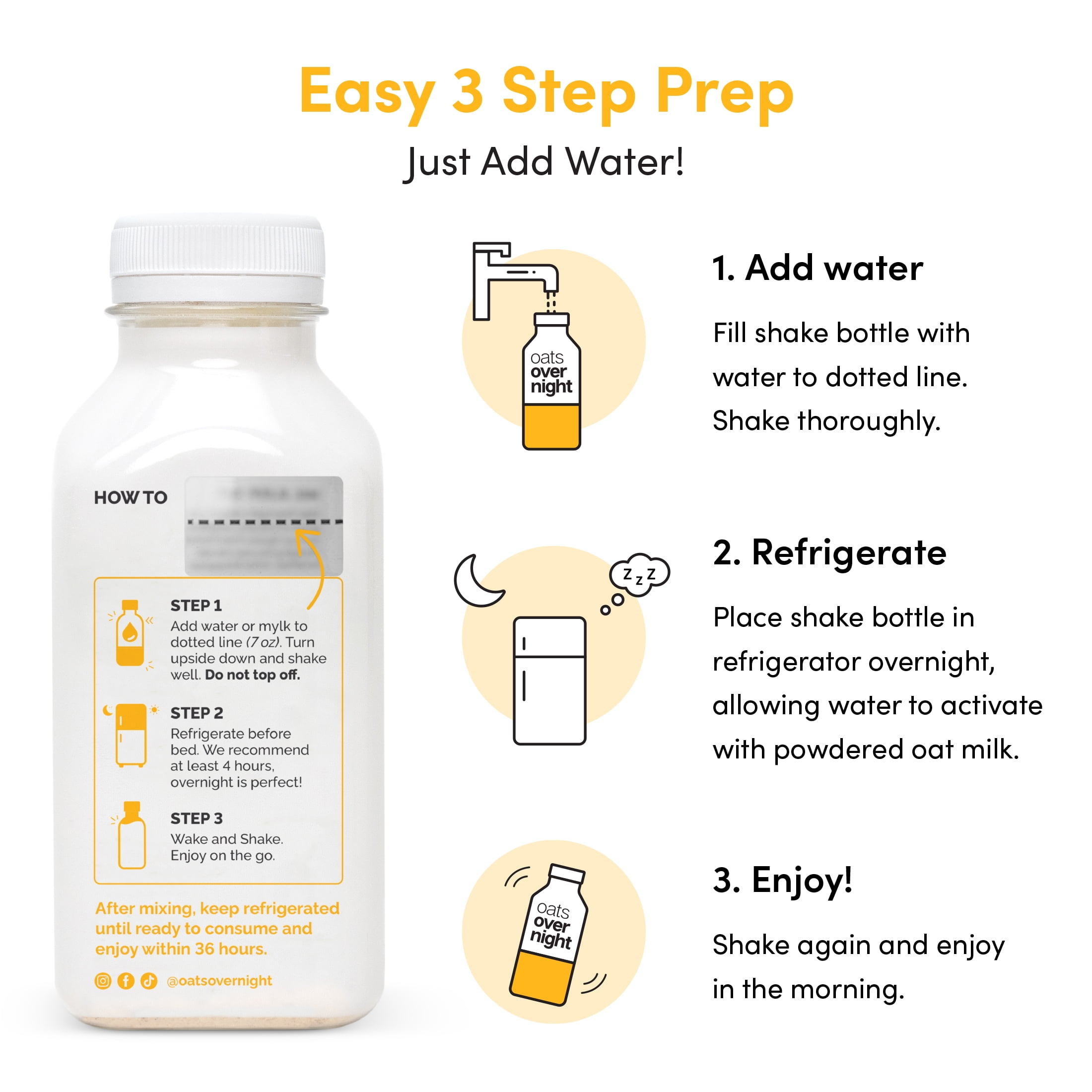 Oats Overnight protein overnight oatmeal shakes are the perfect start to your day. Simply fill with water and leave in the fridge overnight – evening prep in less than 10 seconds! With 15g of protein, high fiber, and low sugar, these shakes are a fantastic complete breakfast, meal replacement, or afternoon snack. Always sourced with clean, natural ingredients, our whole grain oats are certified non-GMO and gluten-free.