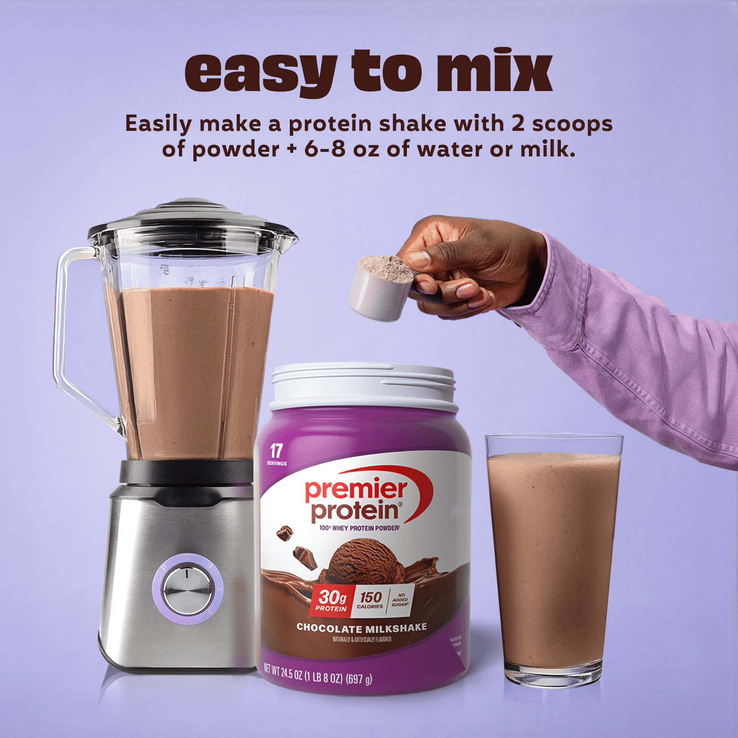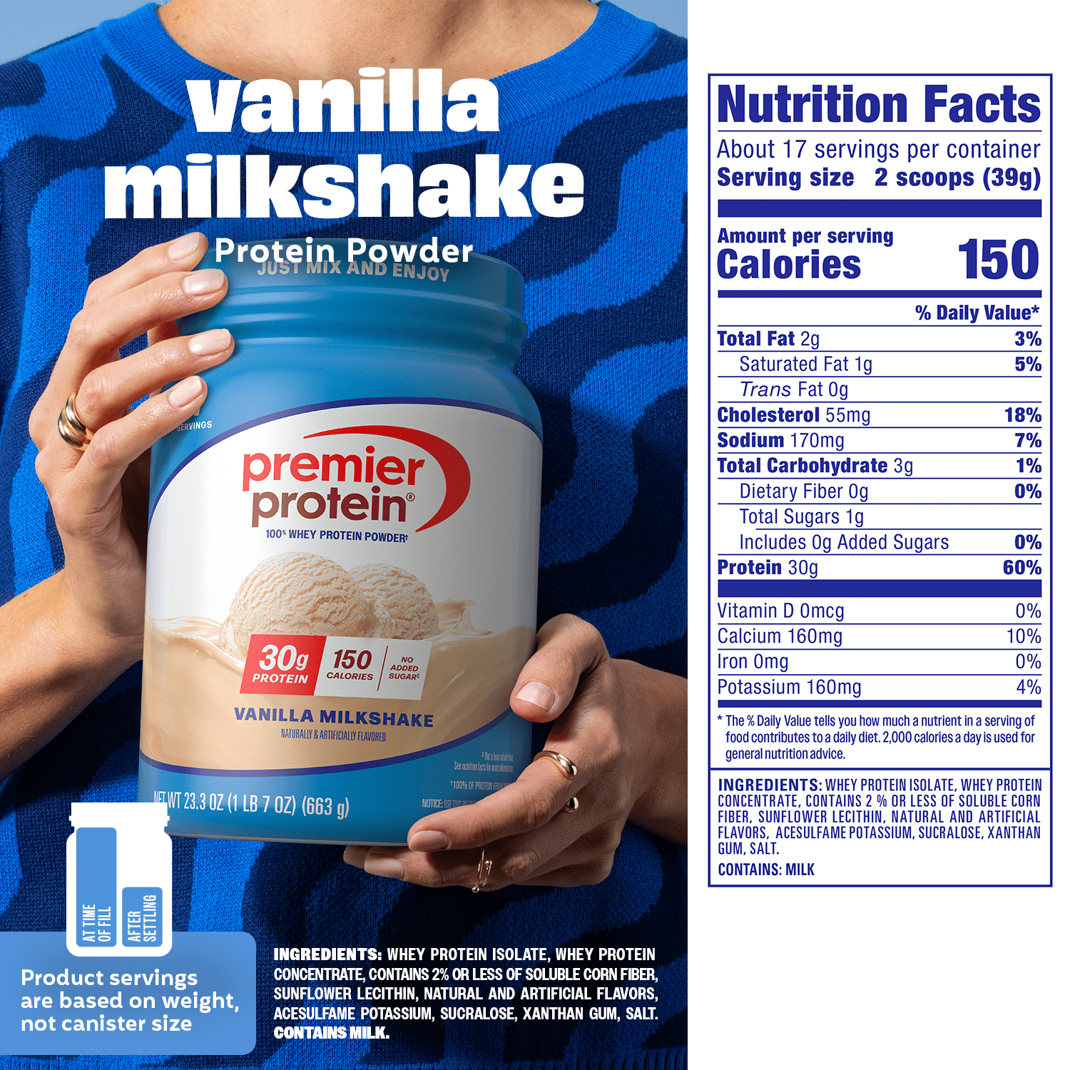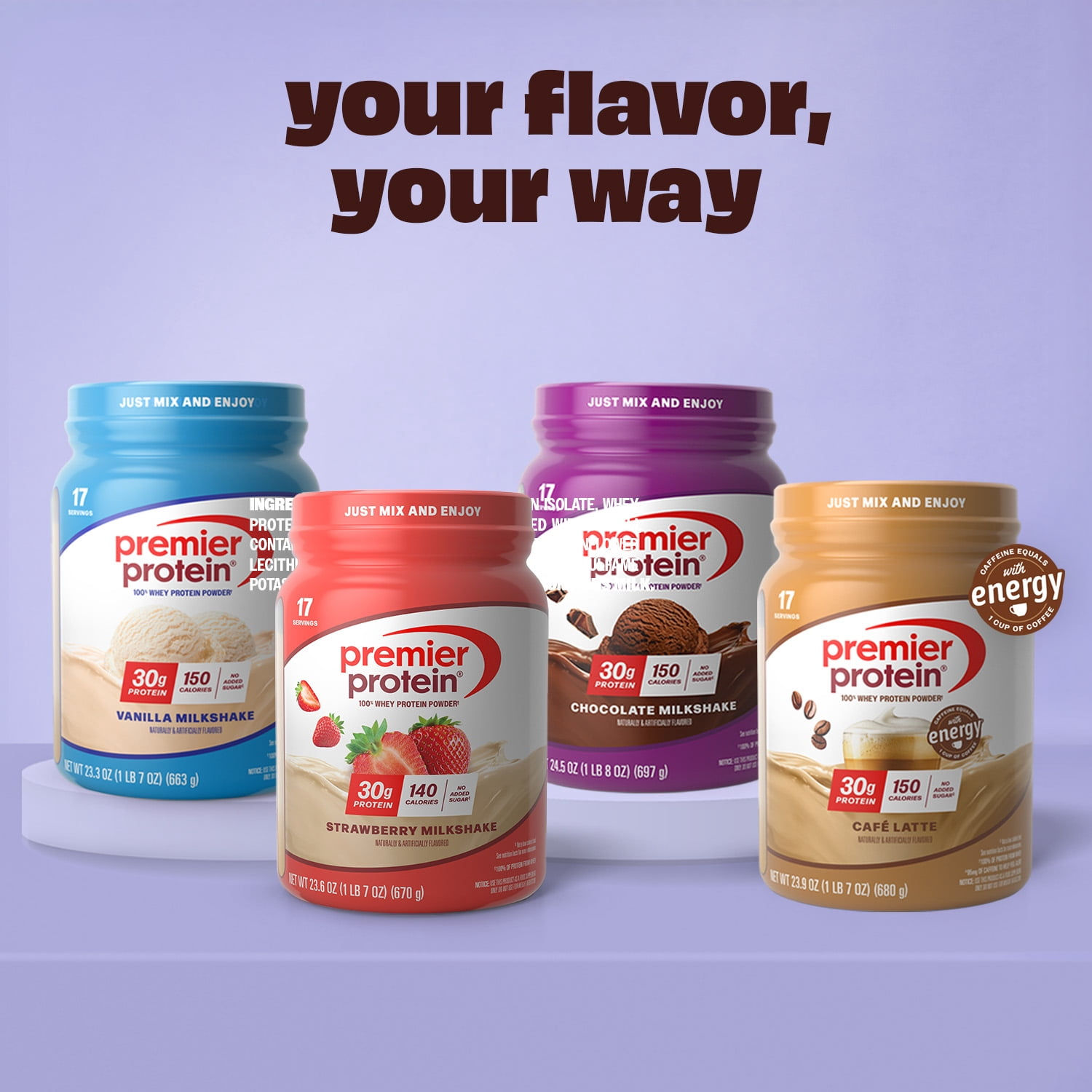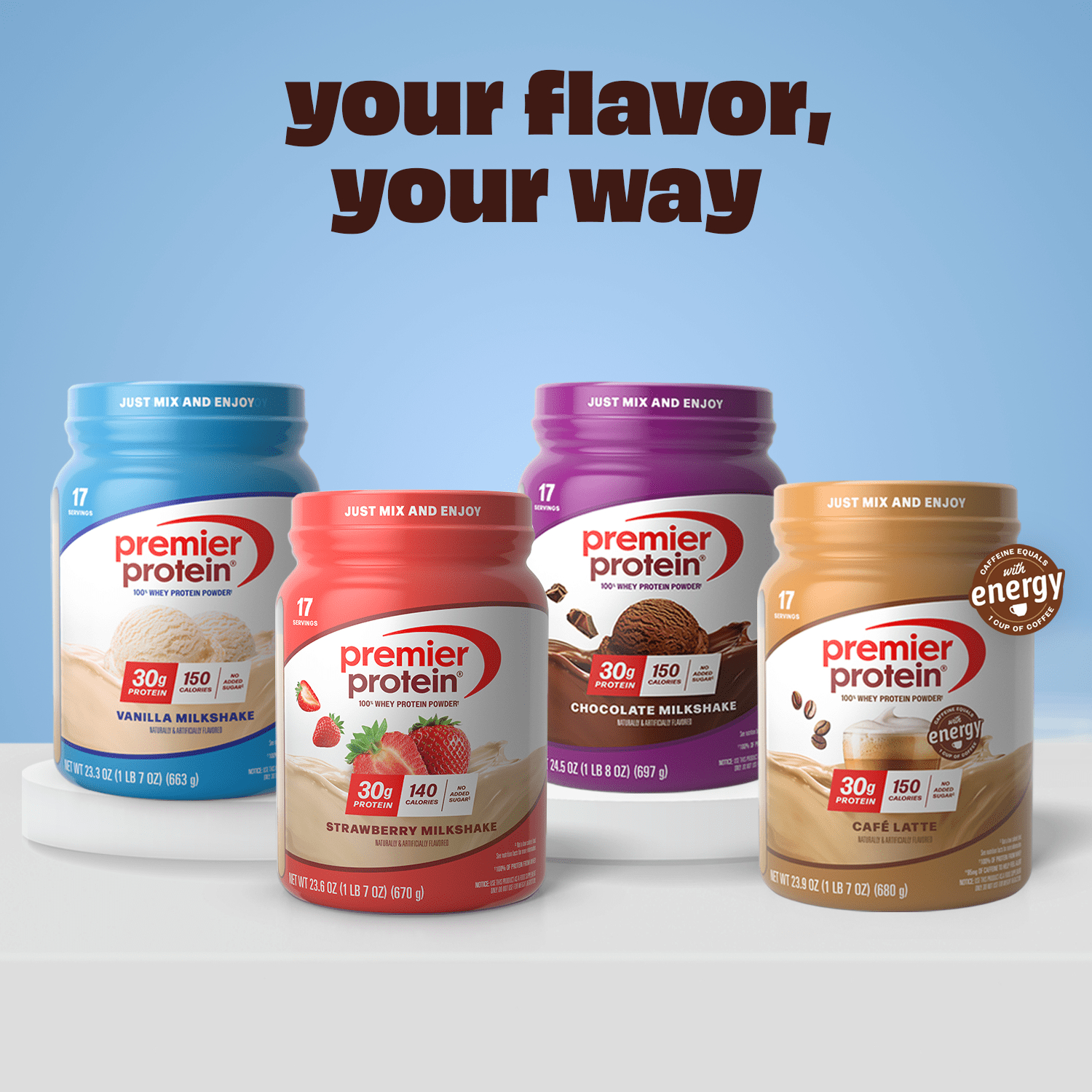 Enjoying something sweet and delicious shouldn’t mean you’ve lost track of your health and fitness goals. Premier Protein packs powerful nutrition and amazing flavor into each one of its protein powders. Each serving of Premier Protein Powder contains 30g protein, 150 calories, and 1g sugar. Gluten free & made with 100% protein from whey, it is perfect for use any time of the day, from breakfast to afternoon snack to post-exercise fuel. Try it mixed with water or milk, blended into your favorite smoothie recipe, or baked into protein packed recipes. Each canister contains 17 servings. Available in 3 delicious, indulgent flavors: Café Latte, Chocolate Milkshake and Vanilla Milkshake.