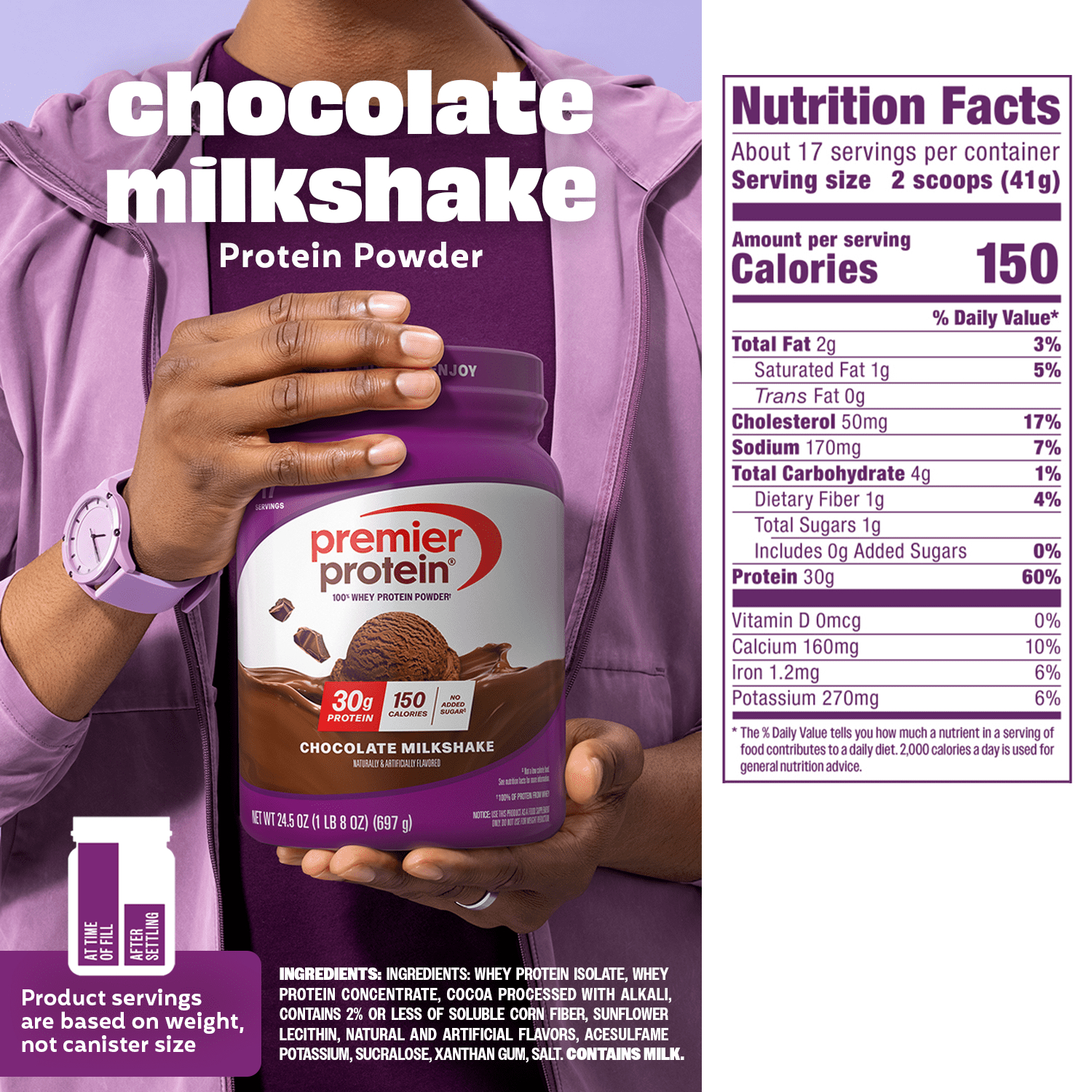 Enjoying something sweet and delicious shouldn’t mean you’ve lost track of your health and fitness goals. Premier Protein packs powerful nutrition and amazing flavor into each one of its protein powders. Each serving of Premier Protein Powder contains 30g protein, 150 calories, and 1g sugar. Gluten free & made with 100% protein from whey, it is perfect for use any time of the day, from breakfast to afternoon snack to post-exercise fuel. Try it mixed with water or milk, blended into your favorite smoothie recipe, or baked into protein packed recipes. Each canister contains 17 servings. Available in 3 delicious, indulgent flavors: Café Latte, Chocolate Milkshake and Vanilla Milkshake.
