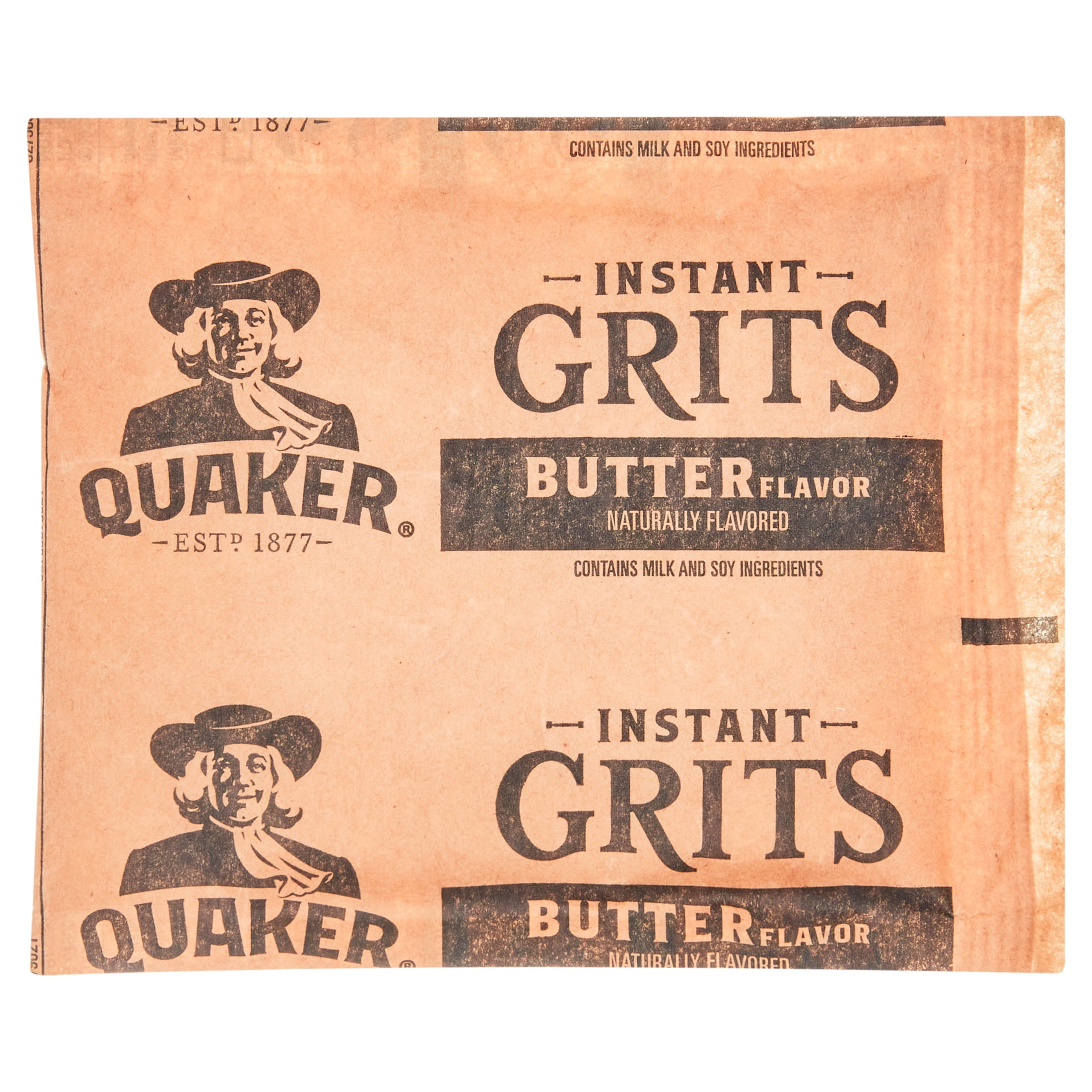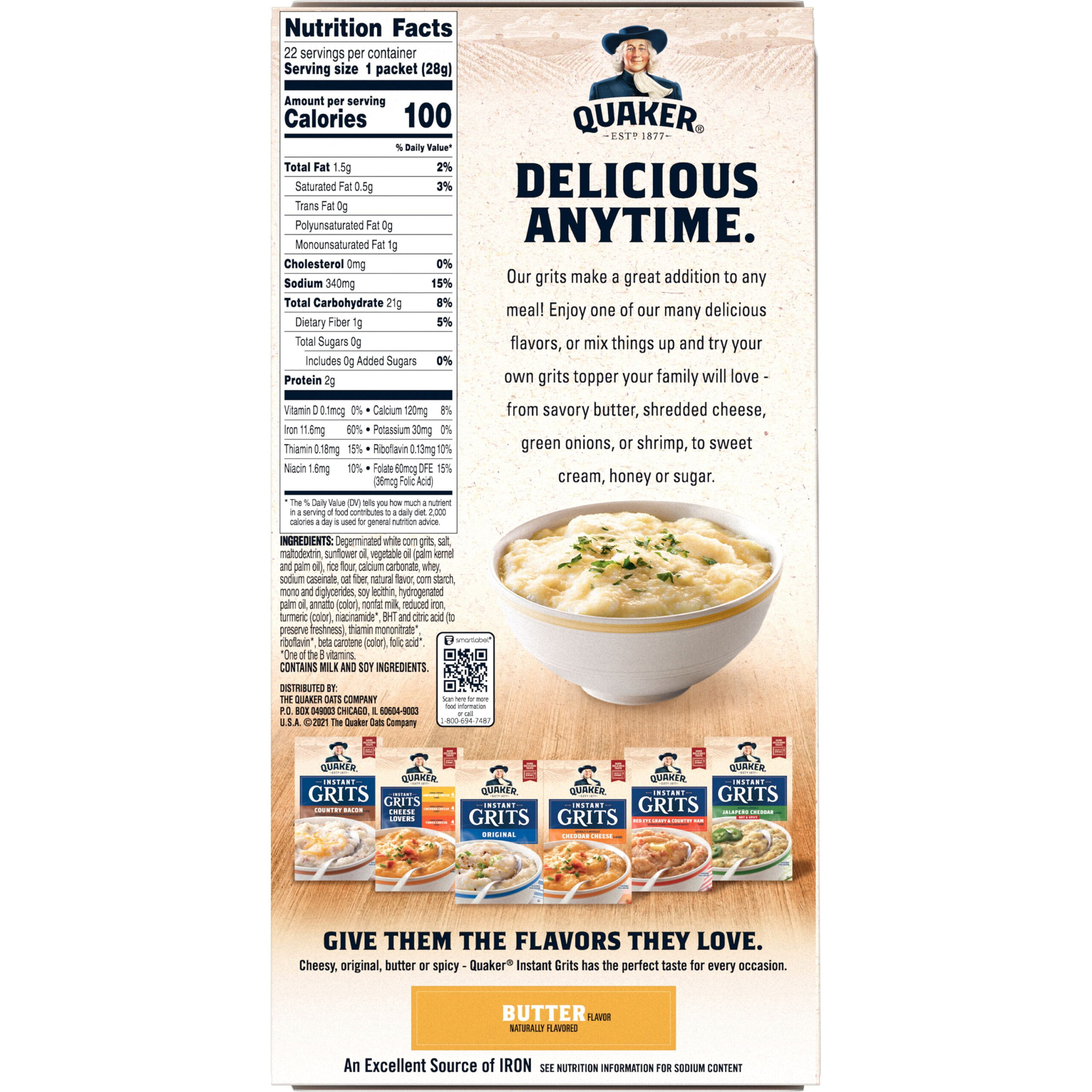 Quaker Instant Grits, butter flavor, naturally flavored. Tastes good like old fashioned original grits, buttery flavor, also comes in several other flavors. Serving size 1 packet (28g), amount per serving 100 calories. Comes in a regular sized box or a 22 packet Value Pack. Ready in 2 minutes. Great for a quick Breakfast.