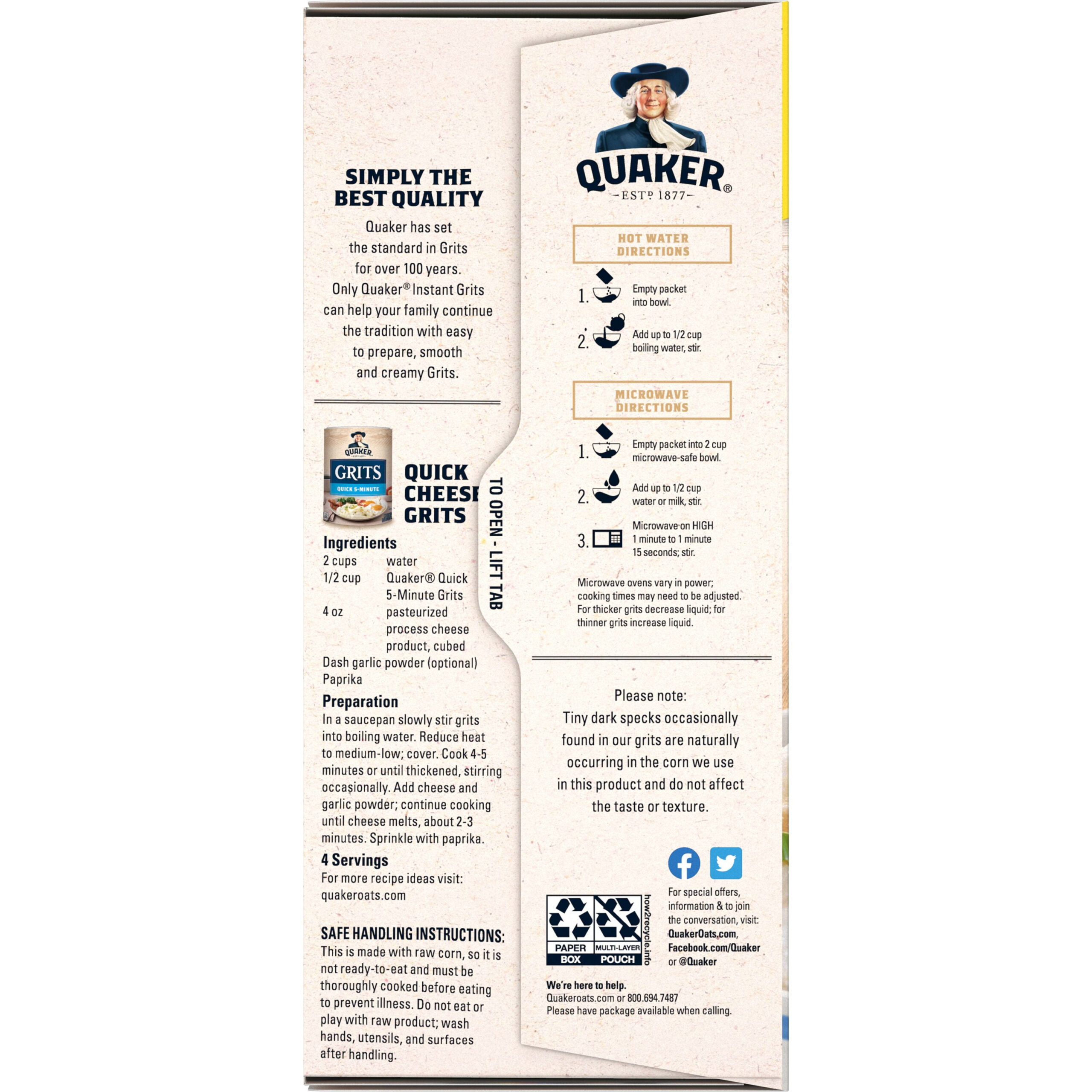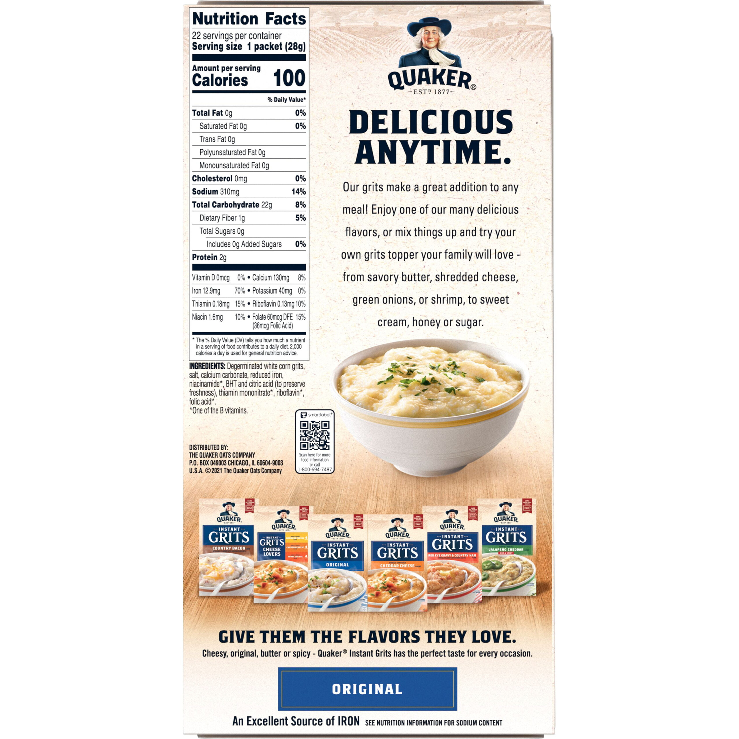 Quaker Instant Grits Original is the perfect choice for a quick and hearty meal! This 22-count pack includes convenient 0.98 oz packets of classic, creamy grits that are ready in just minutes. Enjoy them as a savory side dish or a delicious base for your favorite toppings. With their rich flavor and smooth texture, these grits make for a satisfying breakfast or snack any time of day. Easy to prepare and versatile, they’re a must-have in your pantry! Food form: Grits.