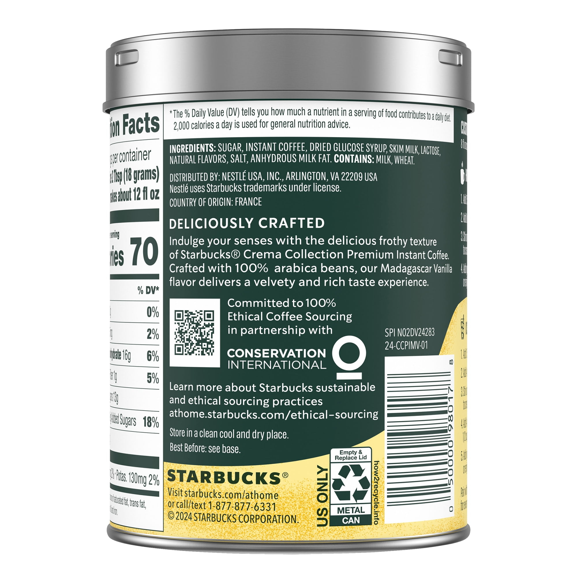 Indulge your senses with an instant uplift from Starbucks Crema Collection Premium Instant. Crafted with the same high-quality 100% arabica beans we brew in our cafés, Madagascar Vanilla delivers a velvety and rich taste experience in an instant. Customize your cup the way you like it—hot or iced, and with a smooth and delicious, frothy texture that doesn’t require expensive equipment or intricate techniques. As part of our commitment to sustainable practices, our tins are recyclable. Nestlé uses Starbucks trademarks under license. NET WT 7.12 OZ (202 g)