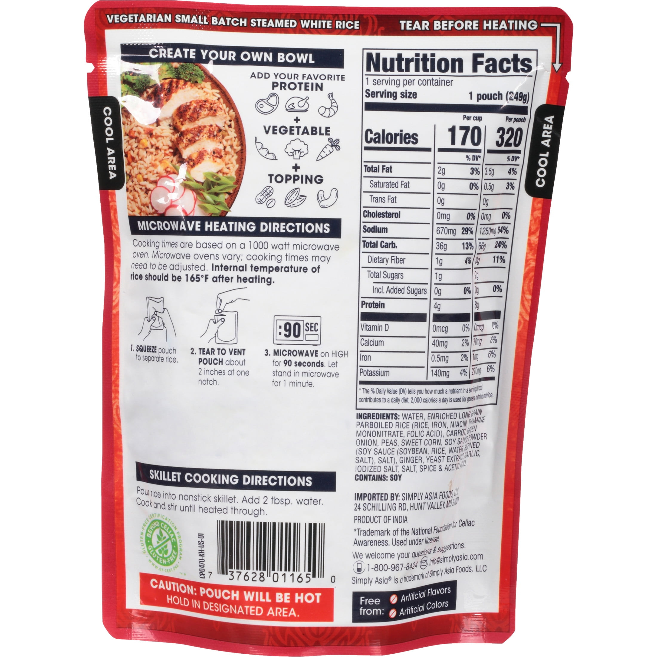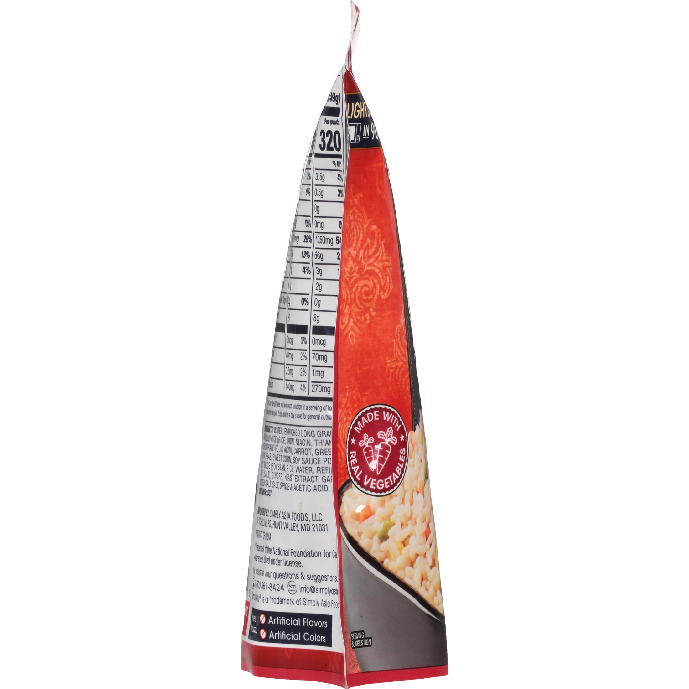 Thai Kitchen Non-GMO Ready to Heat Fried Rice, 8.8 oz Pouch. Satisfy your craving for fried rice in seconds with Thai Kitchen Ready to Heat Fried Rice. It’s the ultimate in speed and convenience, simply pop the pouch into the microwave and heat for 90 seconds for light and fluffy fried rice made with real vegetables. Plus, cleanup a snap with the disposable pouch! Seasoned with soy sauce, ginger and garlic and studded with carrot, peas and corn, our fried rice is ready to serve as a side dish. Or, create a rice bowl meal by topping with a protein like scrambled eggs, tofu or leftover cooked chicken or shrimp. Add some extra veggies and a crunchy or nutty topping and dinner is served. Fully cooked and ready to heat, our fried rice is certified non GMO and gluten-free, and is free from artificial flavors or colors. This Thai Kitchen Ready to Heat Fried Rice is in a Cardboard pouch that is 8.8 ounces. Store this shelf-stable item at an ambient temperature.