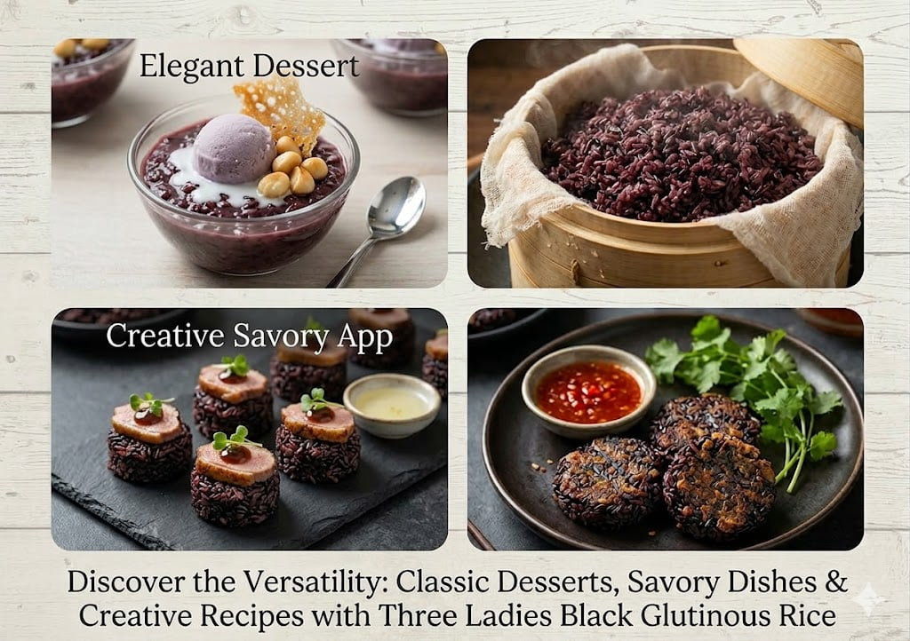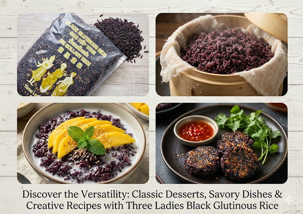 Three Ladies Black Black Glutinous Rice or Black Sticky Rice is known for its superior quality. It is long-grain. Black Sticky Rice is grown mainly in Thailand. It is black when uncooked and turns purple when steamed. It is sticky, chewy and gummy in texture. It is often used in many variety of Thai desserts. You can use it on its own or mix it with white sticky rice for lighter and softer texture. Net Wt: 5 lbs