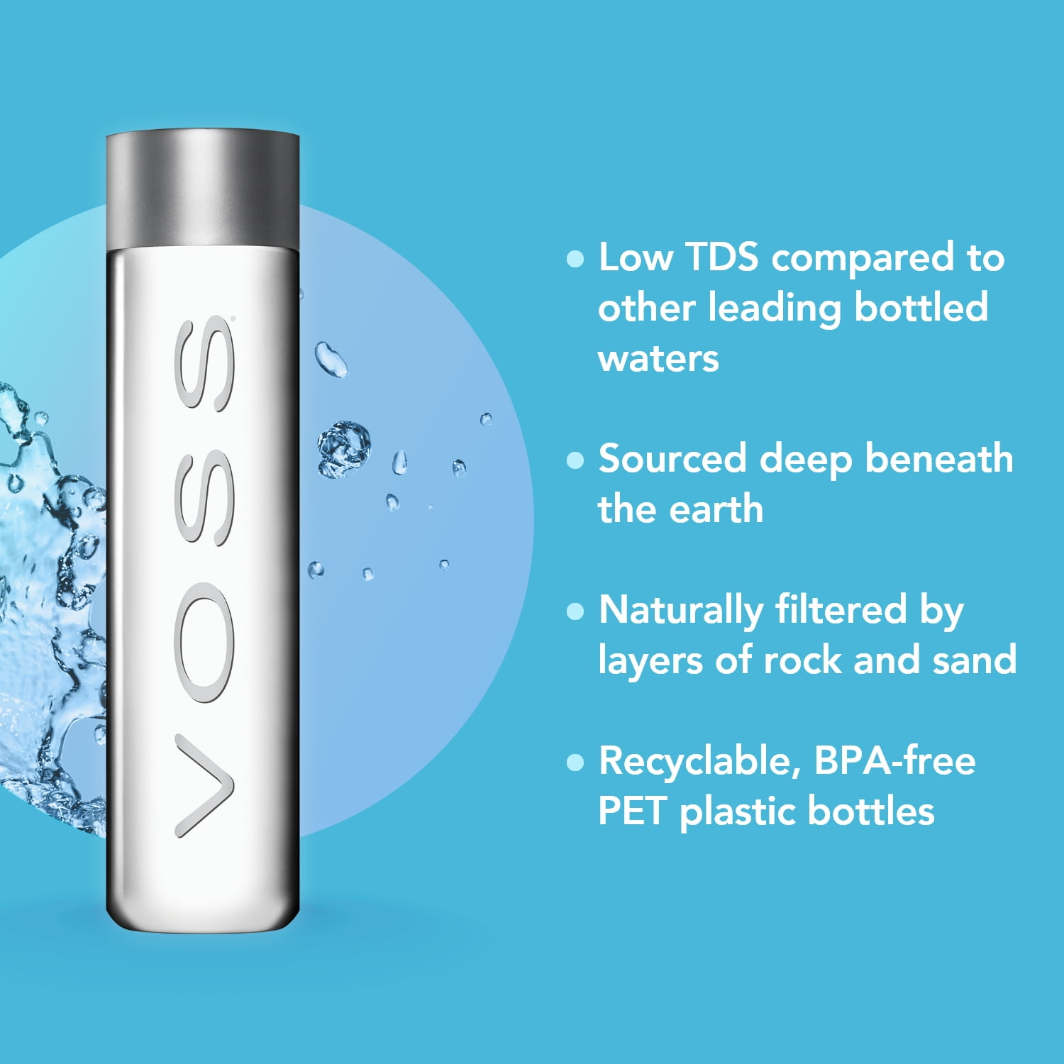 VOSS is a pure natural water from some of the best natural water sources on earth. Naturally pure for a crisp, refreshing taste, VOSS drinking water has a low mineral content. With less than 45 parts per million of total dissolved solids, VOSS is recognized as one of the world’s purest bottles of water. A crisp, clean taste, VOSS’ perfect hydration water is served on the tables of the most discerning consumers, in the rooms of the top hotels, and at the finest restaurants. VOSS plastic bottles have been designed for those on-the-go. Made with high-grade pet, the BPA-free plastic bottles retain all the elegance of classic glass VOSS Water bottles. Light and easy to grab-and-go for hydration at the gym, commuting or in the office, the plastic water bottle design allows you to enjoy the fresh taste of VOSS Premium water anytime, anywhere – even at the beach or poolside. The wide mouth water bottle is perfect for infusing your water with fresh fruit, to enhance your hydration. VOSS is pure water from pure sources, delivered in an iconic recyclable bottle.