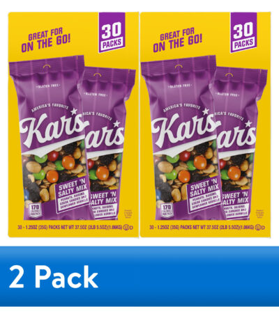 Double up on on-the-go convenience with Kar’s Gluten-Free Sweet ’n Salty Trail Mix in a value two-pack. Each box contains 30 single-serve 1.25 oz bags featuring a classic blend of roasted peanuts, plump raisins, crunchy sunflower kernels, and cocoa candies for the sweet-meets-salty bite fans love. Perfect for lunch boxes, team snacks, office drawers, road trips, and party bowls, these portioned treat bags make it easy to share or control servings. Stock the pantry with 60 total bags across two boxes for dependable snacks that travel well and satisfy cravings anytime. Contains Milk, Peanuts and Soy. May Contain Tree Nuts. Partially Produced with Genetic Engineering. Gluten-Free.