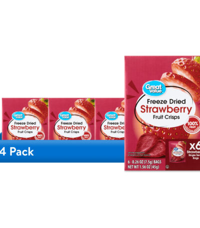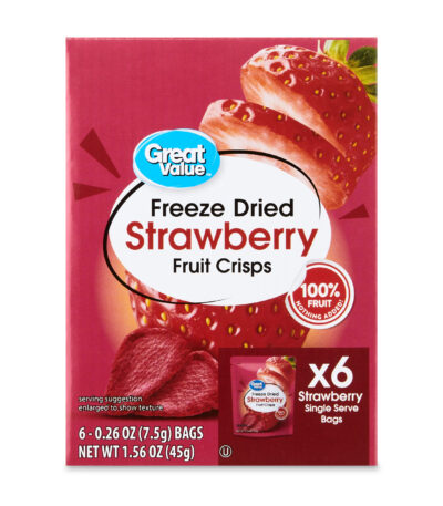 Whenever you’re on the go, pack a smart snack with Great Value Freeze Dried Strawberry Fruit Crisps. Each box contains six individual bags of crispy, freeze-dried strawberries. These fruit crisps are made from only strawberries, so you can be sure you’re serving the very best to your family. These freeze-dried strawberries make great additions to children’s lunches or treats for car trips. Sprinkle a handful onto your next bowl of cereal or yogurt for a nutritiously sweet topping. Great Value Freeze Dried Strawberry Fruit Crisps are simply delicious!
